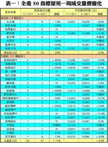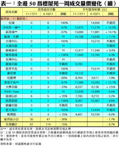 至於,九龍區21個指標屋苑上周共錄52宗成交,較前周的47宗增加11%,當中黃埔花園及新都城各自錄得5宗買賣,按周分別急增4倍;海濱南岸及維景灣畔分別錄得3宗及6宗交投,按周增幅各達2倍;海逸豪園成交量由前周的3宗,增加1.67倍至上周的8宗。此外,在全港50個指標屋苑之中,上周共有14個屋苑錄得「零成交」,較前周的9個增加56%,當中港島區及新界區各佔5個及6個屋苑,九龍區則佔3個(詳見表一)。