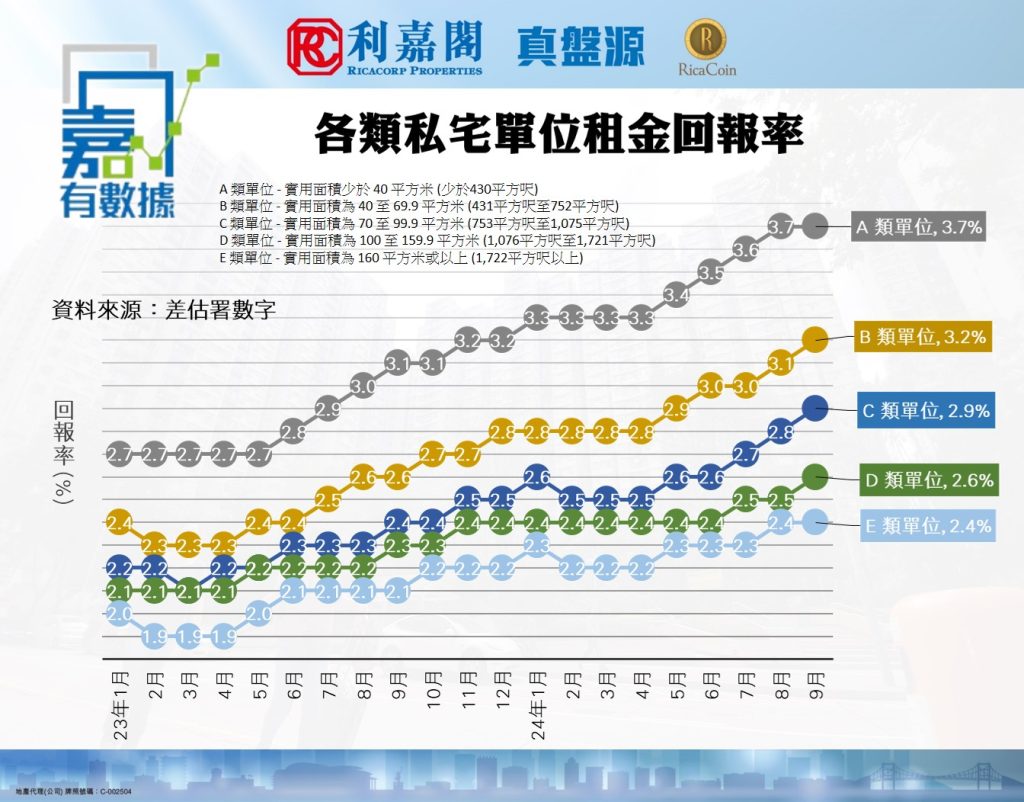 🎯 其中以實用面積約430平方呎以下A類細單位的回報率最高,9月份企穩在3.7厘,較2023年同期的3.1厘累升了0.6厘,創近12年半新高。