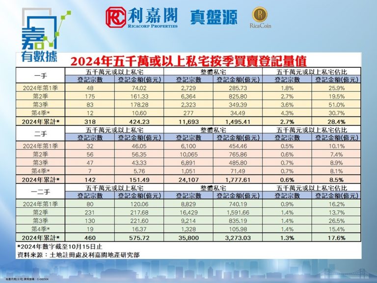 根據本行─利嘉閣地產資料研究部綜合土地註處的數據顯示,自今年2月底港府全面「撤辣」後,價值5,000萬元或以上的私人住宅買賣錄得明顯升勢,此勢頭推動第2季的一手及二手買賣合共錄得231宗,涉及登記金額達217.7億港元。直到第3季,一、二手私宅成交登記金額再增至221.6億港元,拉升期內私宅佔比超過20%,達到26.5%。