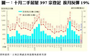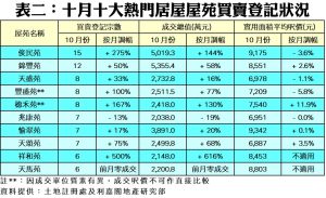 如按屋苑細分(見表二),十月份何文田俊民苑錄15宗買賣登記,按月攀升2.75倍或11宗,躍登上月居屋屋苑登記量榜首,成交總值約5,019.3萬元;而馬鞍山錦豐苑則以12宗登記屈居亞軍,涉資約5,355.4萬元。