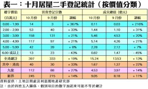 按樓價作分析(見表一),6個價格組別交投量錄五升一跌,其中升幅最大的是價值200萬以內組別,十月份二手居屋登記宗數為14宗,按月激增3.67倍或11宗;至於登記量最活躍的300萬至400萬元以內組別則錄158宗,較九月份的131宗增加21%。如以地區劃分,港島區十月份錄40宗登記,按月上升33%;九龍區期內錄112宗,按月增加27%;而新界區則錄245宗,按月亦有14%增長。