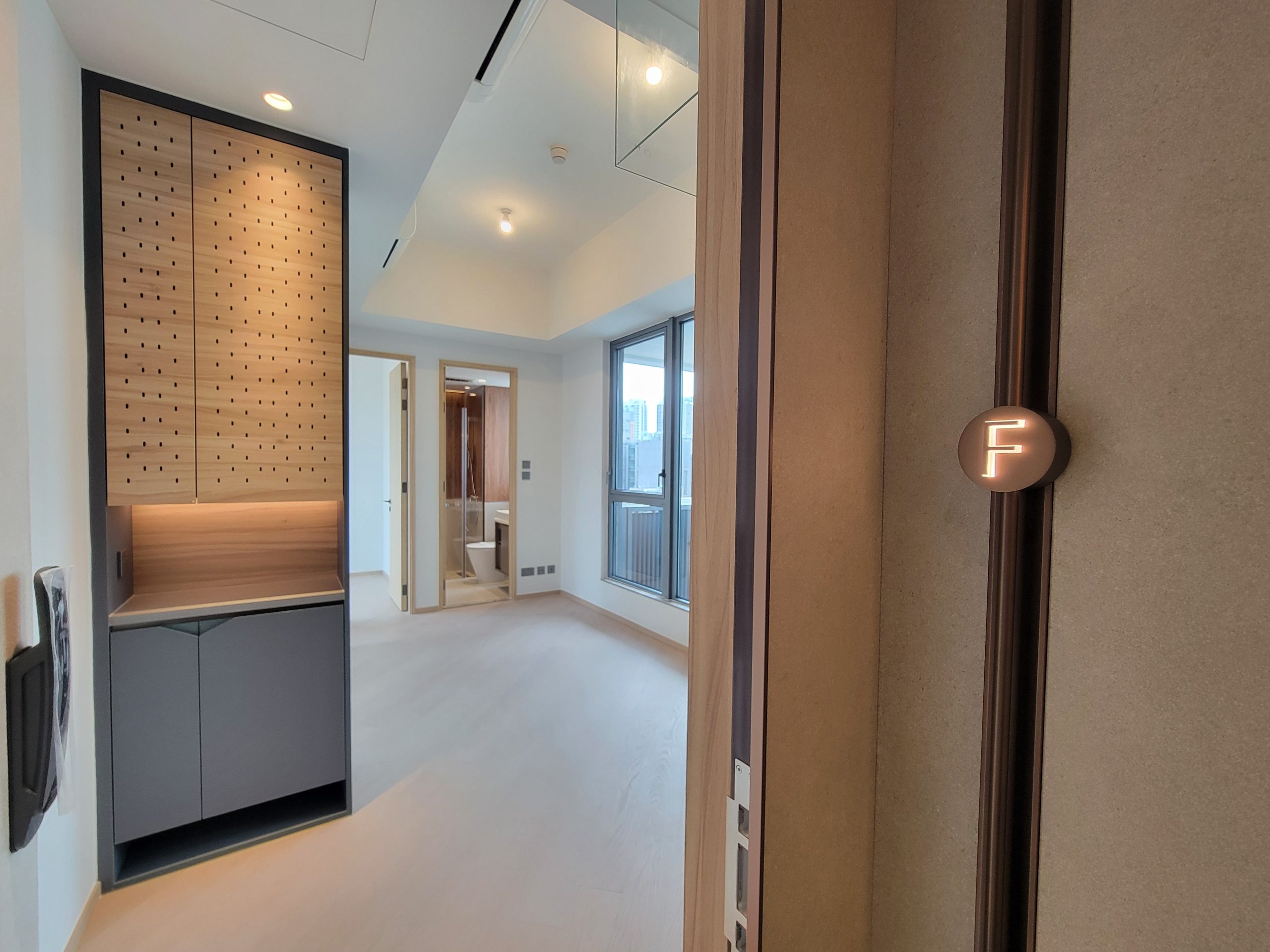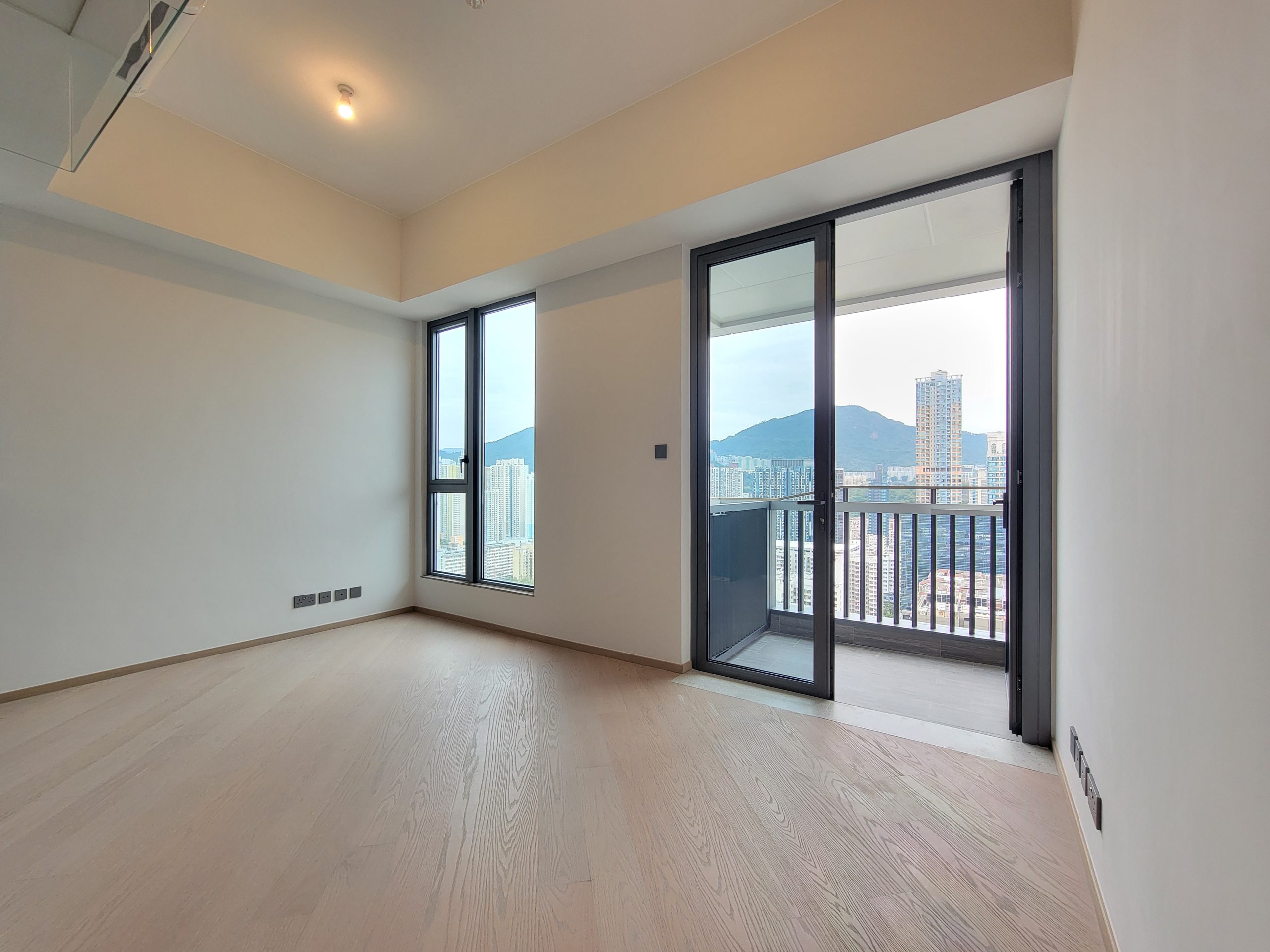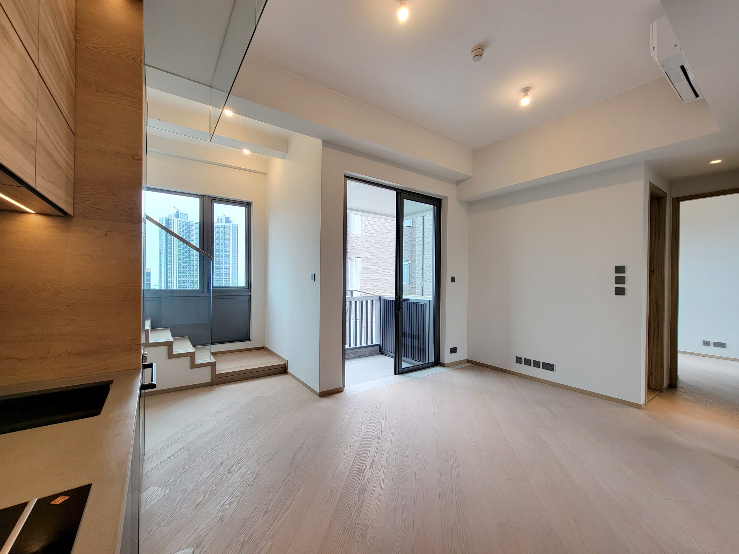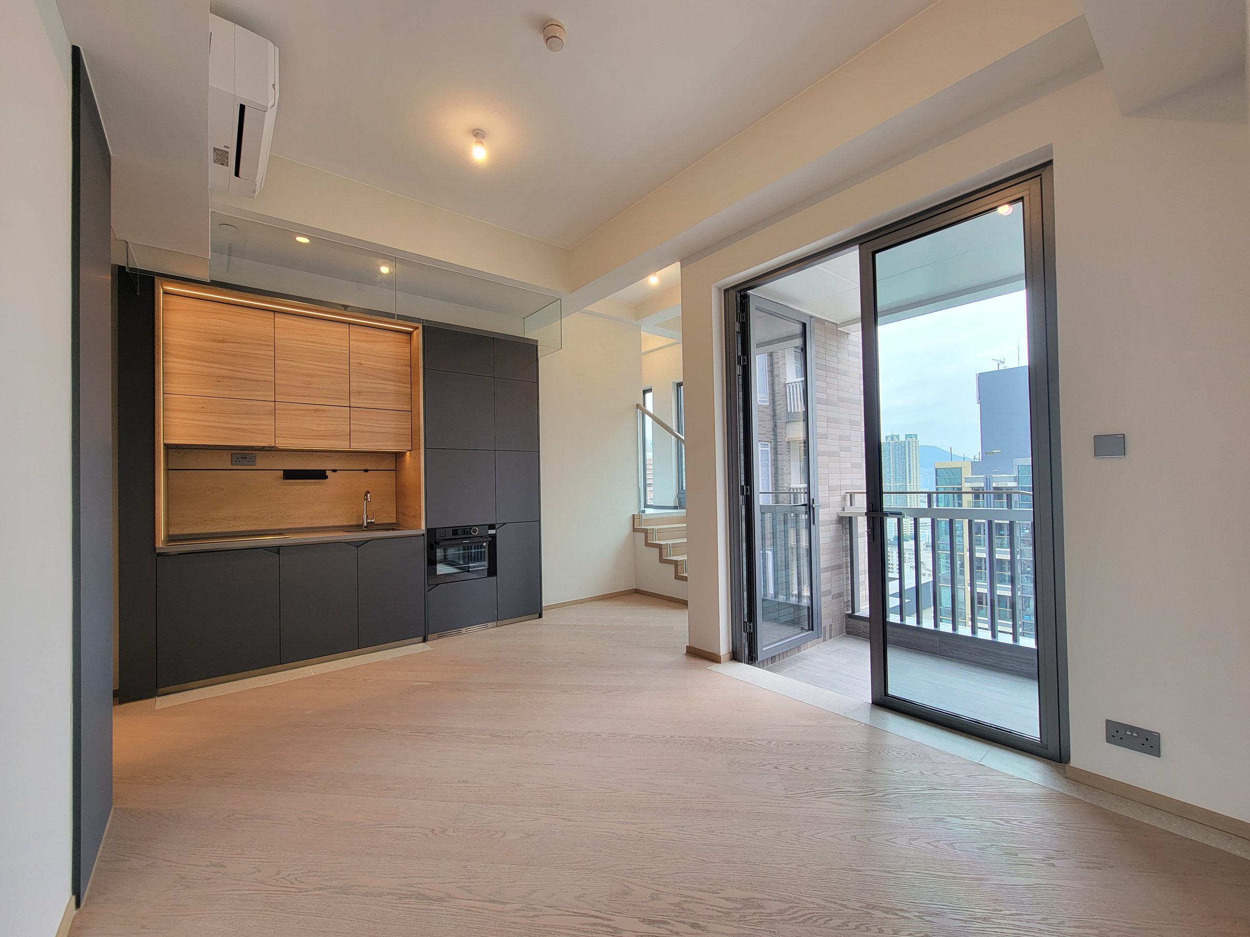 27樓F室採一房間隔,實用面積439方呎,層與層之間高3.5米,單位門口玄關配備高身貯物櫃。客飯廳長約4.8米,闊約2.4米,間隔分明,傢俱佈局靈活多變,客飯廳連接38方呎露台連工作平台,可從客廳直接眺望維港海景。