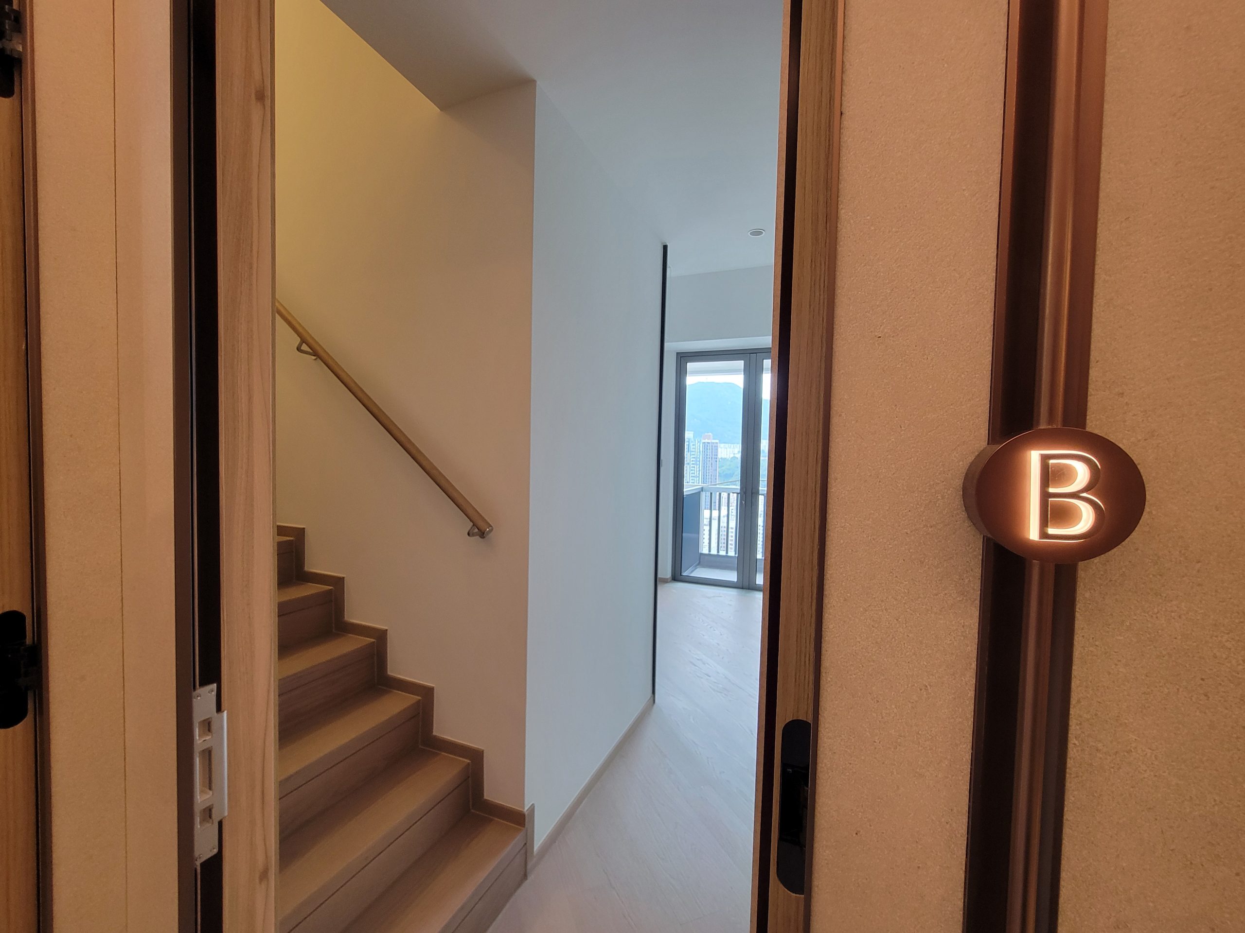 27樓及28樓B室複式兩房,實用面積525方呎,層與層之間高3.5米。客飯廳與寢區各佔一層,動靜分明,私隱度更高。客飯廳長約4.5米、闊約3.1米,採橫廳設計,提高空間使用靈活性。露台連工作平台面積38方呎,採雙門設計,開放式廚房收納空間充足。