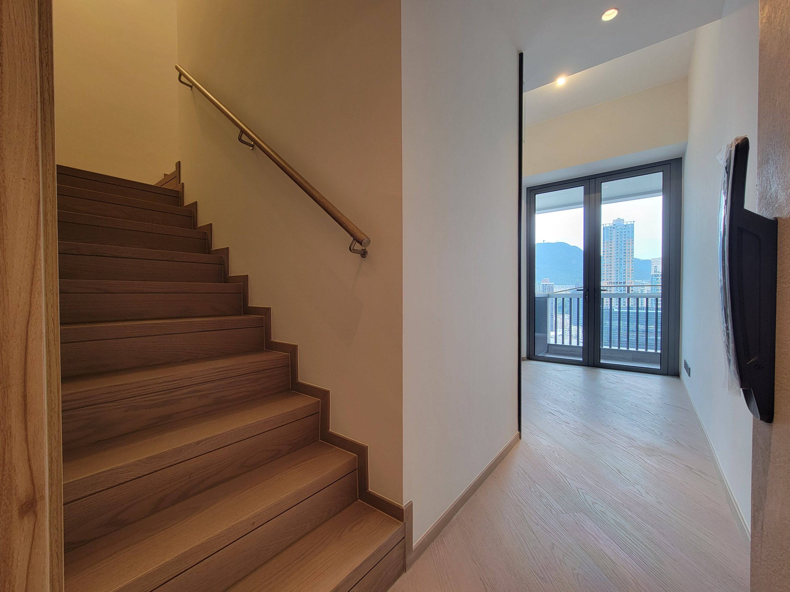 開放式廚房收納空間充足,採用優雅Vert Cypress墨綠色系廚櫃門,設計時尚別緻。浴室採明廁設計,乾濕分離且功能分隔,方便多人家庭使用。主人房享有城景雙邊景致,視野廣闊開揚,單位內置私人樓梯連接天台戶外空間,樓梯轉角處設大面積玻璃窗,室外景色映入眼簾,空間更透亮,塑造一個休閒空間。近500呎天台空間寬敞,輕鬆創造一個舒適的戶外空間,與親友共樂。