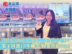 據悉,原業主於2011年以約366萬元購入單位,持貨至今轉售,帳面獲利約264萬元,期內物業升值約72%。