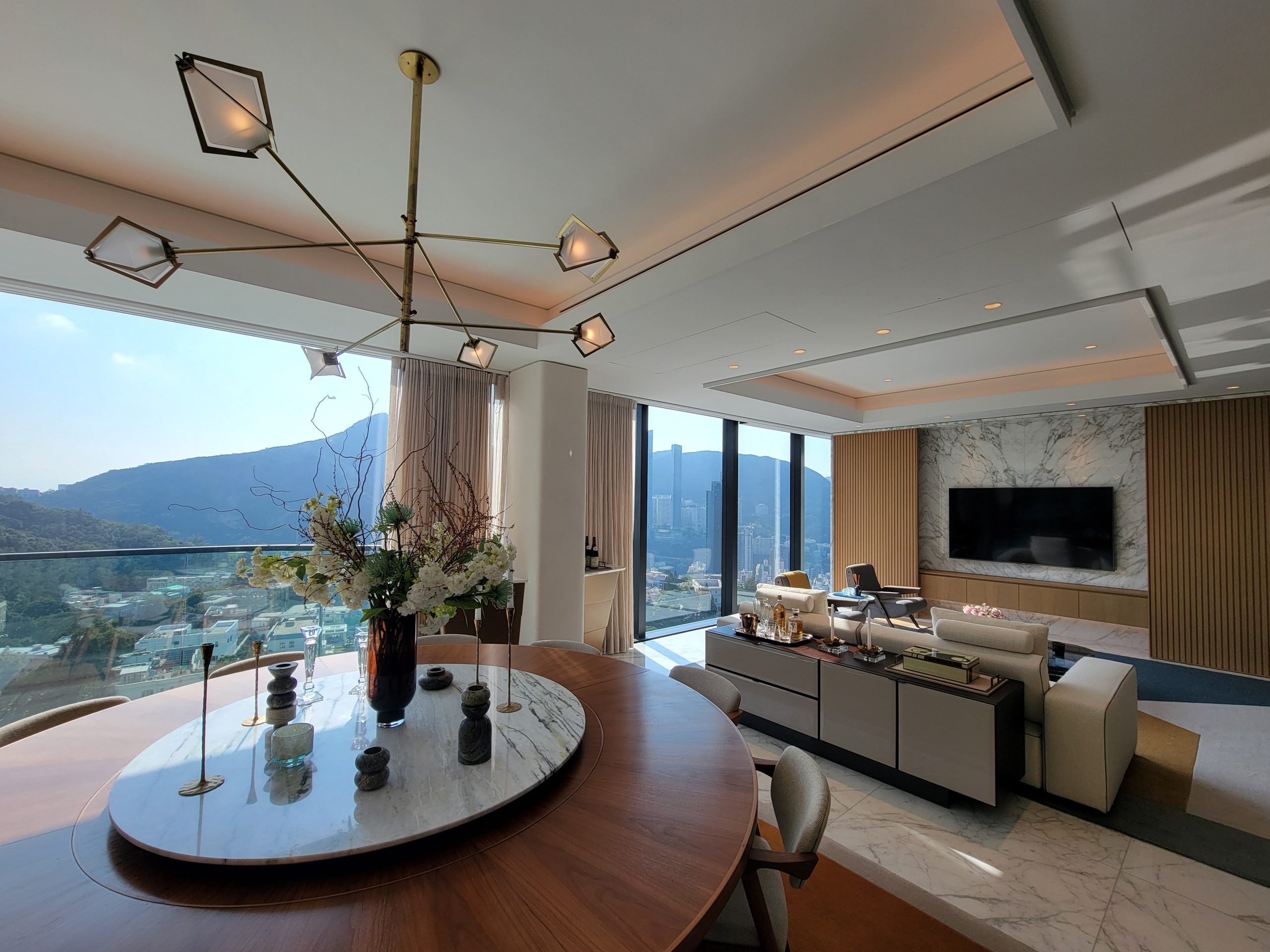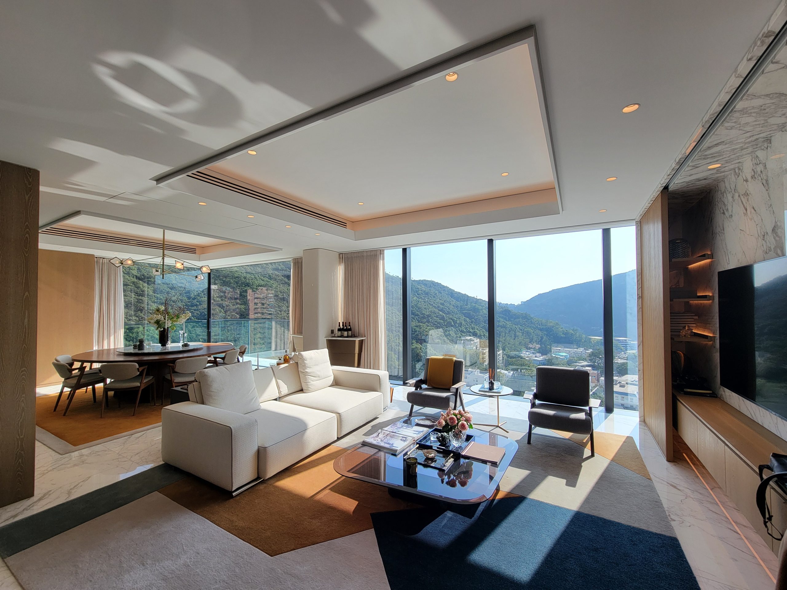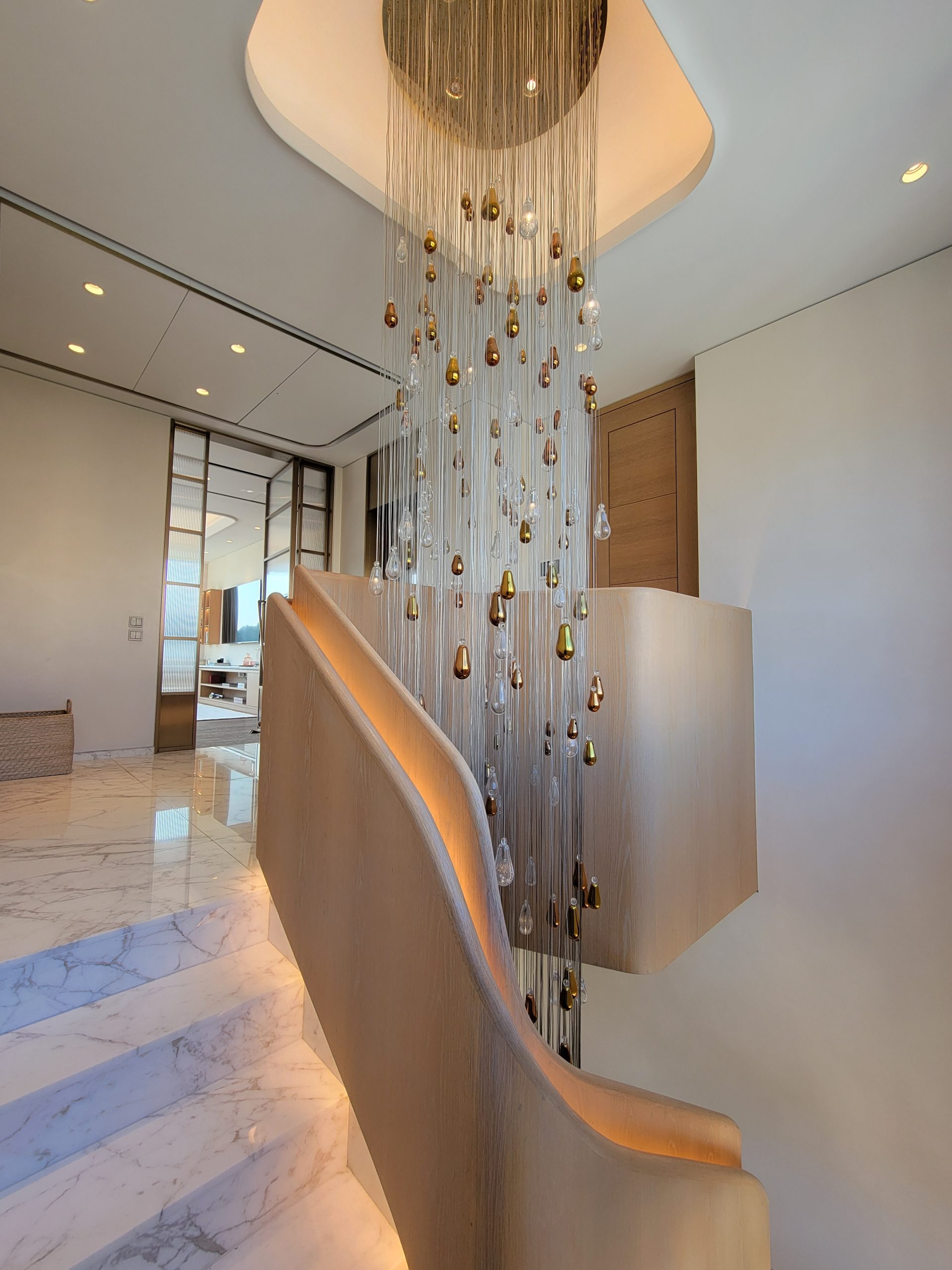 設計師利用英國品牌element 7橡木紋地板打造全屋木地板,配襯一大幅凹凸有序的木飾面牆及意大利雲石牆身,打通整個室內空間;同層的另一側為影音房,放置了意大利品牌Meridiani翠綠色絲絨沙發,與窗外翠綠山巒互相呼應,搭配淺灰色彩不規則條子圖案地毯。單位附設私人升降機連接室內三層,除此之外,單位由旋轉樓梯貫通上下三層,樓梯全由意大利雲石鋪砌,配合實木扶手和流線造型,加上貫穿三層中空的水滴型玻璃吊燈,由人手裝上超過600粒手工吹製玻璃。