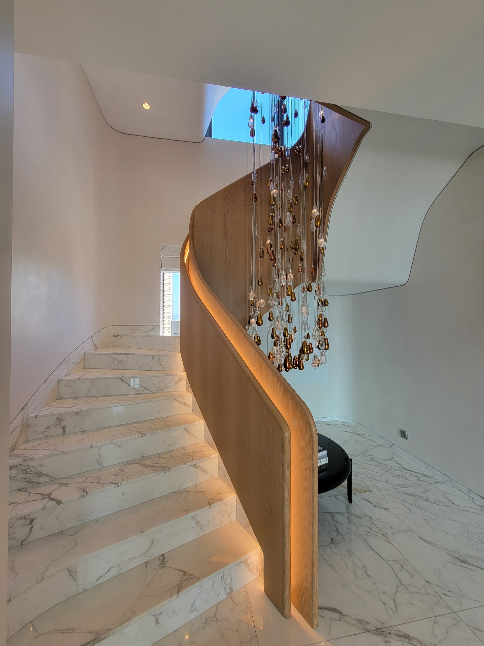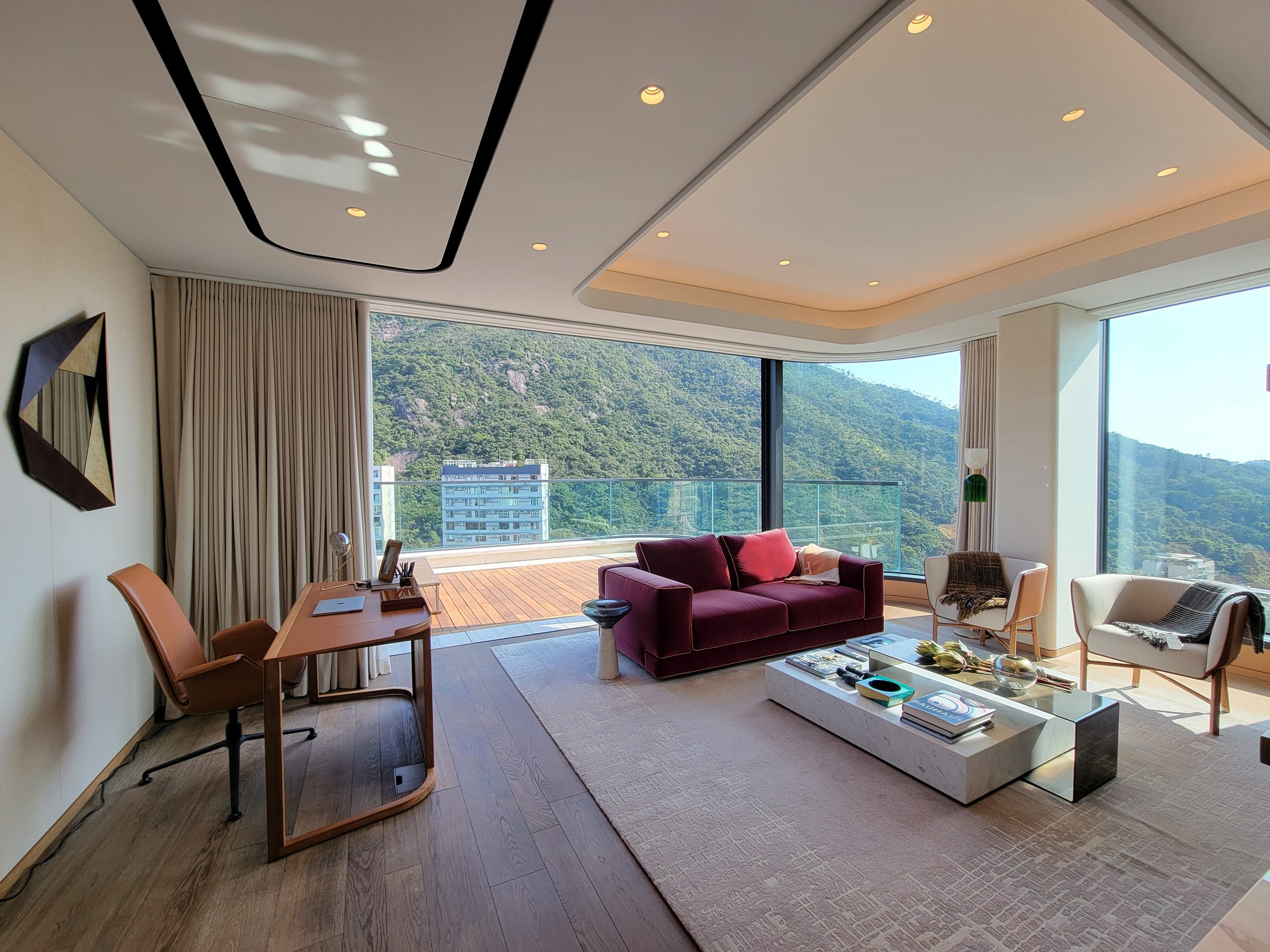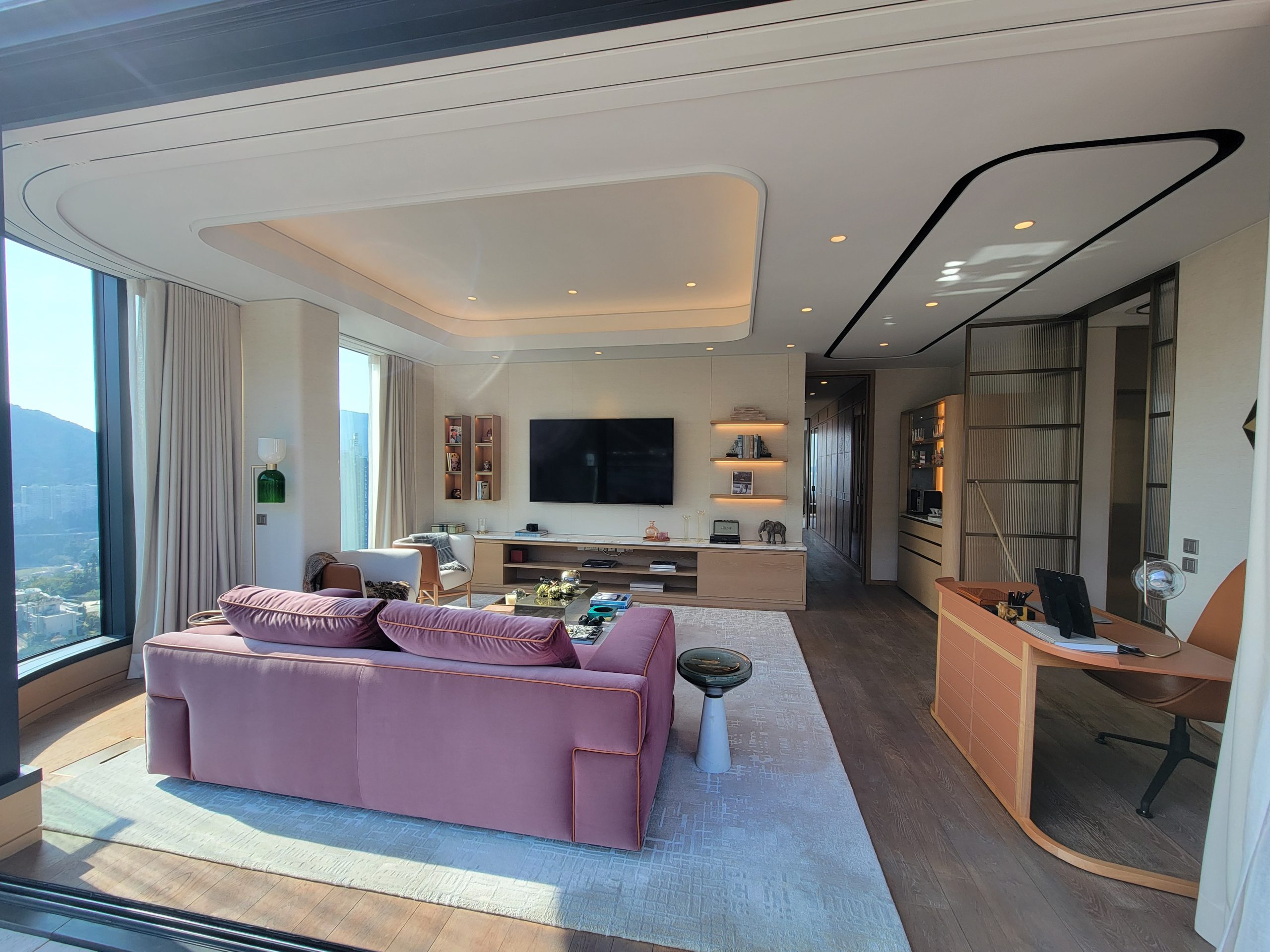 設計師利用英國品牌element 7橡木紋地板打造全屋木地板,配襯一大幅凹凸有序的木飾面牆及意大利雲石牆身,打通整個室內空間;同層的另一側為影音房,放置了意大利品牌Meridiani翠綠色絲絨沙發,與窗外翠綠山巒互相呼應,搭配淺灰色彩不規則條子圖案地毯。單位附設私人升降機連接室內三層,除此之外,單位由旋轉樓梯貫通上下三層,樓梯全由意大利雲石鋪砌,配合實木扶手和流線造型,加上貫穿三層中空的水滴型玻璃吊燈,由人手裝上超過600粒手工吹製玻璃。
