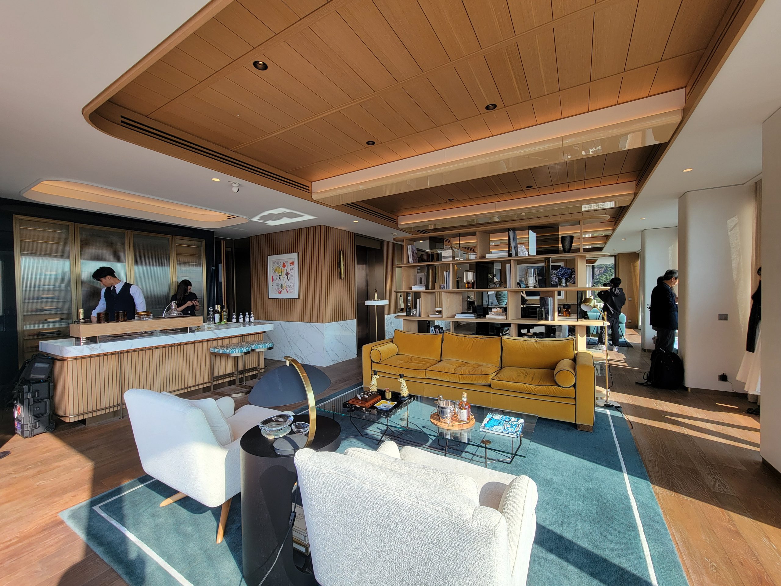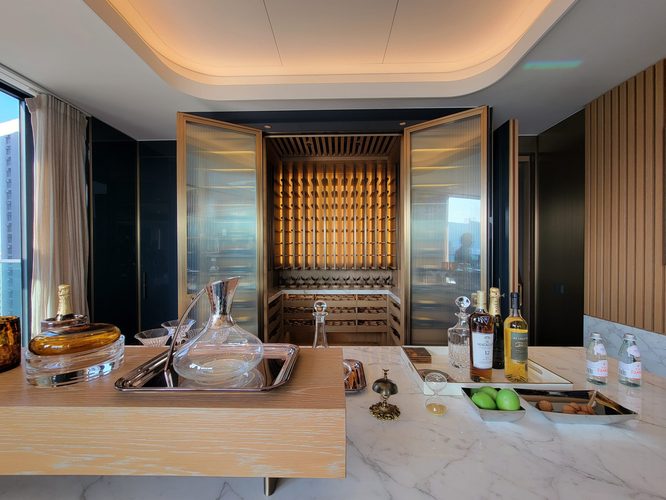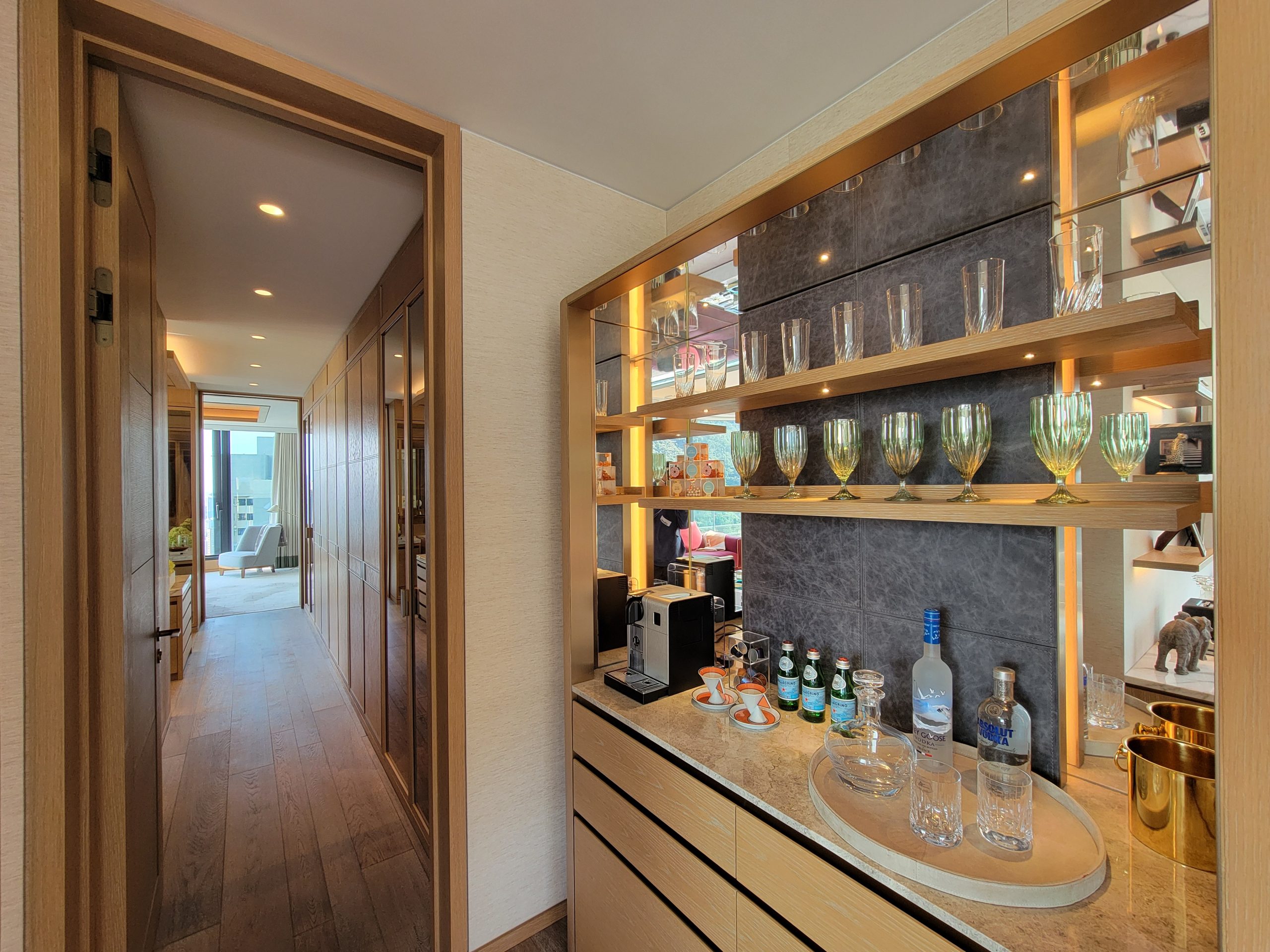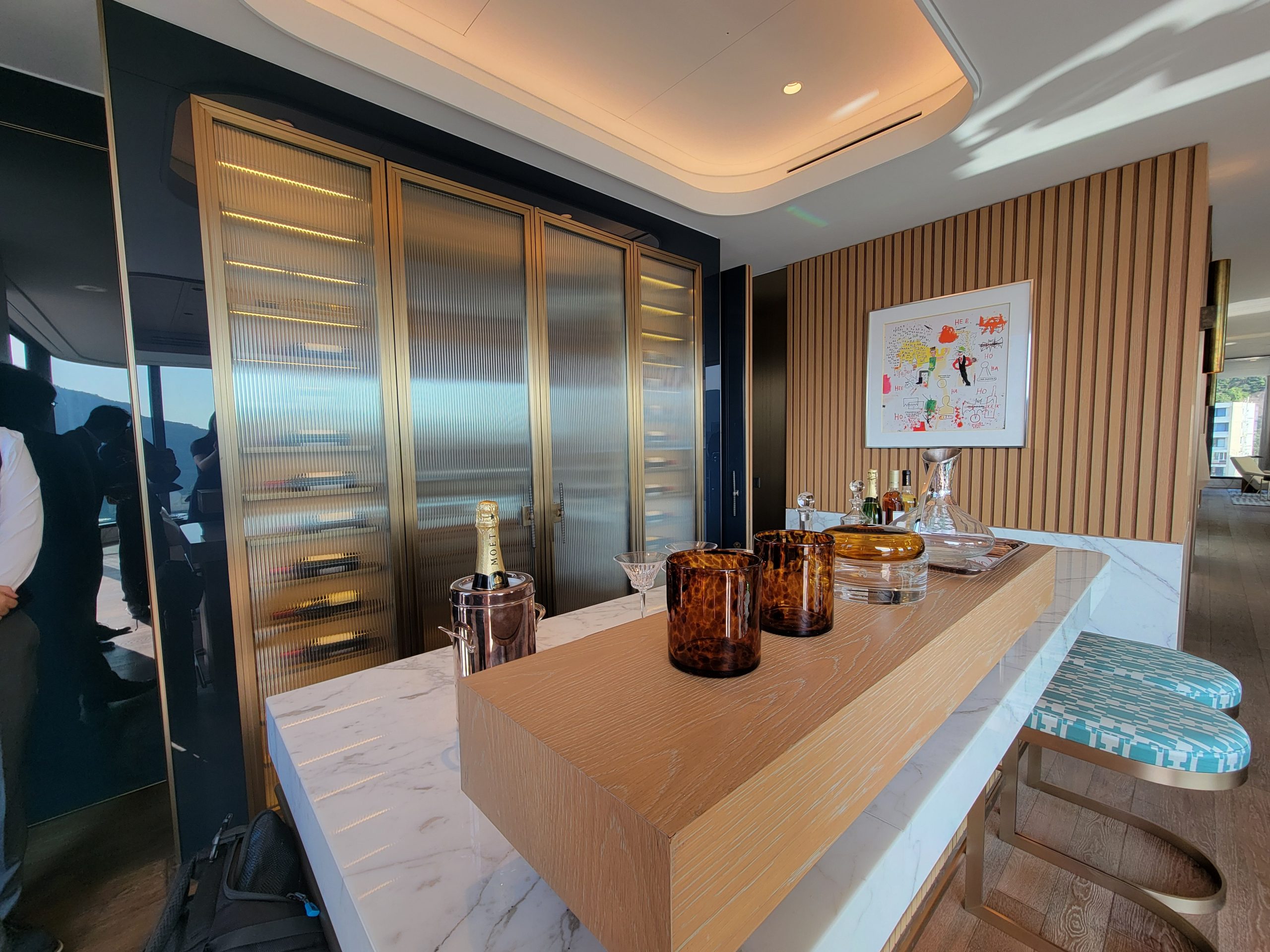 音樂廳旁為品酒區,設有靠牆酒櫃,設計師在一旁的偏廳採用英國品牌Linley芥末黃色絲絨沙發;與品酒區相連的平台配置遊艇柚木地板,猶如遊艇的室外甲板,並放置了一套意大利品牌minotti半圓形沙發,以及意大利品牌B&B Italia戶外餐桌和餐椅;並備有遊艇專用的seasmart篷布,可遮太陽擋雨。住戶亦可打開一整排落地玻璃窗,連接平台和品酒區的室內外空間,仿如置身於遊艇甲板上舉行派對。