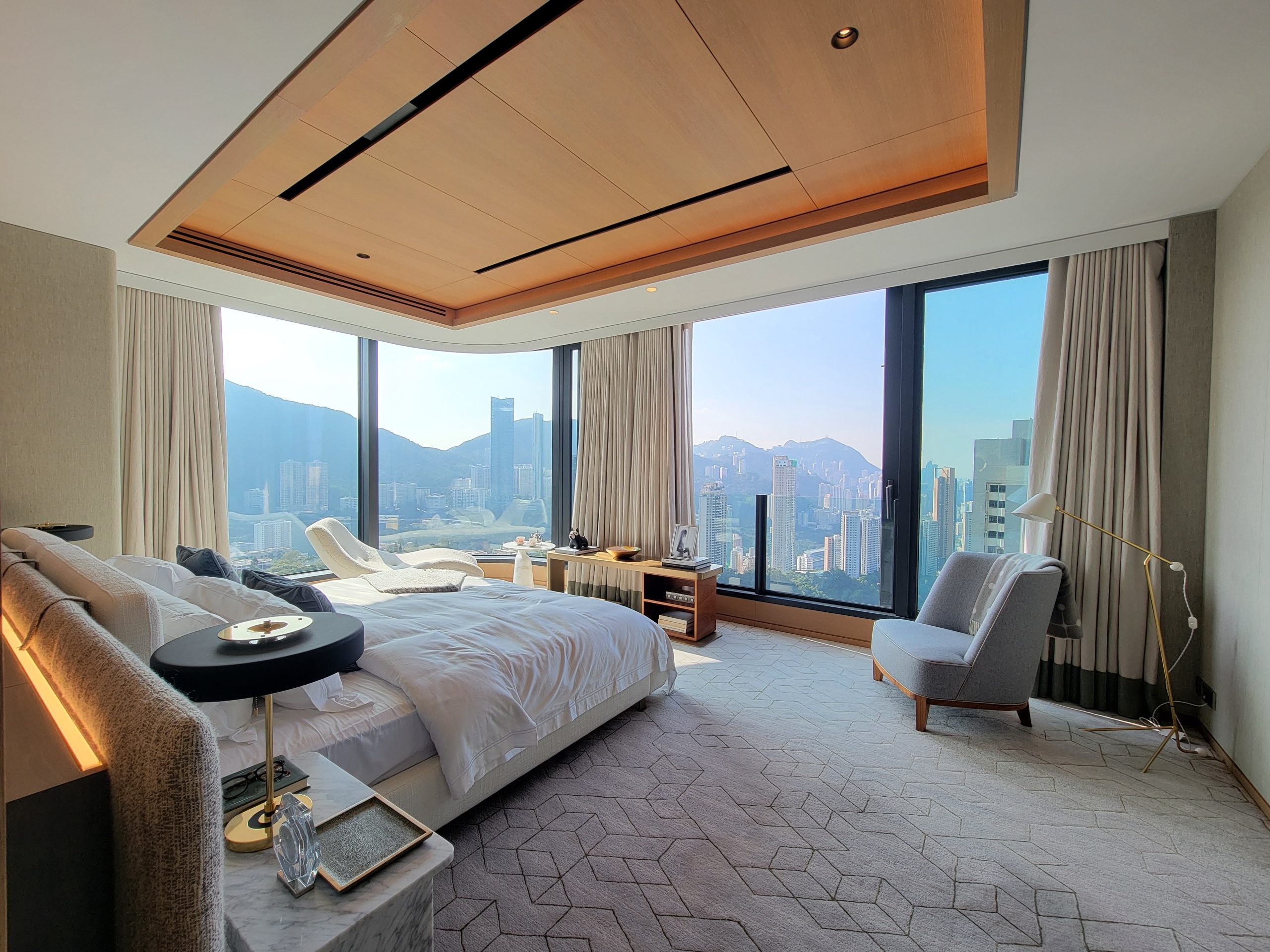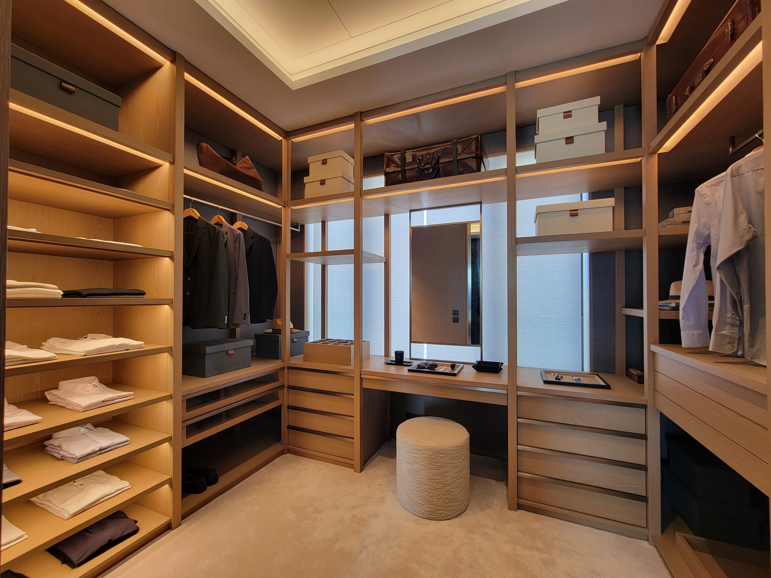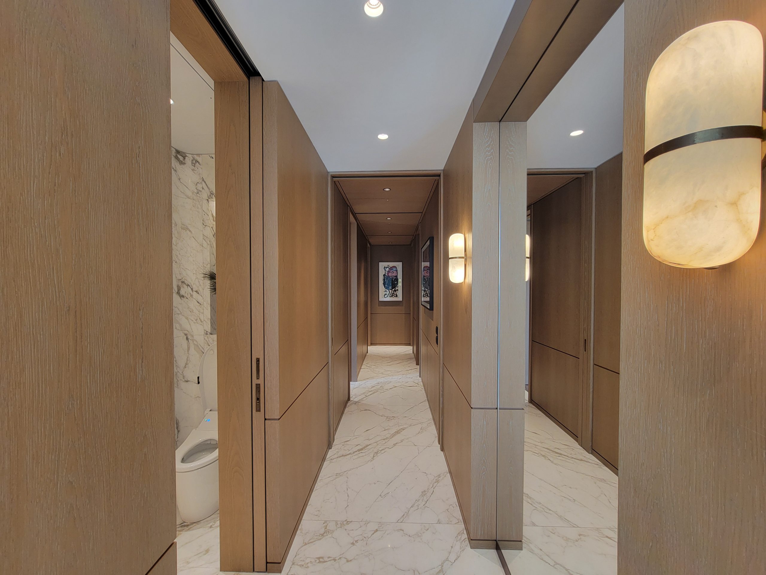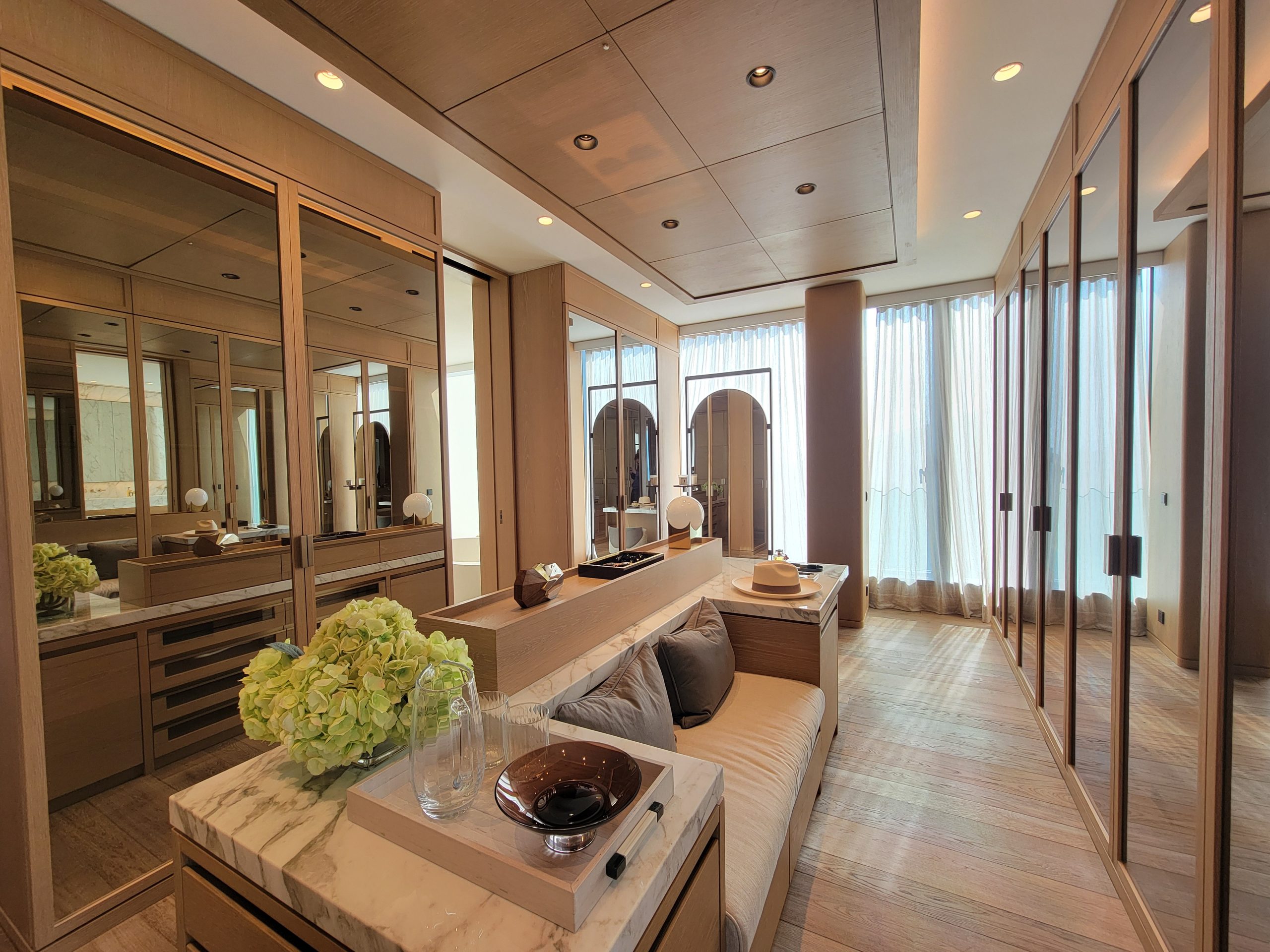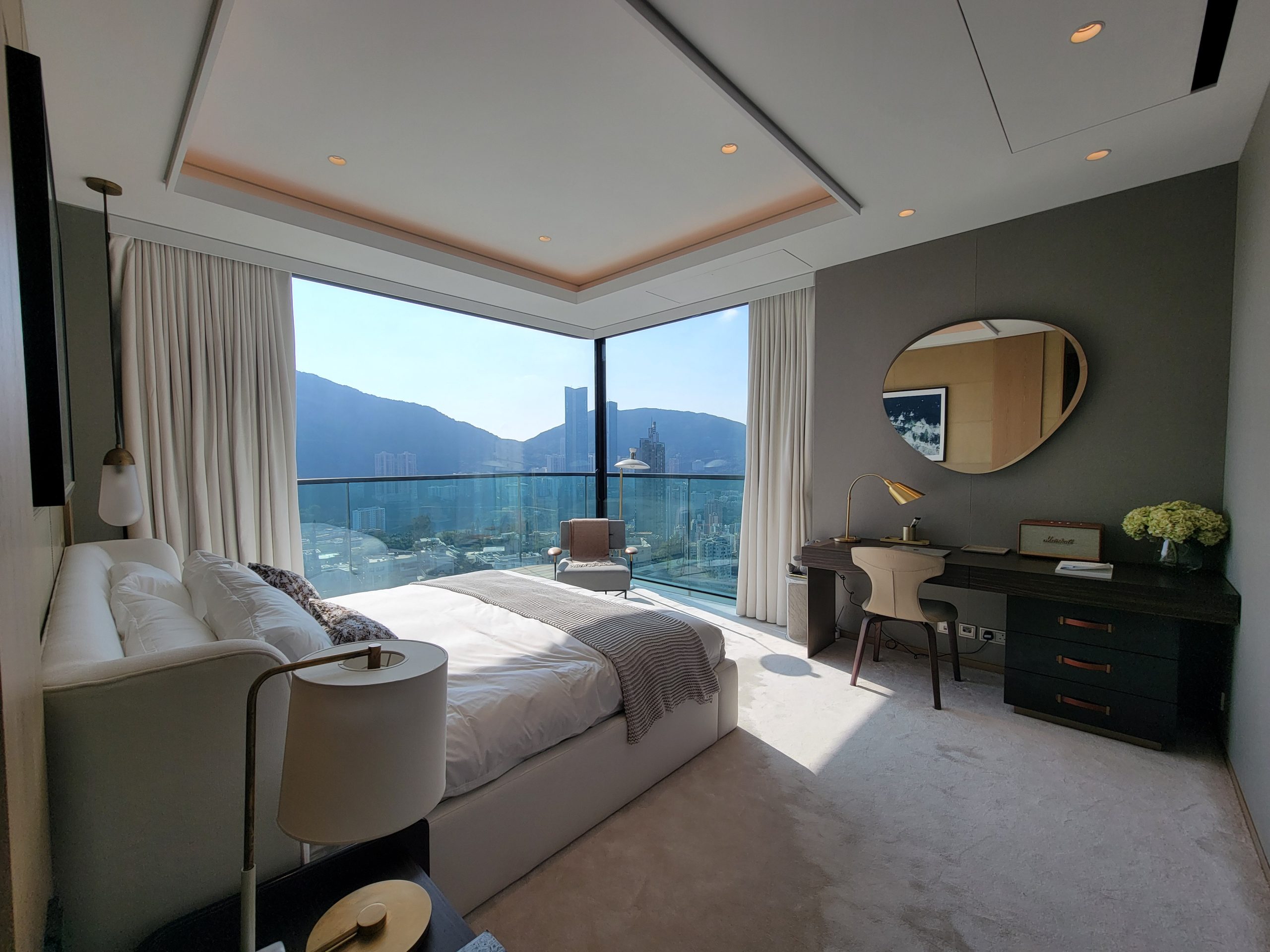 23樓全層為主人套房,設有一個偏廳並連接近500方呎的室外平台。主人睡房貫徹低調奢華的設計風格,地台滿鋪米色幾何圖案地毯,採用凹凸有序的木飾 面床背牆,配襯淺色的訂製大床和造型獨特的Craft Associates座椅。步入式衣帽間空間,配合橡木衣櫃,空間實用雅致,女主人浴室的地台、牆身和洗手盆均鋪上意大利雲石牆身,整體色調明亮,採光和空間感十足,衛浴設備採用澳洲衛浴品牌Apaiser鵝蛋形獨立式浴缸、美國衛浴品牌Kallista雙盆洗手台、淋浴花灑頭及其他衛浴設備,締造雅致現代的沐浴空間。近寢區的浴室屬於男主人的天地,採用深灰色主調,地台、牆身和洗手盆均鋪上土耳其石材,洗手盆及其他衛浴設備均採用Kallista衛浴設備,相連的衣帽空間雅致實用以木色為主。