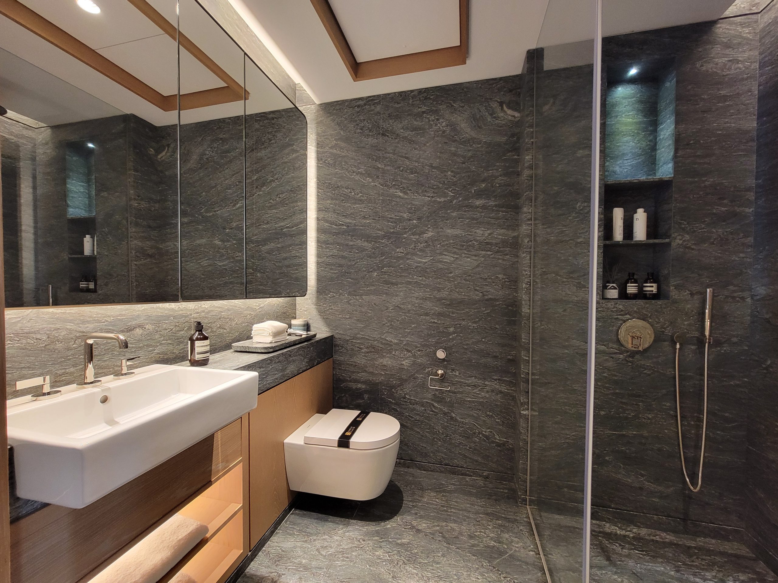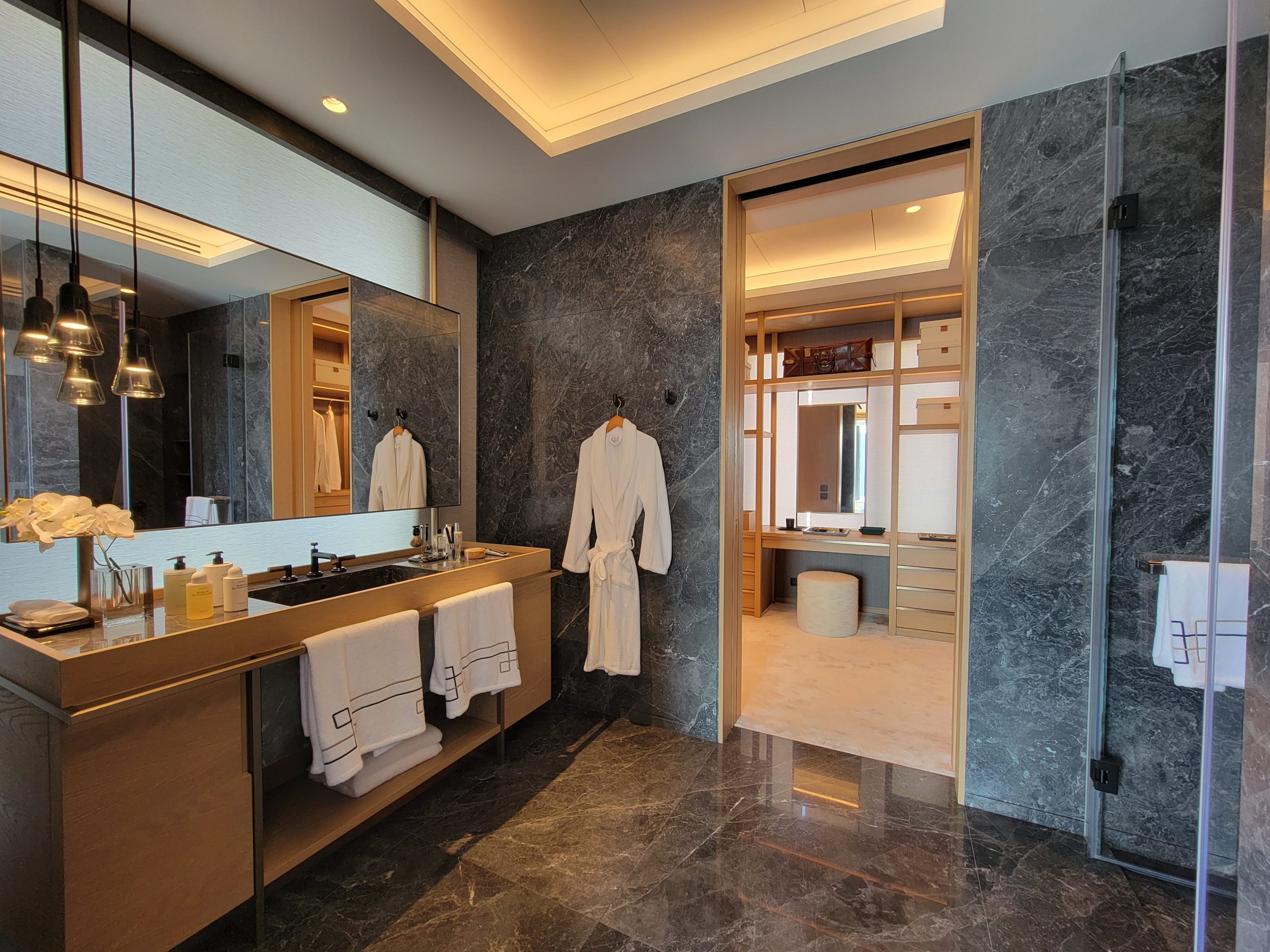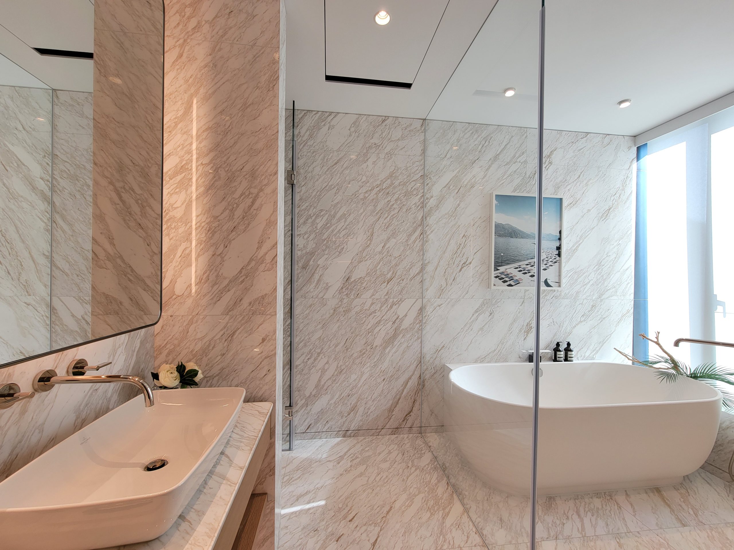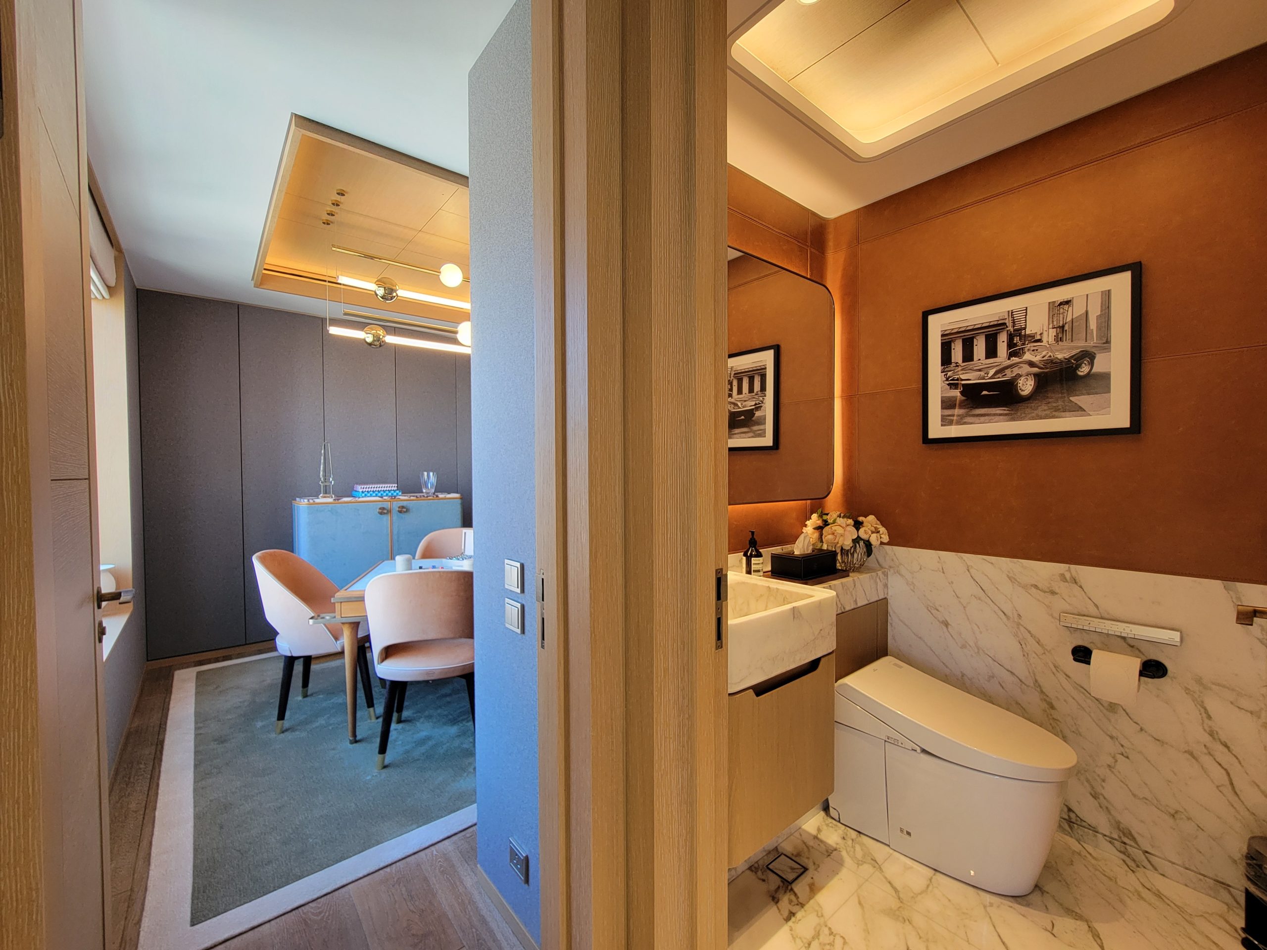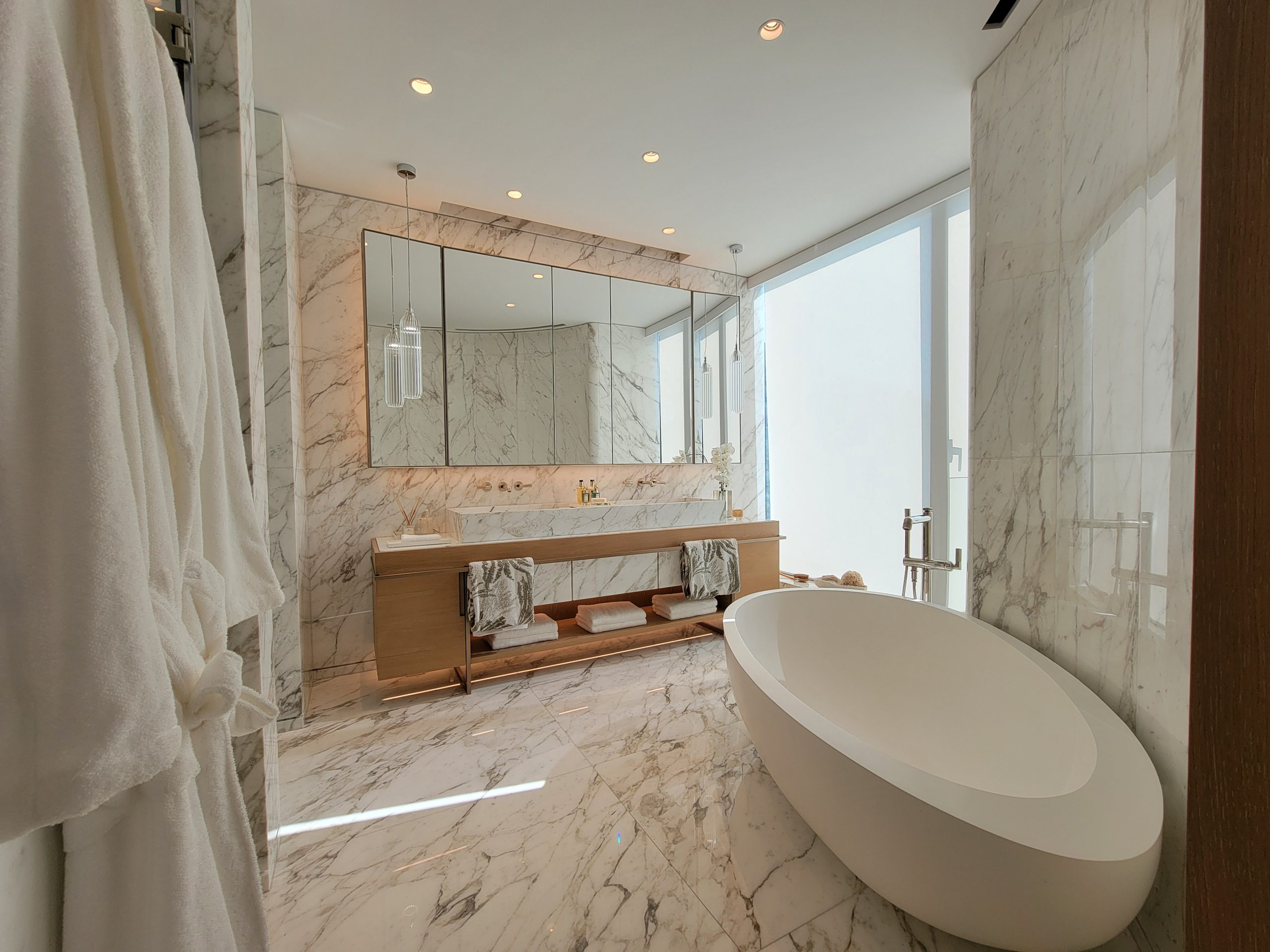 23樓全層為主人套房,設有一個偏廳並連接近500方呎的室外平台。主人睡房貫徹低調奢華的設計風格,地台滿鋪米色幾何圖案地毯,採用凹凸有序的木飾 面床背牆,配襯淺色的訂製大床和造型獨特的Craft Associates座椅。步入式衣帽間空間,配合橡木衣櫃,空間實用雅致,女主人浴室的地台、牆身和洗手盆均鋪上意大利雲石牆身,整體色調明亮,採光和空間感十足,衛浴設備採用澳洲衛浴品牌Apaiser鵝蛋形獨立式浴缸、美國衛浴品牌Kallista雙盆洗手台、淋浴花灑頭及其他衛浴設備,締造雅致現代的沐浴空間。近寢區的浴室屬於男主人的天地,採用深灰色主調,地台、牆身和洗手盆均鋪上土耳其石材,洗手盆及其他衛浴設備均採用Kallista衛浴設備,相連的衣帽空間雅致實用以木色為主。