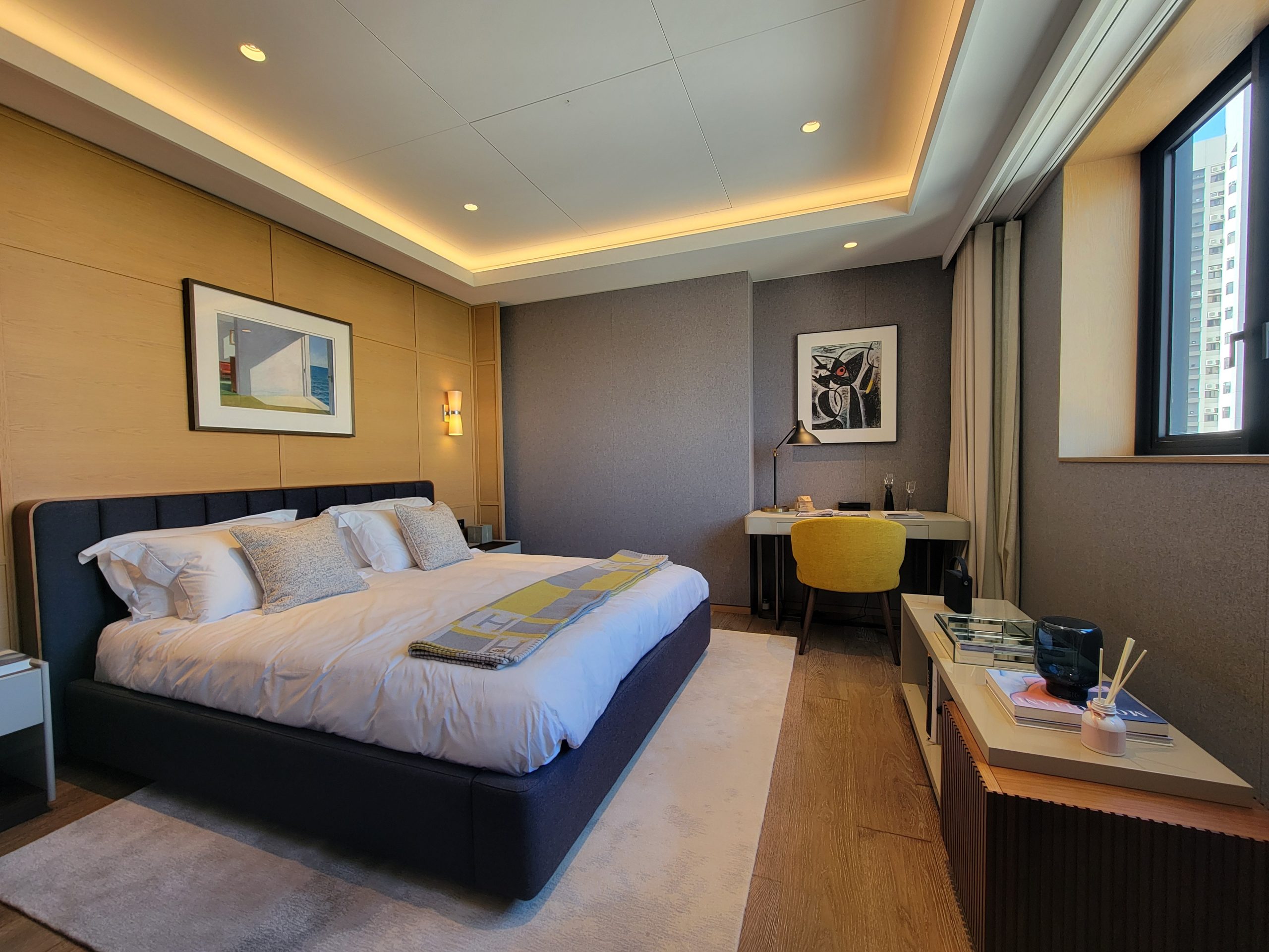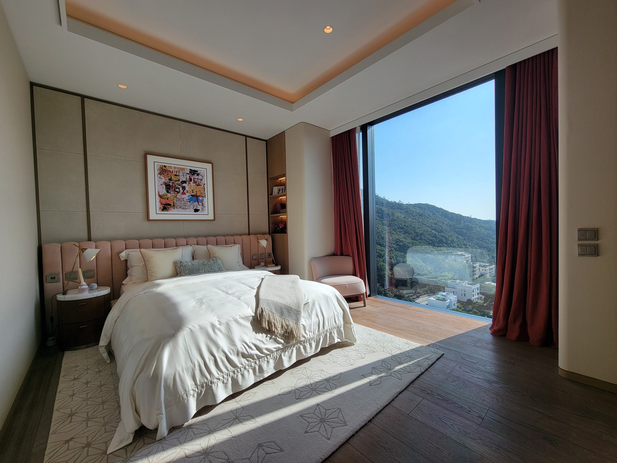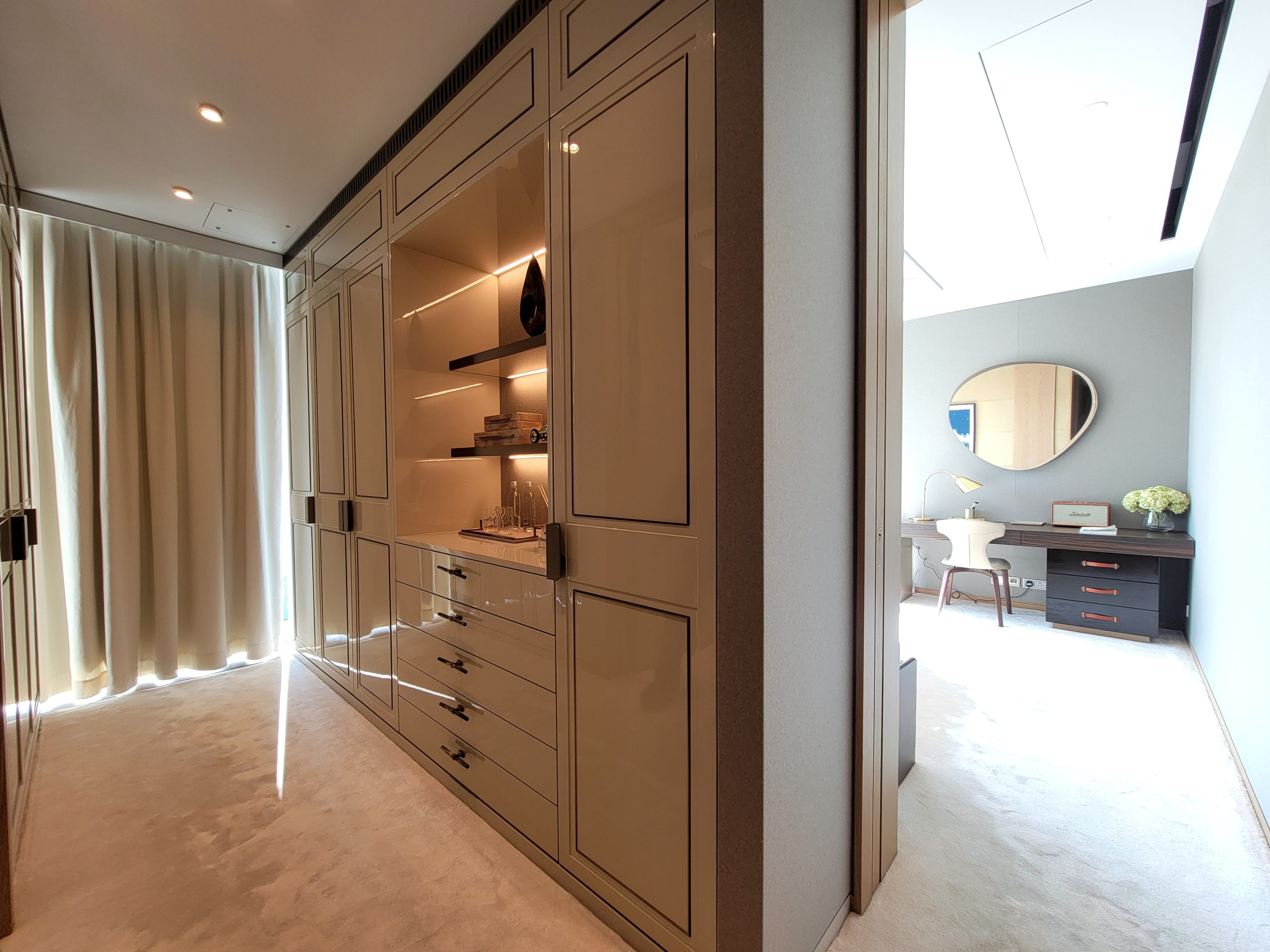 套房一設有露台和電動玻璃趟門,引景入室,通過一排高光灰色步入式衣帽間,來到寬敞的衛浴空間,地台和牆身均採用意大利石材,設鵝蛋形獨立式浴缸及雙盆洗手台,採光和空間感十足。至於套房二,色調較沉實,使用實木地板,同樣採用灰色絨毛牆紙和同色系傢具,配襯molteni&C床頭櫃,感覺優雅時尚;套房三則採用米色主調,米色捫布牆身,真皮縫紉式設計的米色床背牆,與一系列米色亮漆面衣櫃互相呼應,B&B Italia粉紅色座椅則與粉色睡床靠相映成趣。
