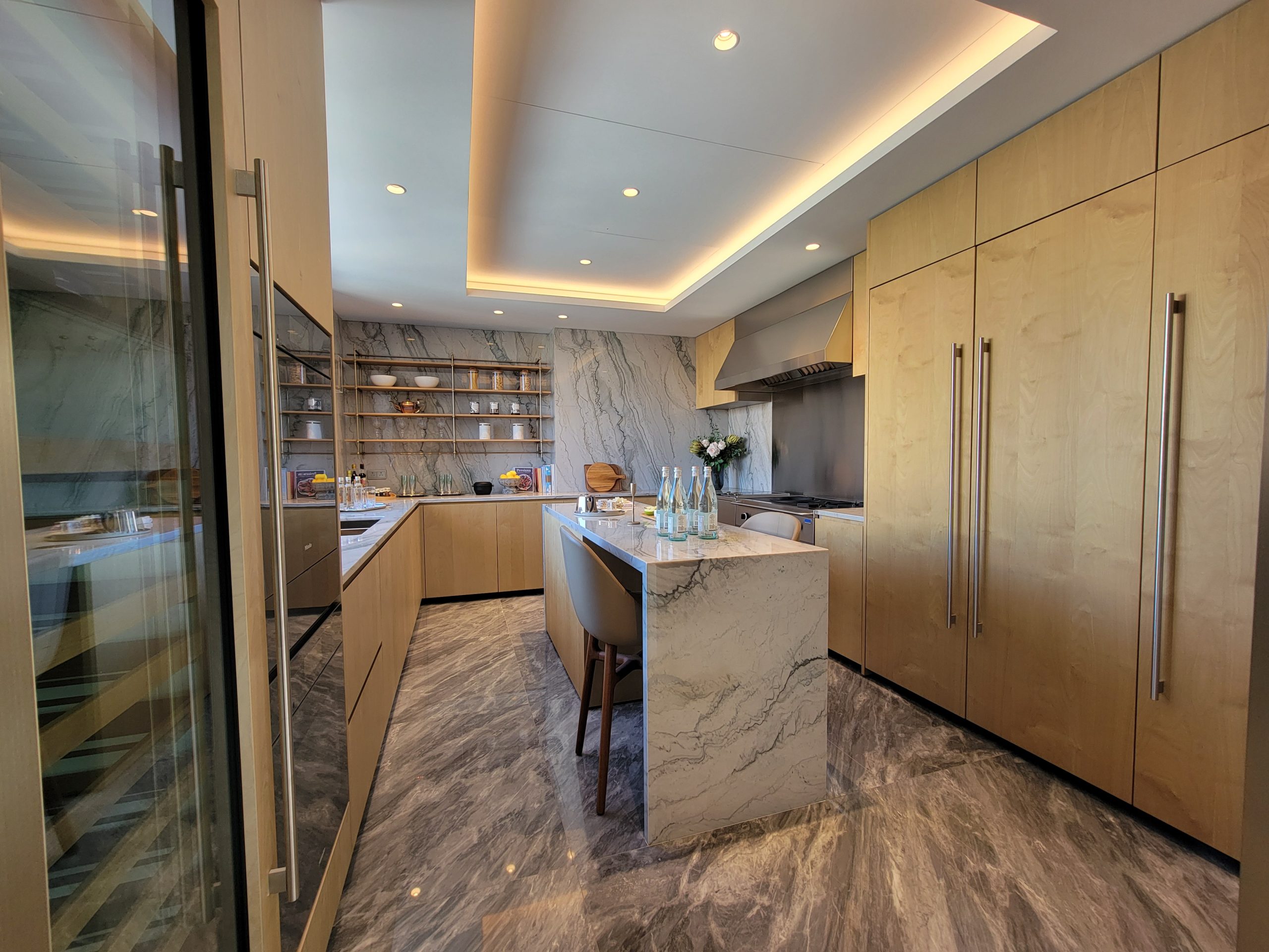 廚房地台採用意大利廚櫃品牌minotticucine廚櫃,廚櫃飾面和牆身採用意大利石材,配襯木紋門板,和諧自然。廚房電器一應俱全,備有Sub-Zero酒櫃、雙門雪櫃,並設有功能完善的中、西廚爐具,包括Miele氣體煮食爐、電磁爐、抽油煙機、焗爐、蒸焗爐、洗碗碟機、抽真空機及unico的中式炒爐;中島吧檯同樣採用意大利石面,偌大的空間讓戶主可以輕鬆下廚或安排到會上門,隨時隨地可以烹調中西式美食。