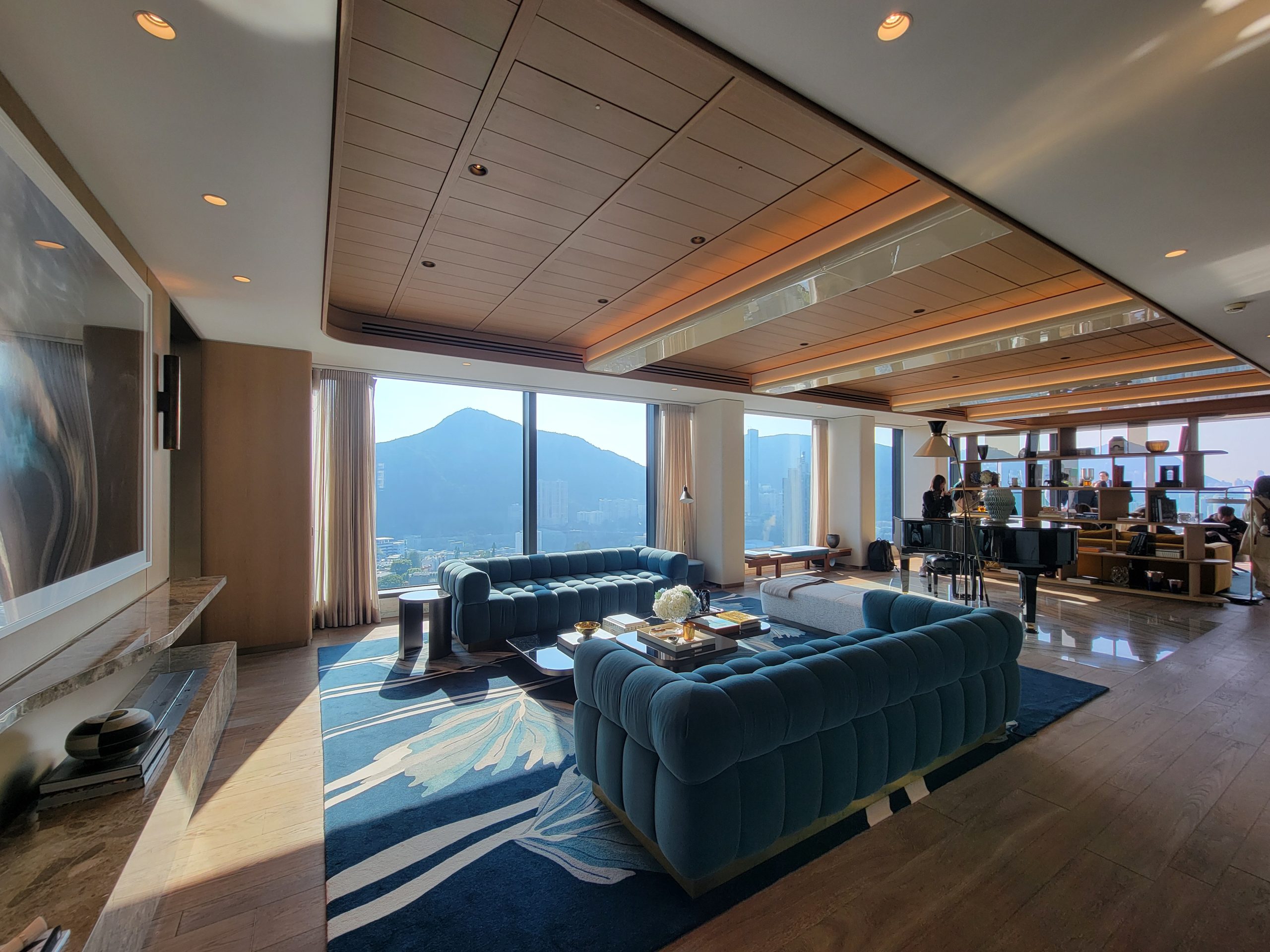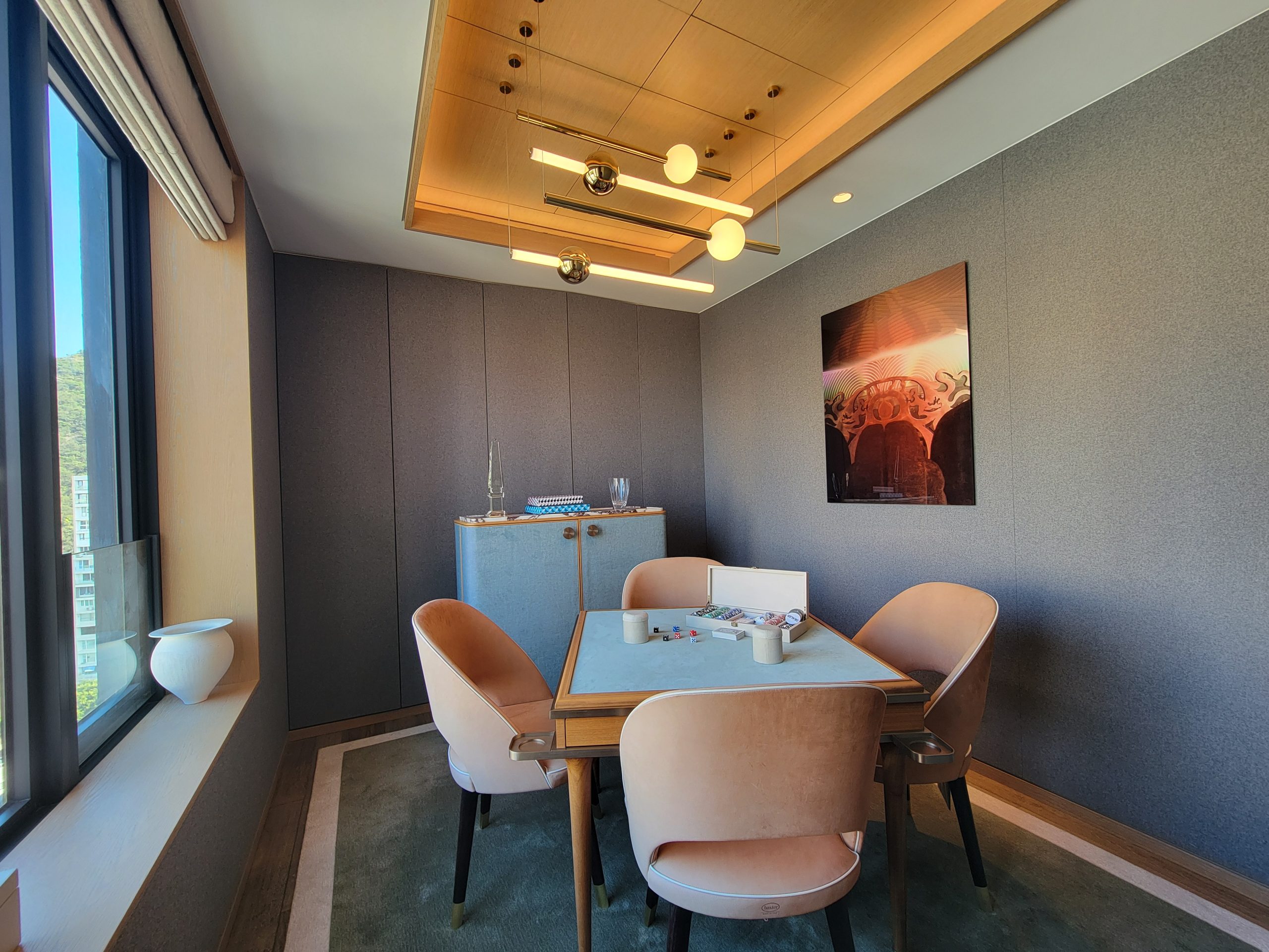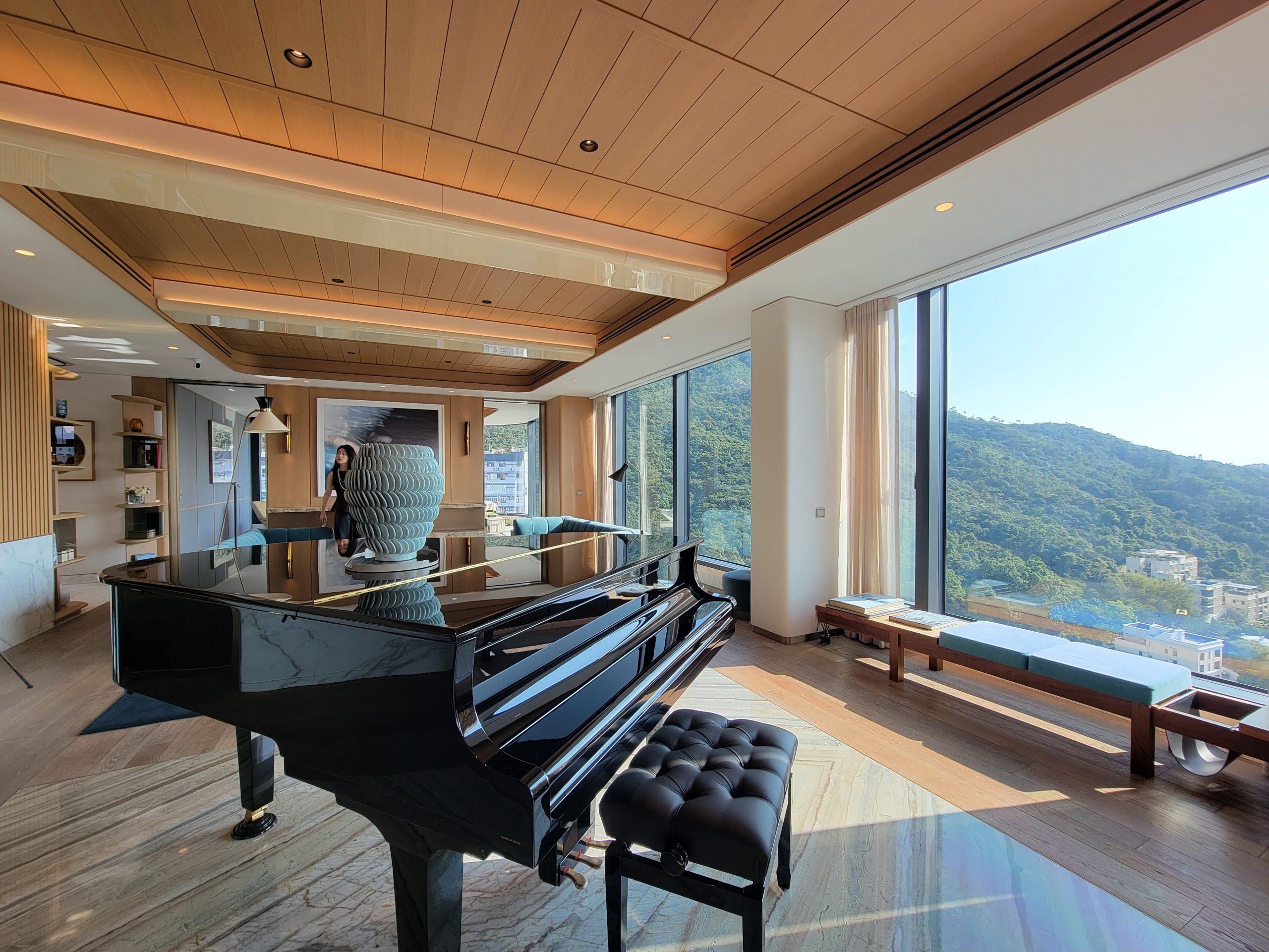 設計師選取米、啡兩色為主調,其中22樓的主甲板層,主要為娛樂空間,包括有音樂廳、品酒區、室外平台、影音房及遊戲室。玄關設計成偌大的音樂廳,一座三角琴即映入眼簾,毗連音樂廳的偏廳,放置了一組墨綠色絲絨沙發,並選用遊艇及私人飛機專用的太平品牌花紋地毯。另一邊的特色牆安裝了葡萄牙品牌Glamm壁爐,令室內暖意洋溢。