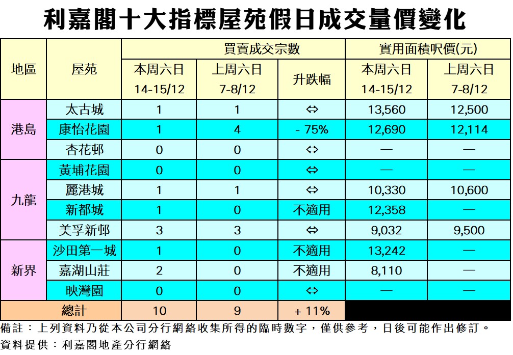 《利嘉閣十大指標屋苑假日二手實況》十大屋苑周末錄10宗成交 按周增11% 業主趁年底前減價出貨 二手交投量靠穩 研究報告 2024-12-15 by Mak Wing · Published 2024-12-15 · Last modified 2024-12-16