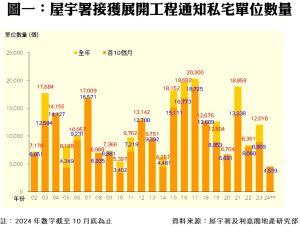 此外,私人住宅落成量方面,根據屋宇署今日最新發表的資料月報顯示,2024年十月份全港共有4個項目,合共3,715個私人住宅單位落成(以屋宇署發出佔用許可證的樓宇數量為準),創三十三個單月新高,並較九月份的1,299伙增近1.86倍;至於今年首十個月累計落成量共14,638伙,較去年同期的10,570伙增加38%。