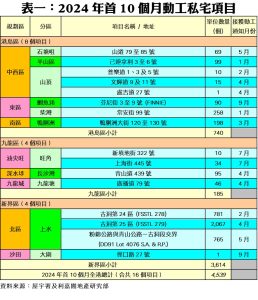 根據資料顯示,十月份本港共有4個私宅項目正式落成,當中規模最大的是啟德承豐道18號,涉及2,060伙;其次為元朗「柏瓏」第1B期及1A期,分別涉及805伙及715伙;至於,大埔公路大埔滘段4138號(135伙),亦於期內竣工(詳見表二)。