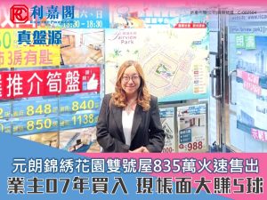 元朗錦綉花園雙號屋835萬元速售 業主07年買入 現帳面大賺5球