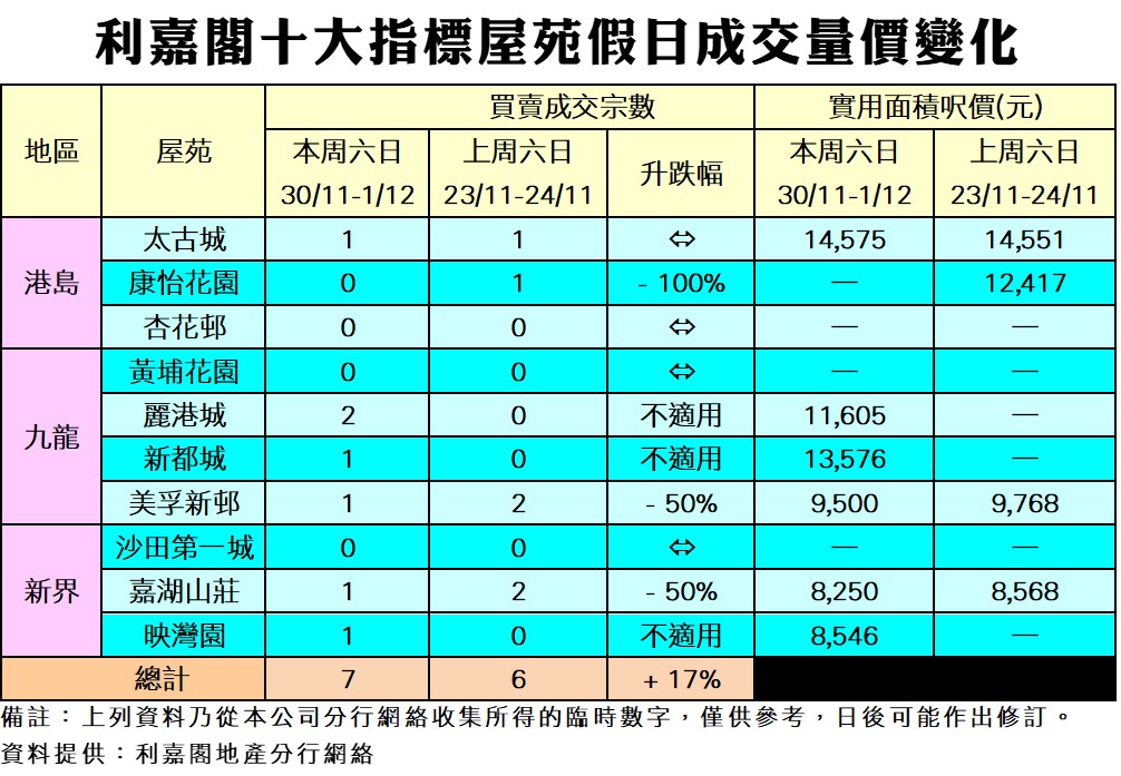 《利嘉閣十大指標屋苑假日二手實況》 十大屋苑周末錄7宗成交 按周增1宗 整體市況持續偏靜 本月長假利淡買賣 研究報告 2024-12-01 by Chan Derek · Published 2024-12-01
