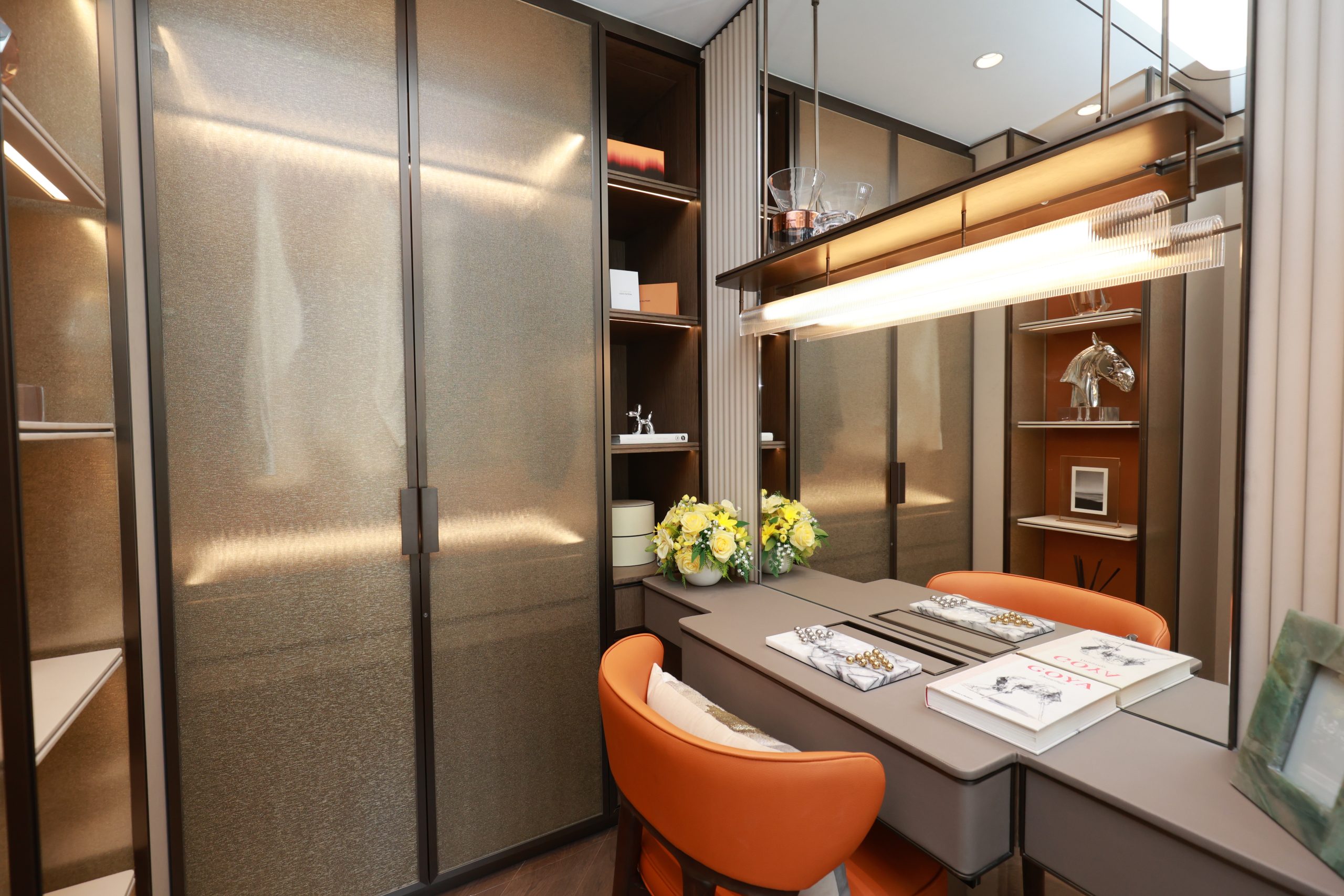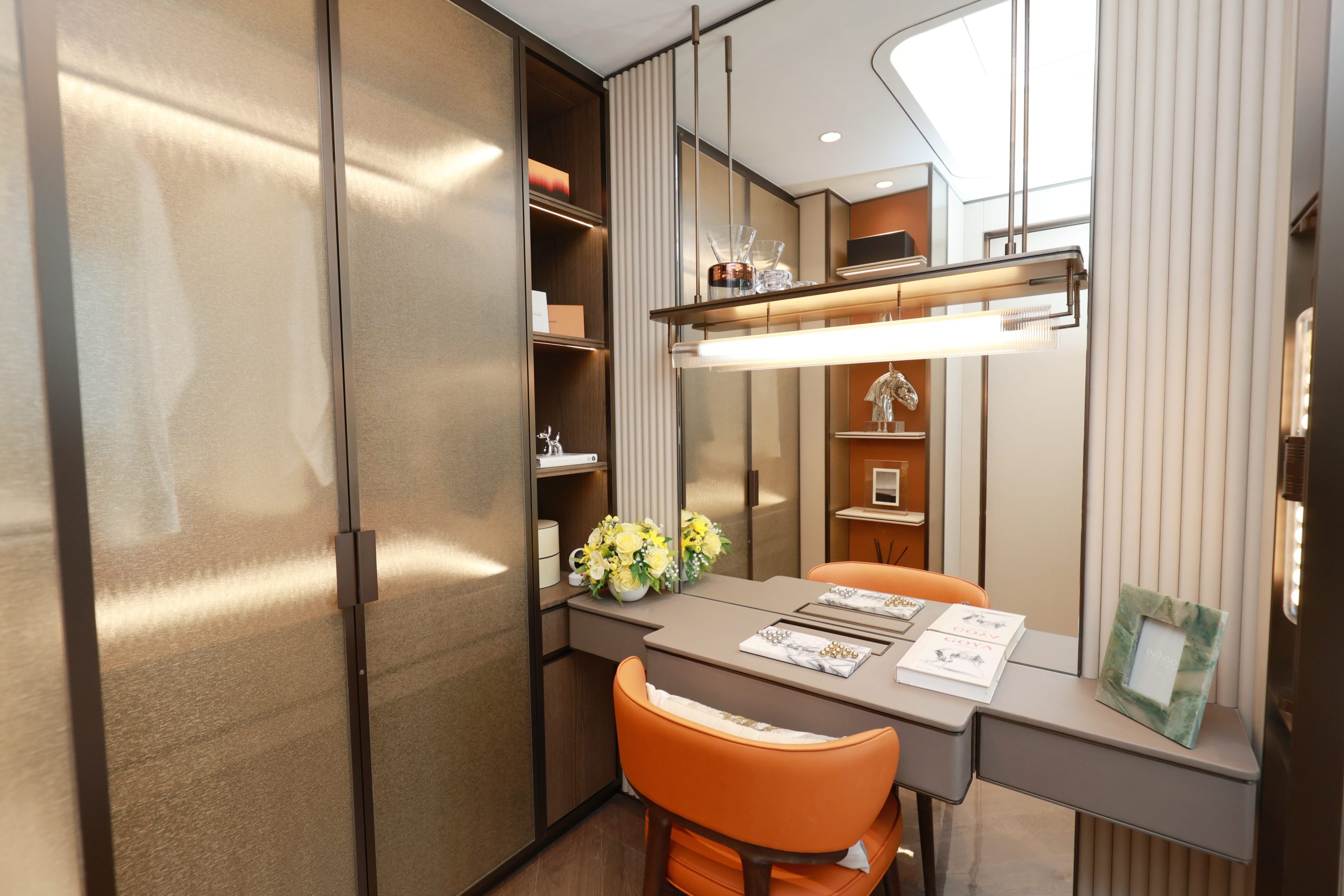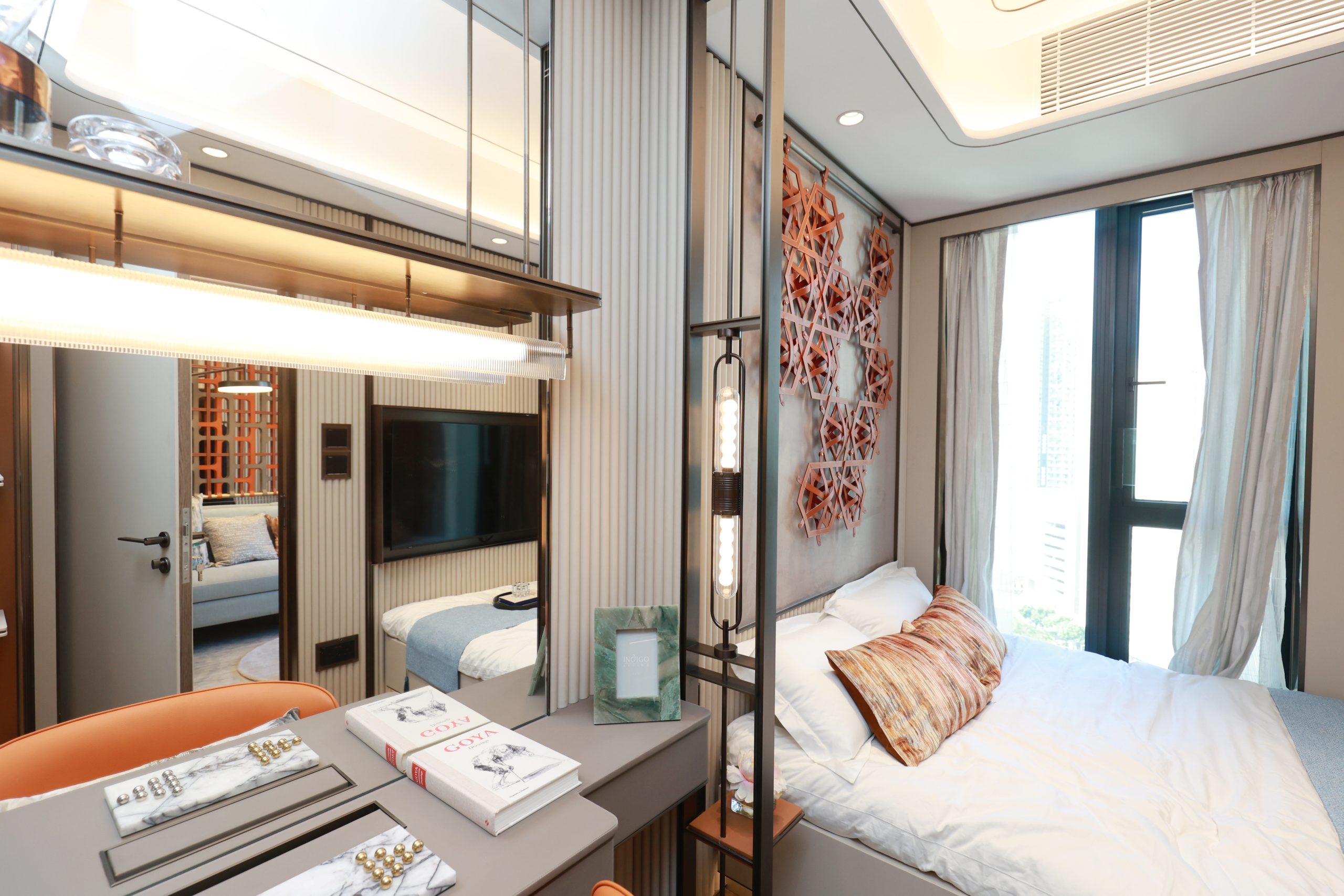 單位設有約46方呎三合一新式設計露台,寬敞通風。開放式廚房及迷你酒吧櫃設有深色雲石台面營造低調奢華的感覺,完美結合了現代生活的便利與舒適。廚房配備現代化廚具與操作台,讓烹飪成為一種享受。約97方呎的房間延續法國奢侈品牌的設計,空間寬敞,放置雙人床後,仍擁書枱或化妝空間,並運用了一些燈飾,讓整個空間更明亮舒適。左邊的衣帽間提供充裕收納空間,睡床上方放置了另一幅該法國奢侈品牌打造的皮革裝飾作品,與落地大窗相襯,讓自然光線滲入屋內,明亮溫馨,增添質感和高雅氣息,是時尚專業人士的理想居所。另外,浴室同樣以淺色為主調,與整體風格一脈相承。
