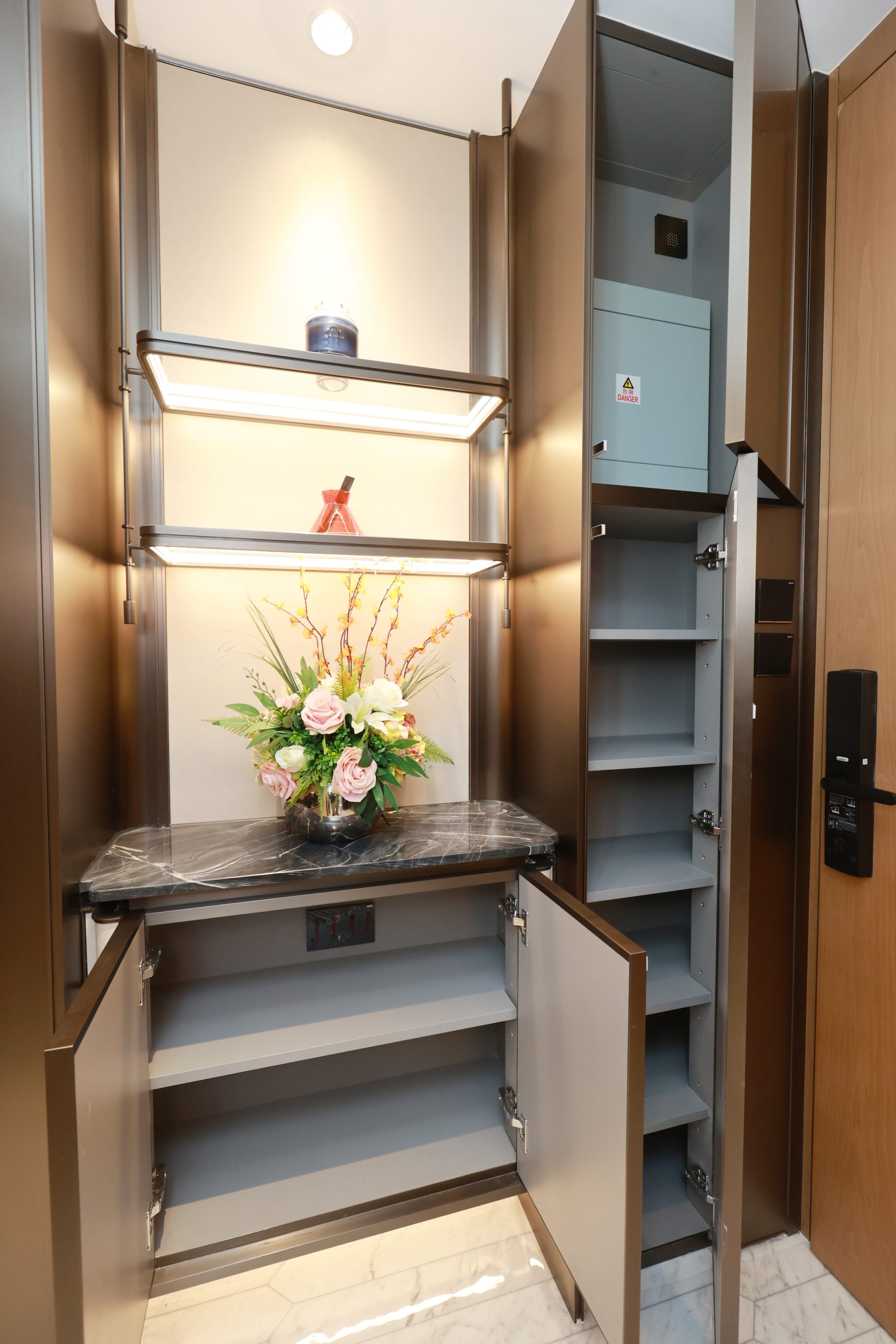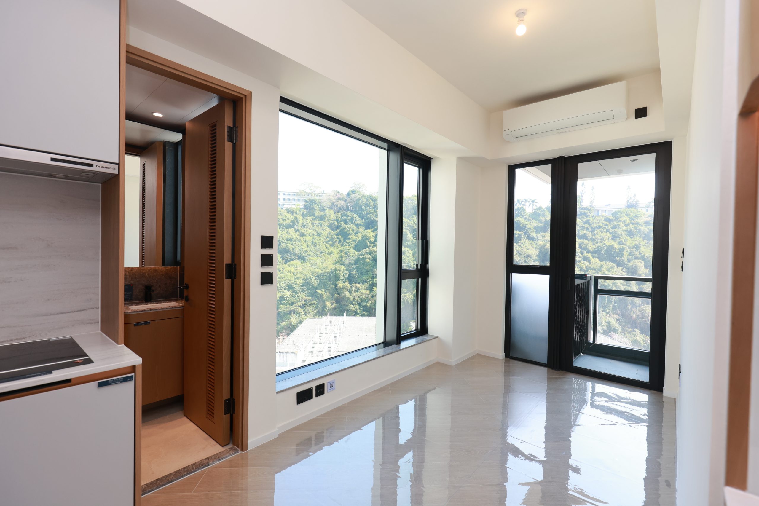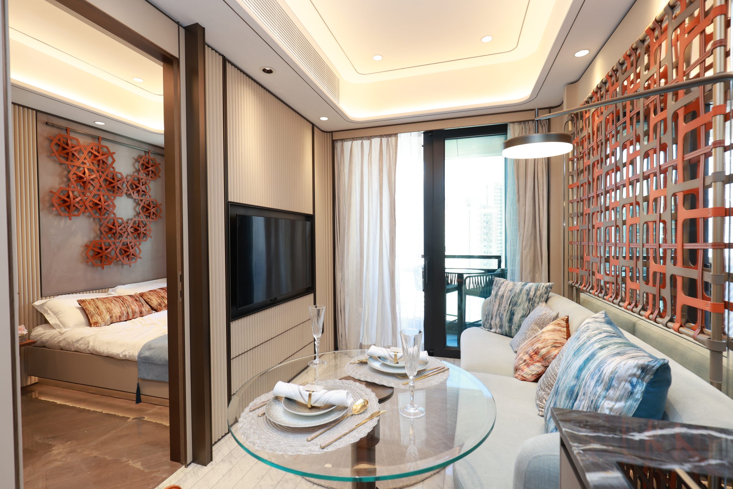 單位設有約46方呎三合一新式設計露台,寬敞通風。開放式廚房及迷你酒吧櫃設有深色雲石台面營造低調奢華的感覺,完美結合了現代生活的便利與舒適。廚房配備現代化廚具與操作台,讓烹飪成為一種享受。約97方呎的房間延續法國奢侈品牌的設計,空間寬敞,放置雙人床後,仍擁書枱或化妝空間,並運用了一些燈飾,讓整個空間更明亮舒適。左邊的衣帽間提供充裕收納空間,睡床上方放置了另一幅該法國奢侈品牌打造的皮革裝飾作品,與落地大窗相襯,讓自然光線滲入屋內,明亮溫馨,增添質感和高雅氣息,是時尚專業人士的理想居所。另外,浴室同樣以淺色為主調,與整體風格一脈相承。