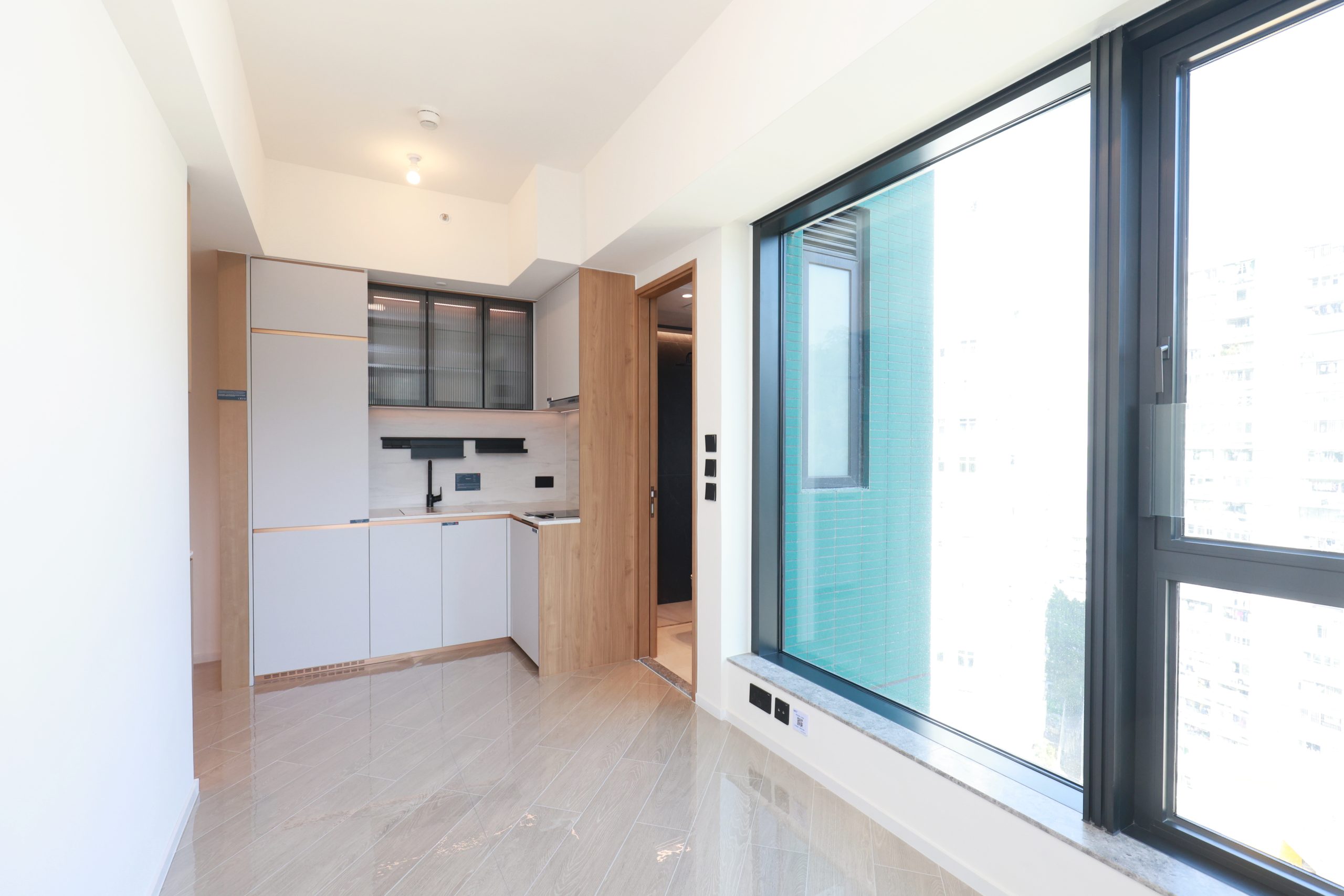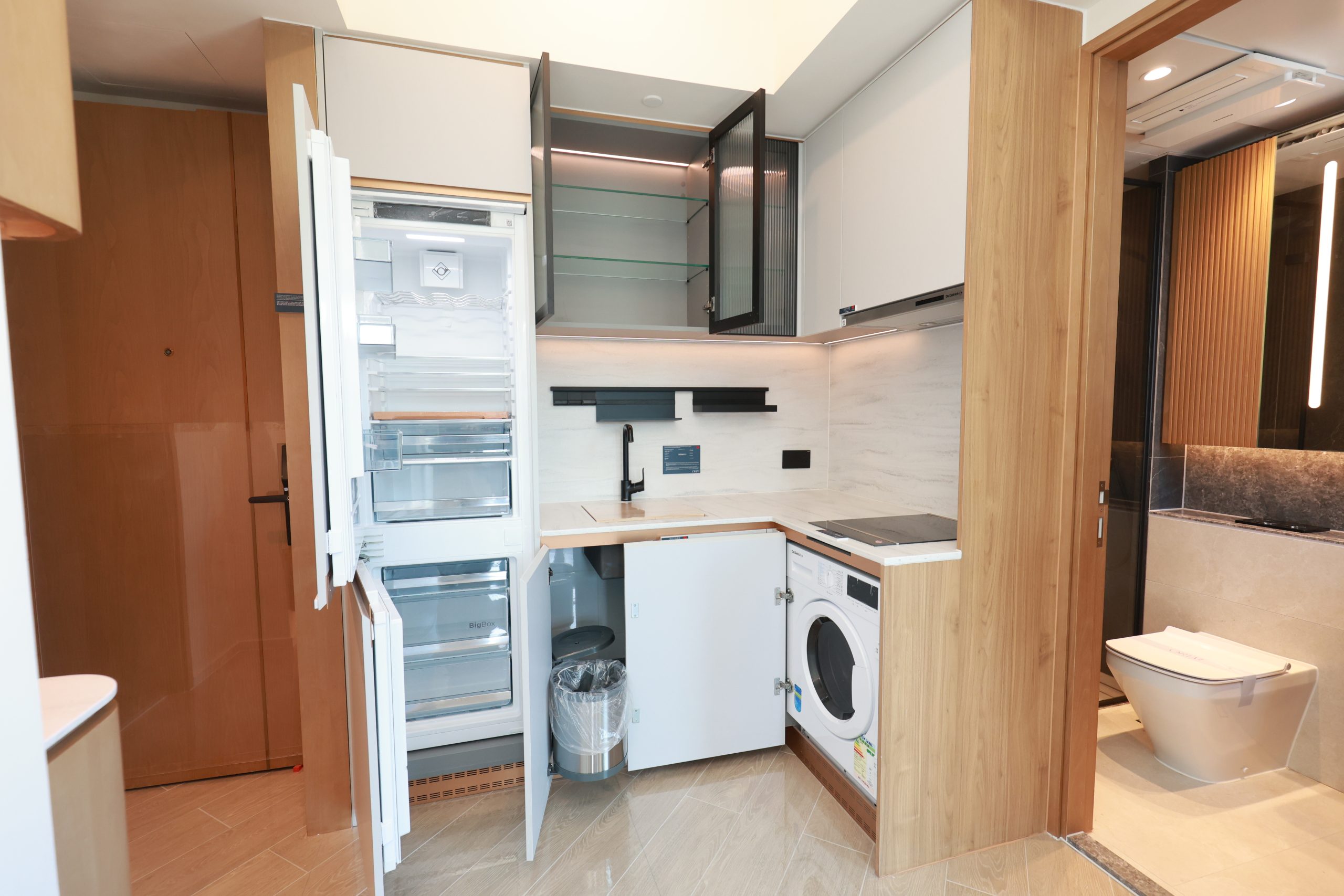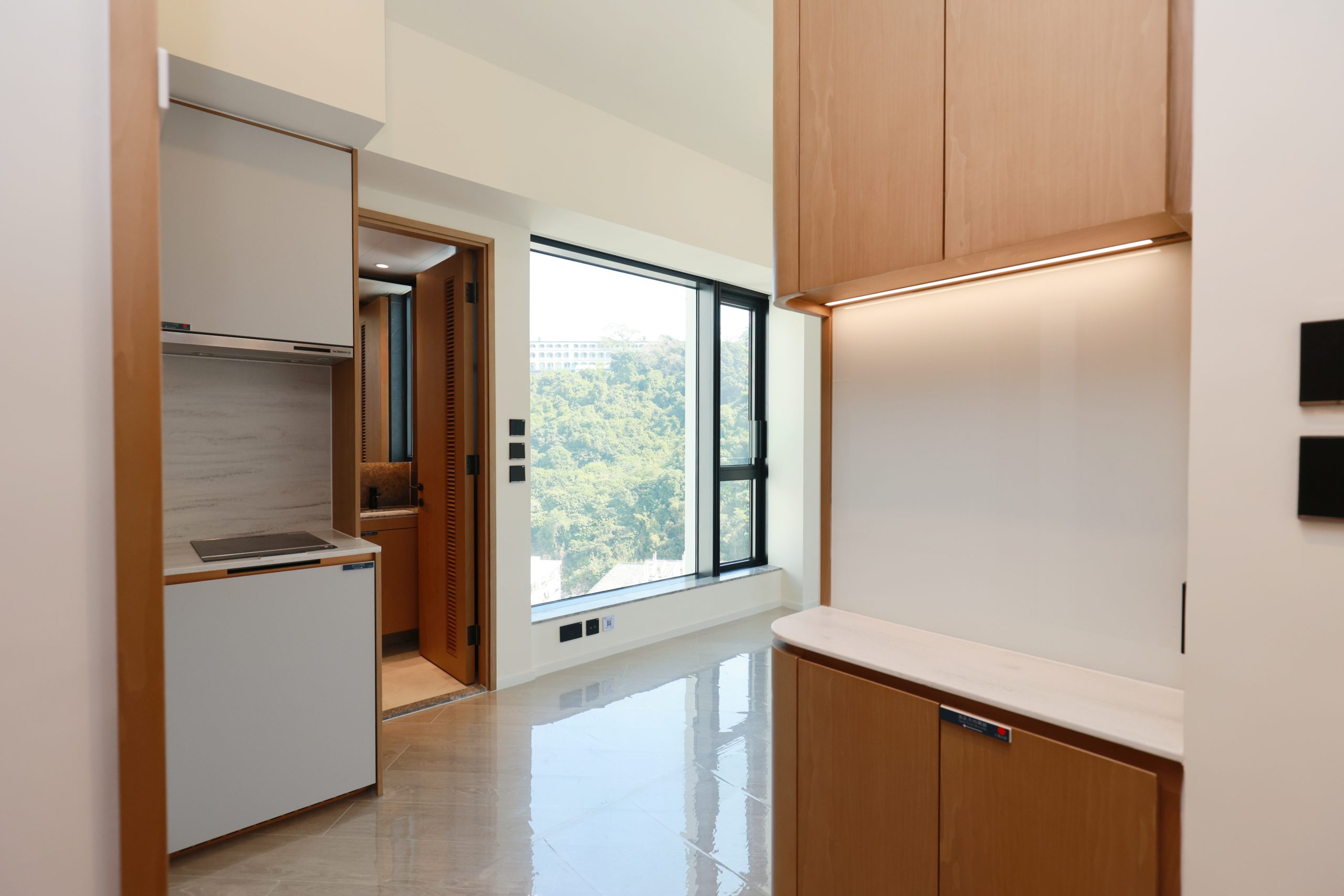 當中18樓E室,一房連裝修及傢俬示範單位,實用面積324方呎,整體設計風格以現代都市輕奢風為主,單位全屋以淺色物料及雲石為主調,加上設計靈感沿自法國奢侈品牌,以少量鏡及金屬為點綴,展示明亮的空間設計及充滿時代氣息,時尚又型格。單位擁有約3.15米高的樓底令居室充滿空間感。地面鋪砌了白色箭型雲石,廚櫃以米白色飾板配以黑色雲石紋枱面及牆身,形成前衛的「黑白配」。