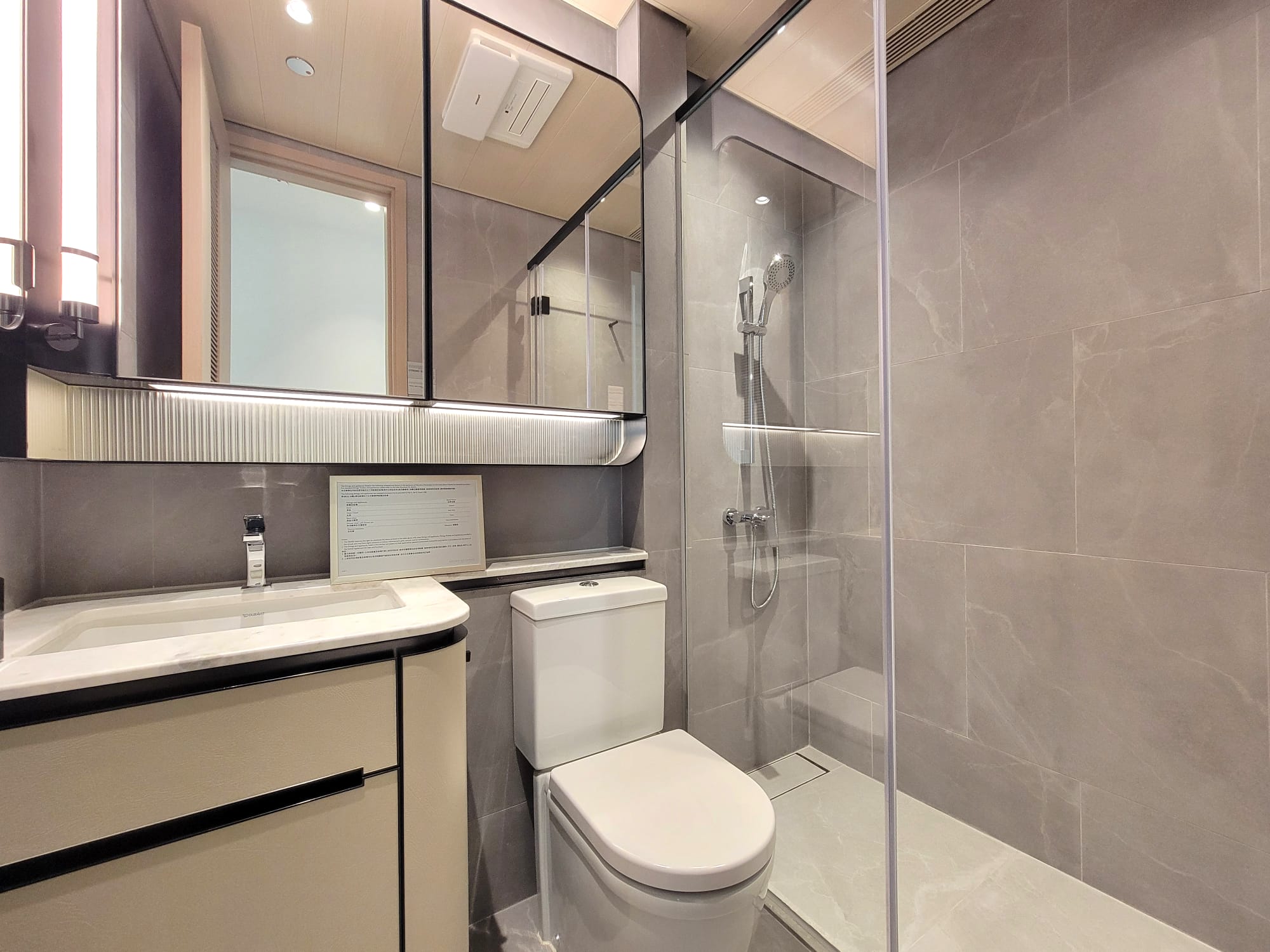 浴室及主人浴室用料一絲不苟,牆身及地板以灰色高級石紋瓷磚鋪砌,呈現現代簡約風格,主人浴室洗手盆櫃則選用棕色高級皮紋飾面,浴室配搭灰棕色天然檯面石,盡顯高雅成熟品味,洗手盆櫃內設有小型儲物間隔,而櫃側設隱藏式置物空間,令浴室收納變得更井井有條。浴室及主人浴室均裝設Panasonic浴室寶,時刻保持乾爽舒適。