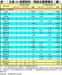 至於,港島區8個指標屋苑上周共錄11宗買賣,與前周的宗數相同,藍籌屋苑太古城期內錄得5宗成交,較前周的7宗減少29%;杏花村交投量由前周的2宗,增加50%至上周的3宗;康怡花園嘉亨灣藍灣半島上周則未聞成交,暫時「捧蛋」。此外,在全港50個指標屋苑之中,上周共有17個屋苑錄得「零成交」,較前周的18個減少6%,當中港島區及九龍區分別佔3個及6個屋苑,新界區則佔8個(詳見表一)。