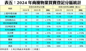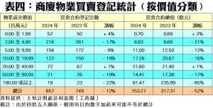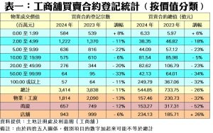 若以買賣合約總值分析,商廈登記總值大幅急挫逾五成(52%),去年僅錄153.27億元,佔整體金額28%,佔比按年急挫逾15個百分點,主因去年錄得較少大額登記。至於,工廈及店舖去年登記金額分別達157.46億元及234.13億元,佔比各達29%及43%。