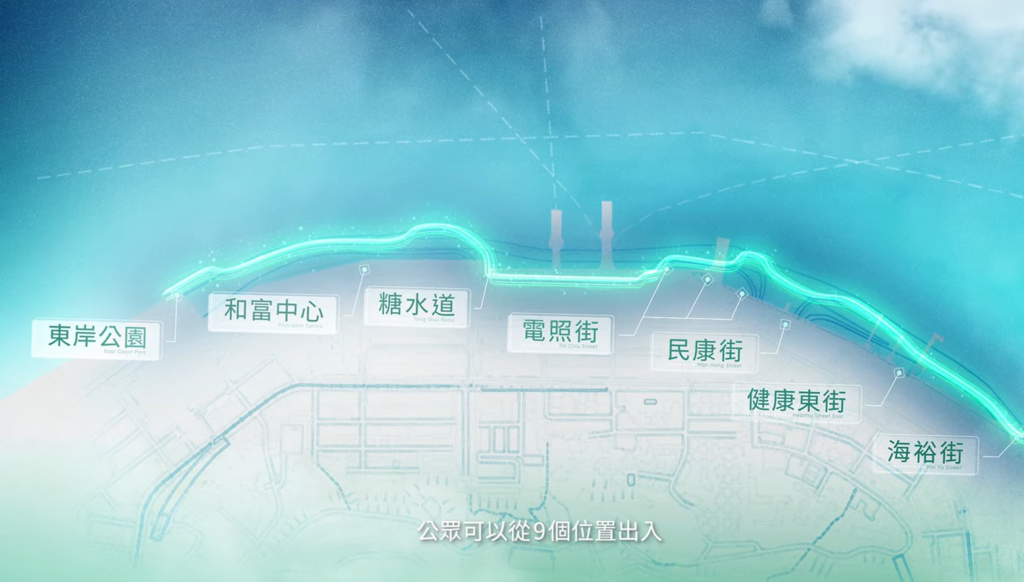 全新的東岸板道板道建於東區走廊之下全長約22公里採用玻璃設計其中包括連接至東岸公園主題區的西段部分即將在農曆新年前全面開放俾公眾影片截圖