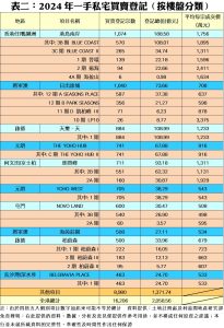 按樓盤分類,2024年熱賣樓盤之首為天璽‧天1期錄得的884宗登記,其次為THE YOHO HUB II的741宗,第三為YOHO WEST 1期的705宗,再者是SEASONS PLACE的587宗。至於登記排行榜內去年平均每宗成交價最高者是LP10的約3,375萬元,而較低平均價者為BELGRAVIA PLACE 1期的約533萬元(見表二)。