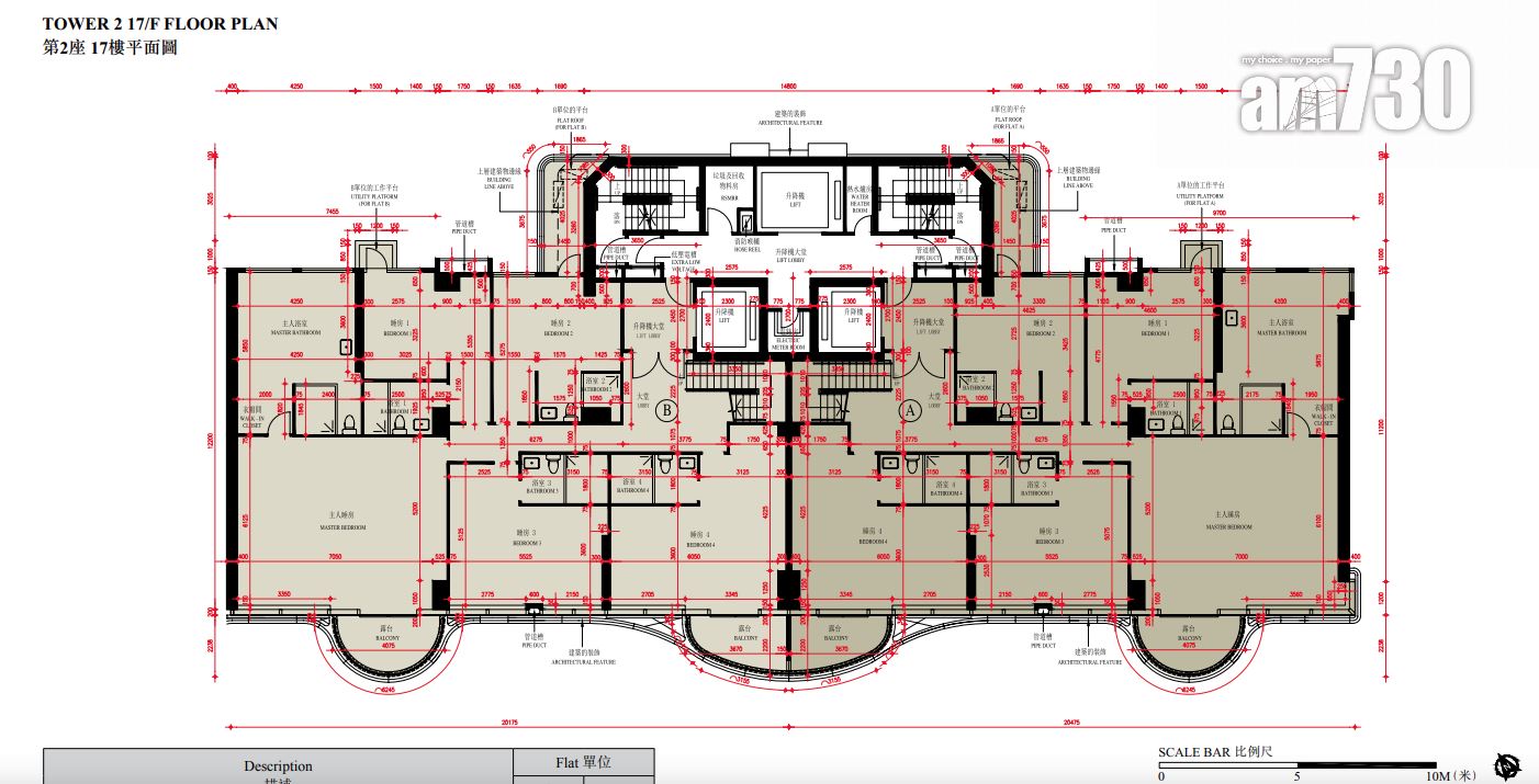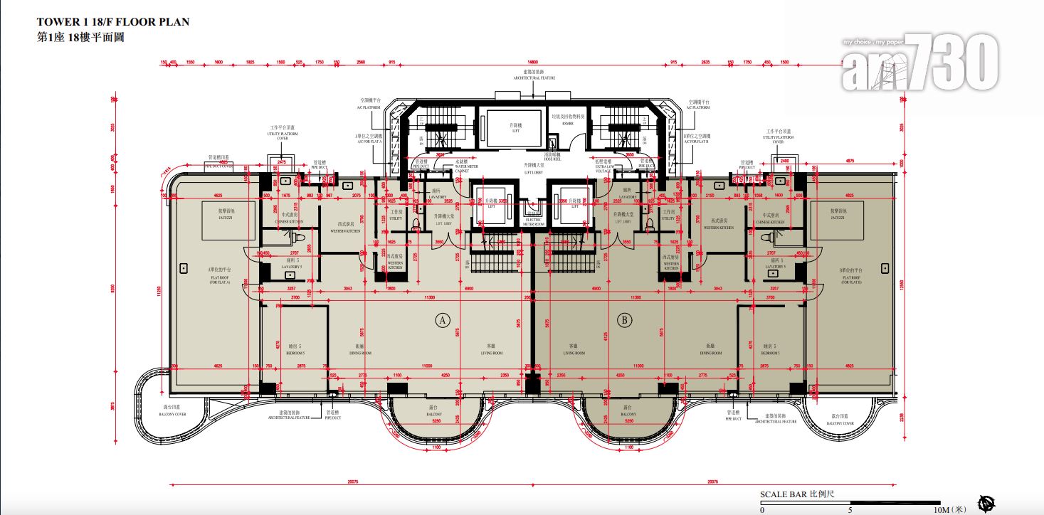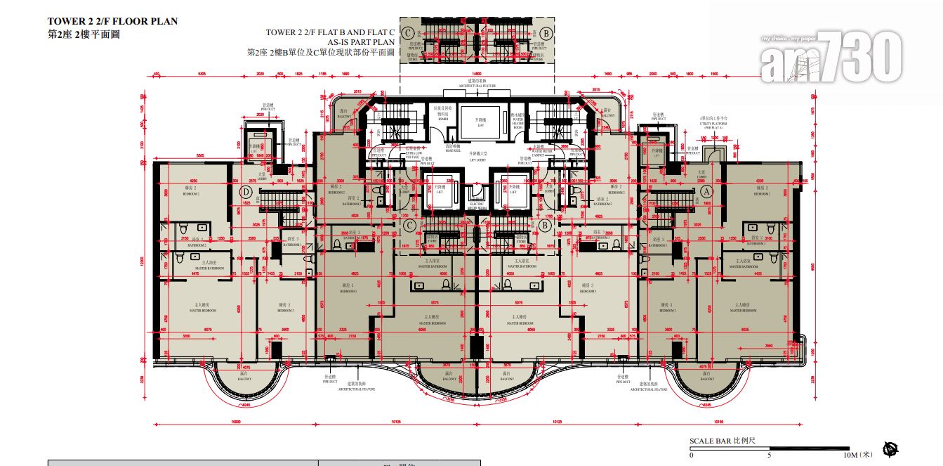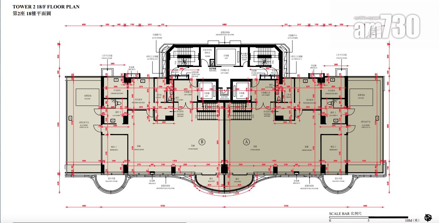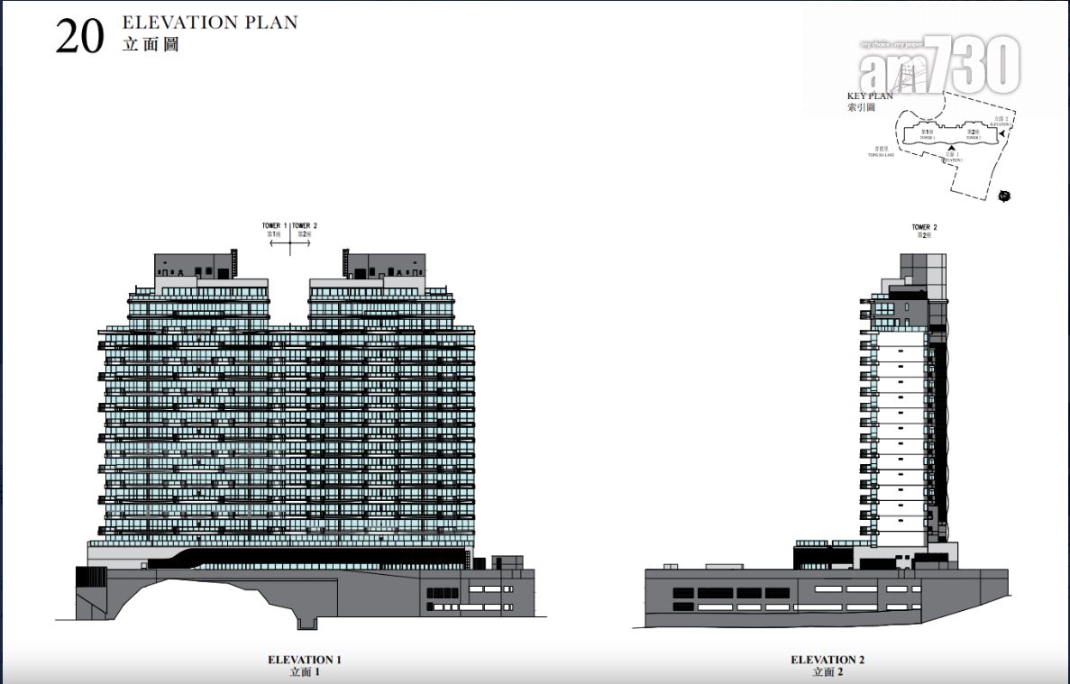 至於全盤面積最細單位包括第2座3至16樓B室及C室,三房間隔,實用面積1,089方呎;全盤面積最大單位為第2座19樓及20樓A室,頂層複式五房間隔,附設私人升降機大堂,實用面積6,288方呎,連1,688方呎天台,配備游泳池。