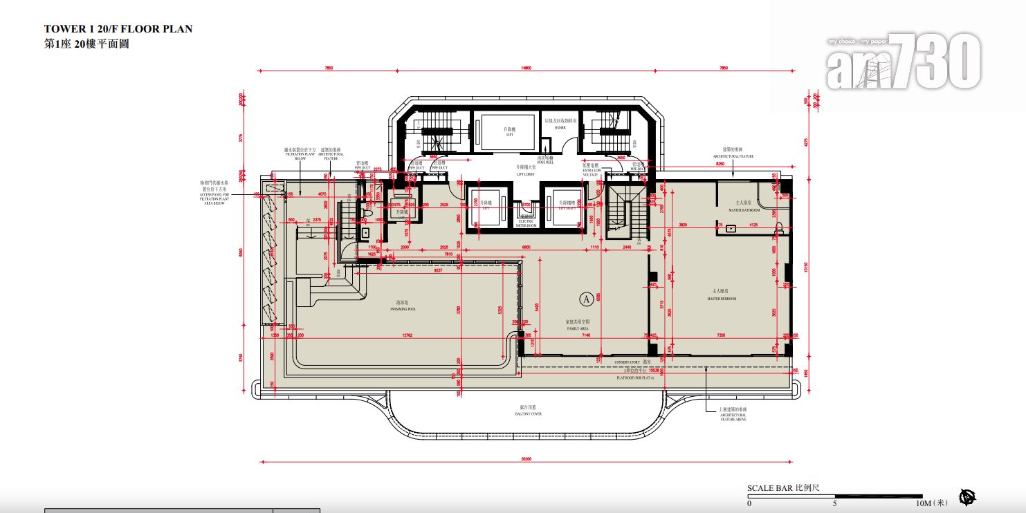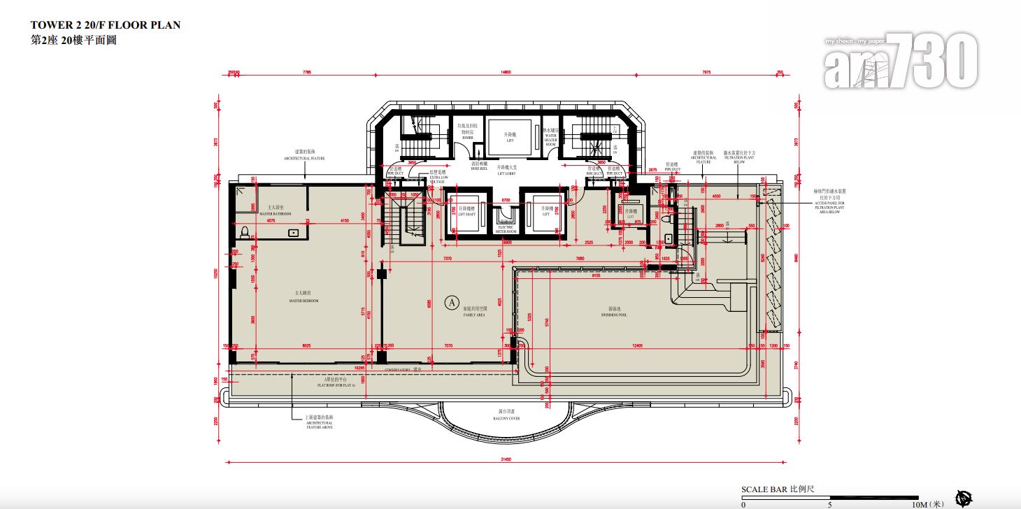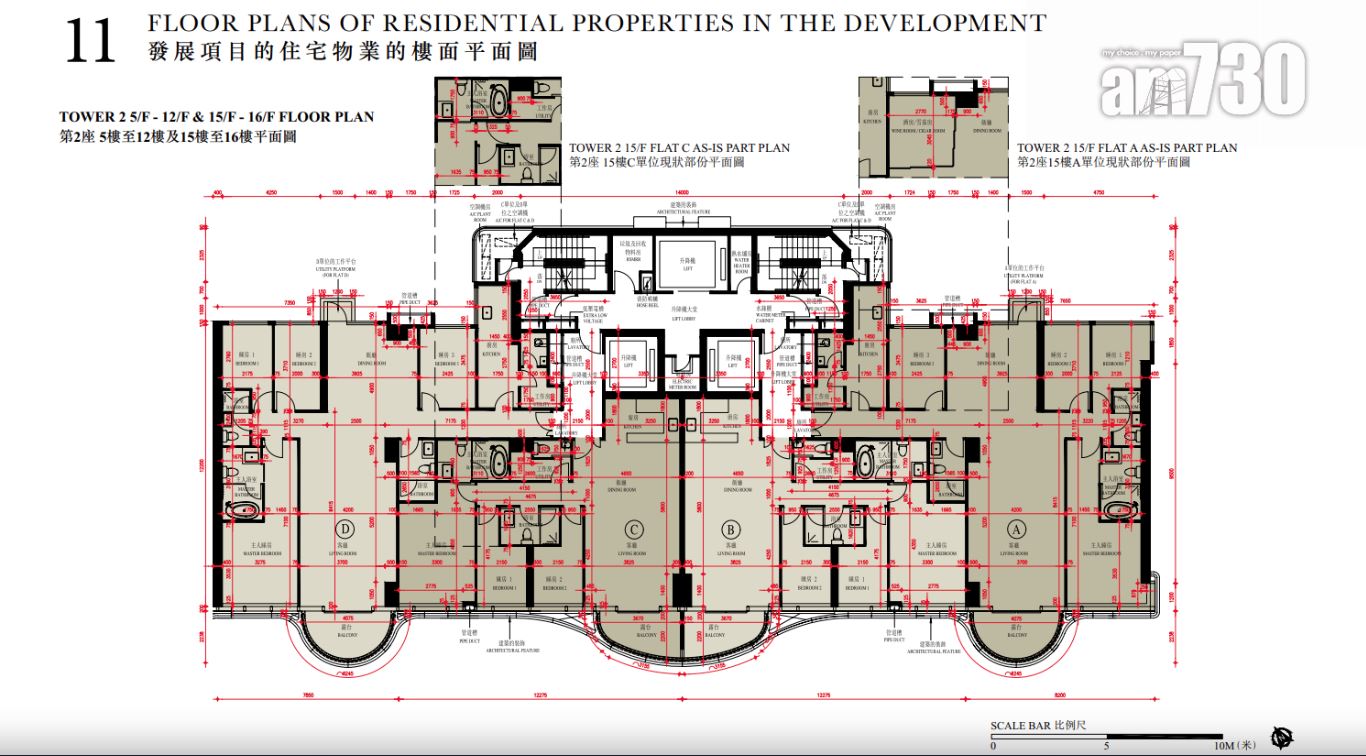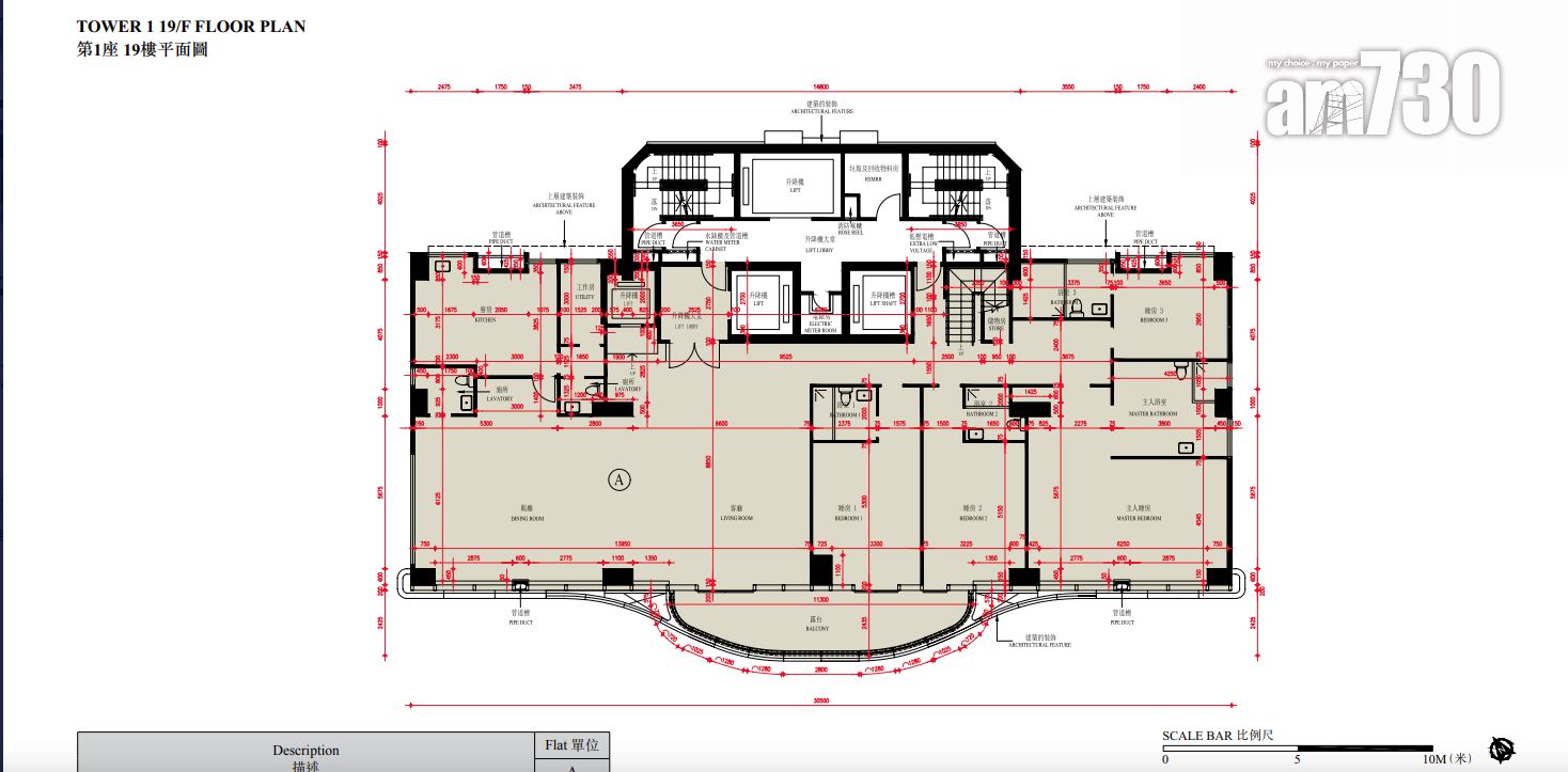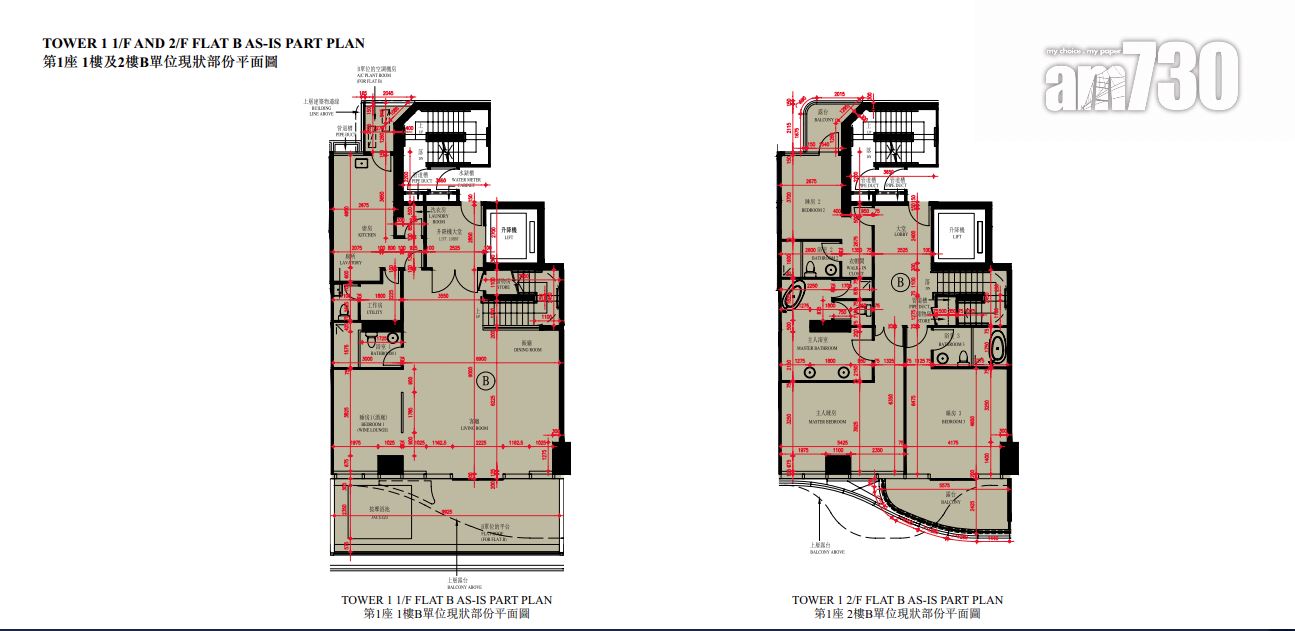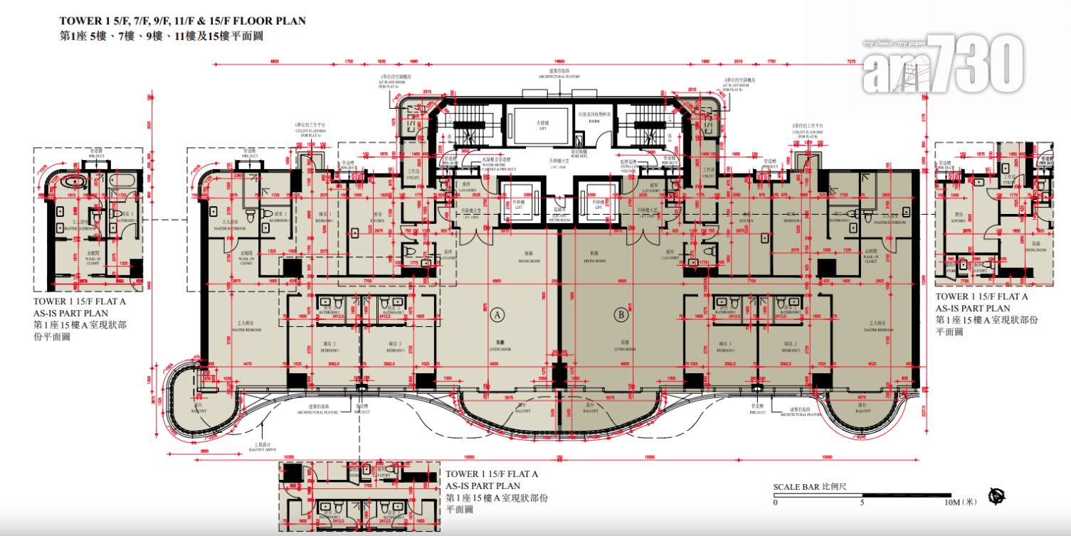 至於全盤面積最細單位包括第2座3至16樓B室及C室,三房間隔,實用面積1,089方呎;全盤面積最大單位為第2座19樓及20樓A室,頂層複式五房間隔,附設私人升降機大堂,實用面積6,288方呎,連1,688方呎天台,配備游泳池。