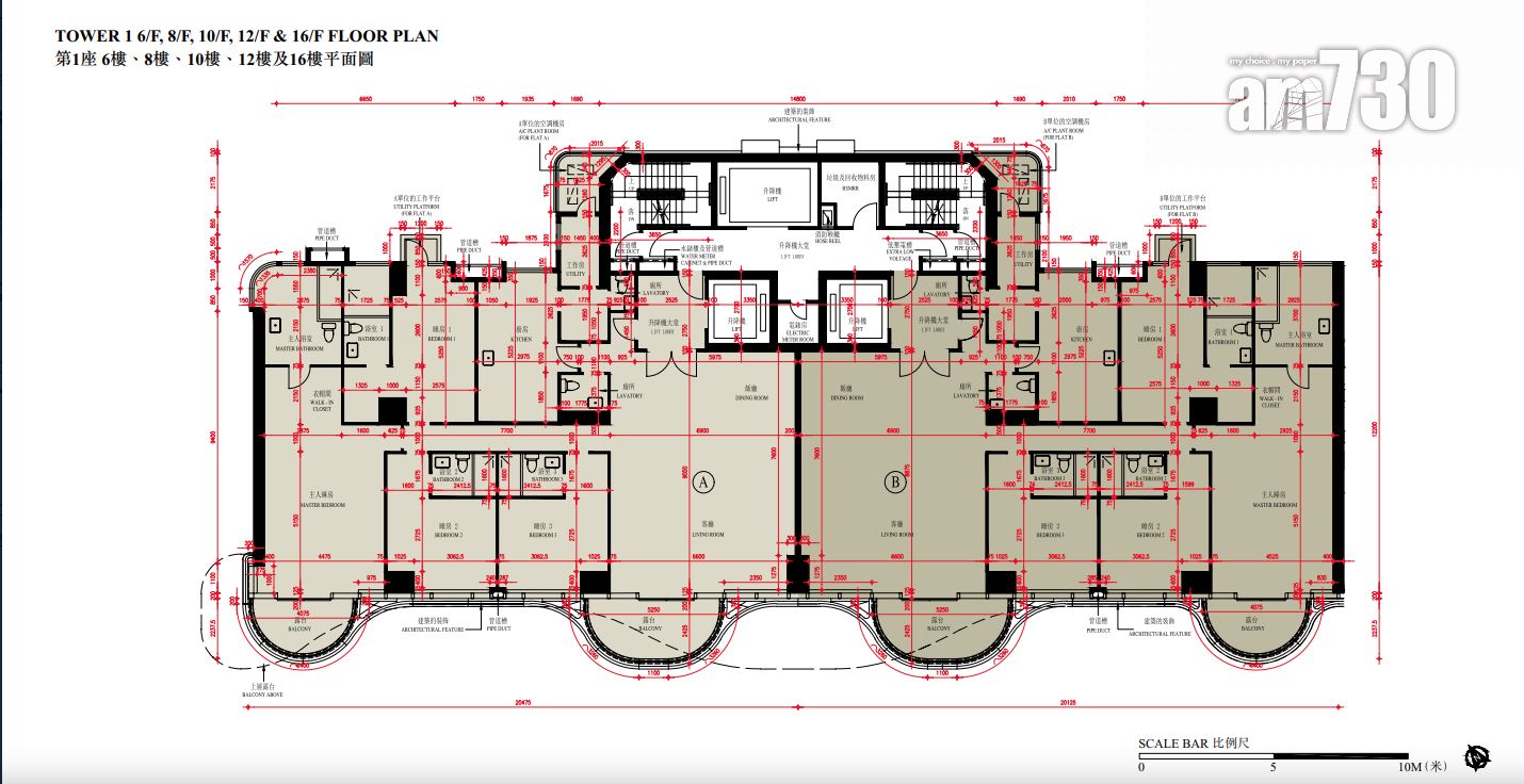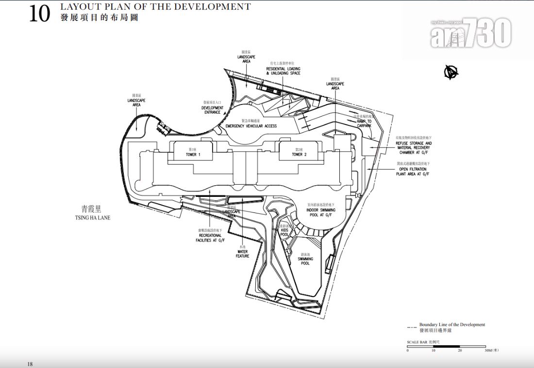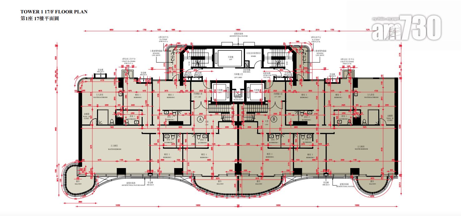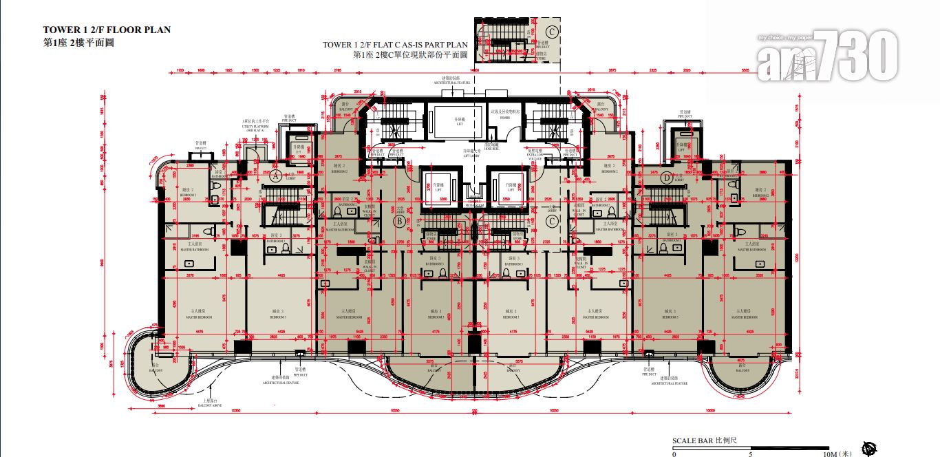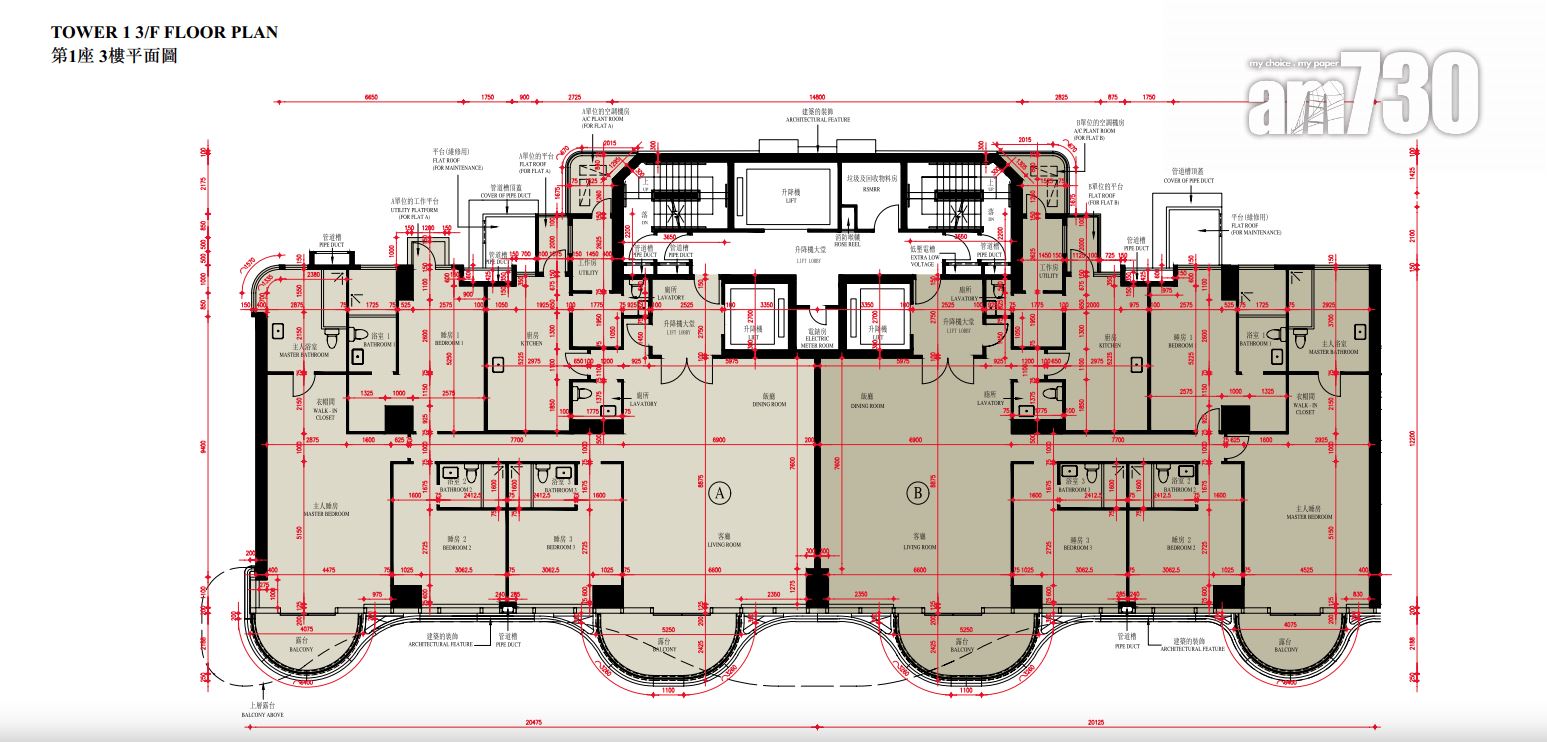 至於全盤面積最細單位包括第2座3至16樓B室及C室,三房間隔,實用面積1,089方呎;全盤面積最大單位為第2座19樓及20樓A室,頂層複式五房間隔,附設私人升降機大堂,實用面積6,288方呎,連1,688方呎天台,配備游泳池。
