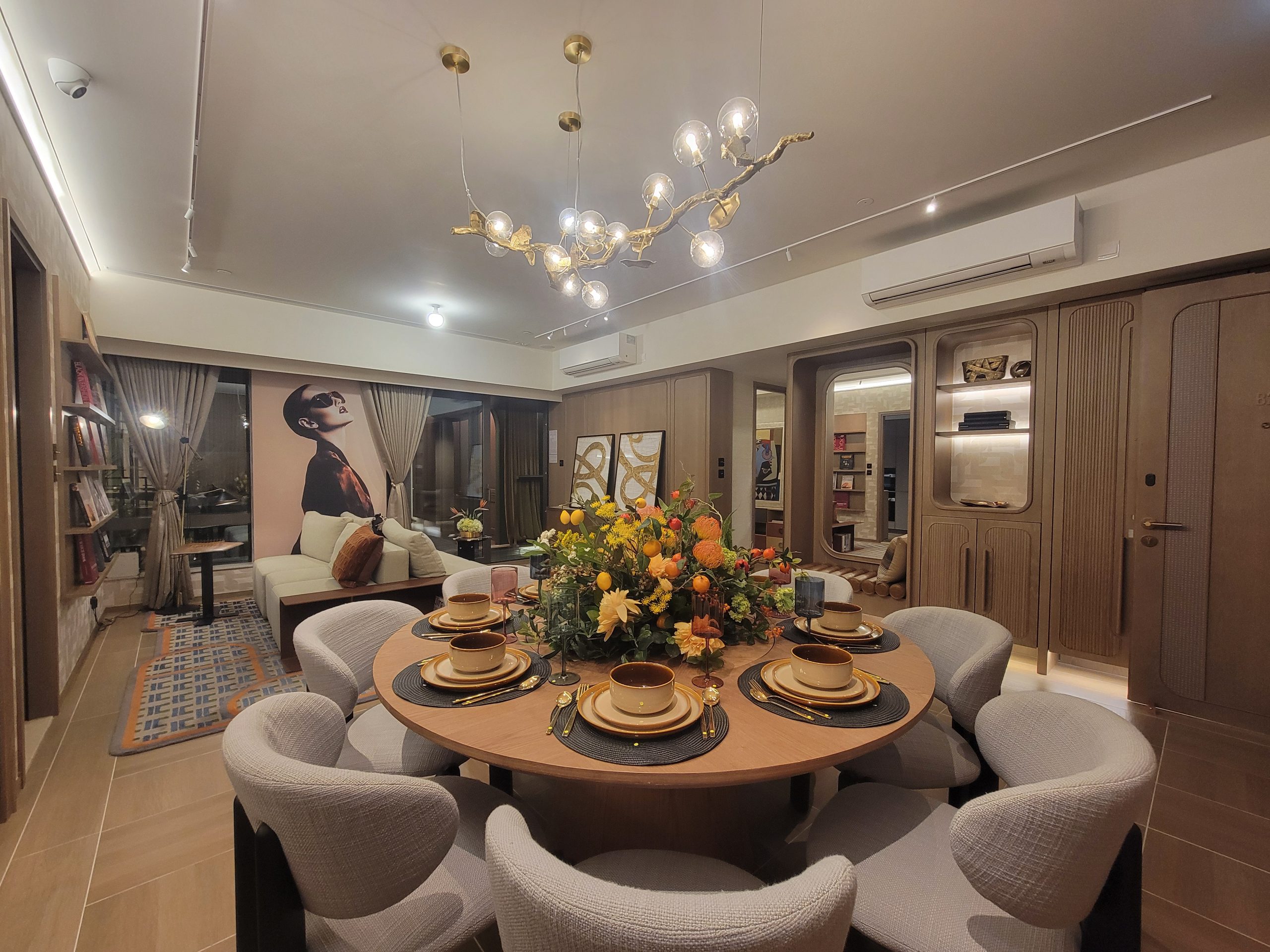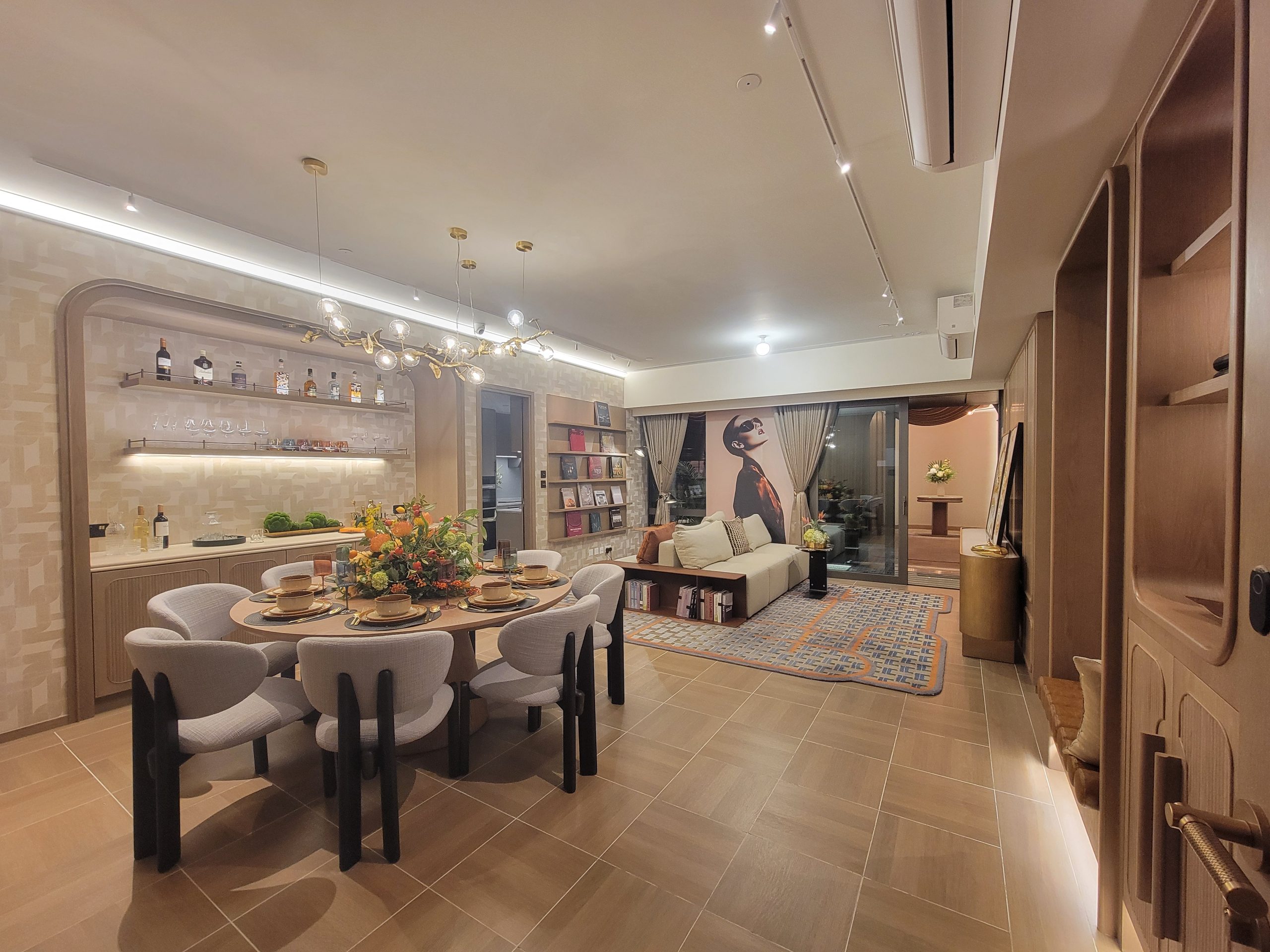 因應客廳空間寬敞,設計師巧妙地運用「雙面性」(Duo Living)設計概念,將客廳劃分為電視區及閱讀區。雙客廳設計元素符合現代人多元生活需求,有助打造親子或家庭和諧感,寬敞舒適的起居空間,讓住戶在家中尊享寬敞豪門大宅氣派。罕有大飯廳可放置大餐桌,不論是日常起居或舉辦私人派對都舒適體面。單位設有特大露台及工作平台,配備匠心設計壁燈STATE HOUSELIGHT,採用皇都特有的圖案設計,彰顯昔日小上海的獨特魅力,將格調延伸至室外空間。