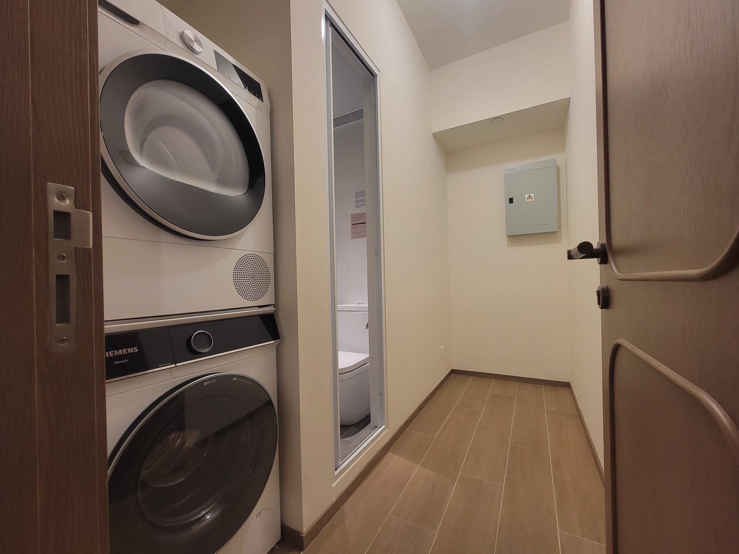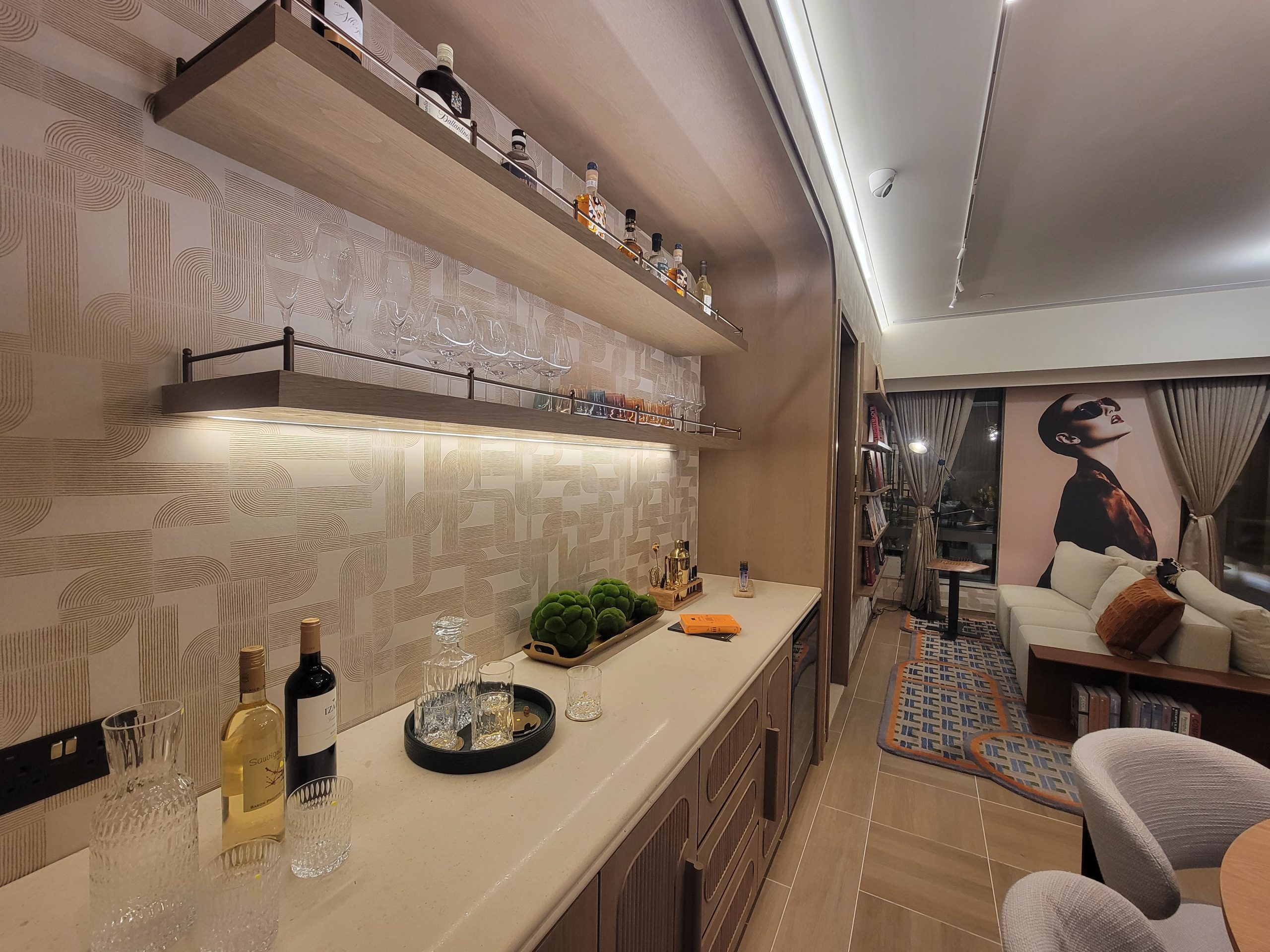 廚房為梗廚設計,配置歐洲名牌Miele家電,包括煮食爐、電磁爐、嵌入式焗爐、嵌入式蒸爐、嵌入式洗碗碟機等。另設磁吸配件Kit Plus,住戶可以按照個人喜好習慣,整齊收納廚具、餐具、調味料及平板電腦等。此外,Pull-Down Tray下拉式儲物設計,幫助靈活運用儲存空間。飯廳亦設有匠心設計的STATE LOUNGE酒櫃,弧型設計加上特色背景牆,結合陳列裝飾、儲物空間及Miele 酒櫃,提升備餐時的互動體驗,方便住戶宴請親朋好友聚餐。