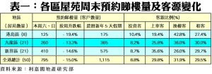 按地區劃分,港島、九龍及新界三區指標屋苑的周末預約睇樓量全線下跌,其中港島區跌幅較大,該區8個指標屋苑於周末暫錄125組客戶預約睇樓,按周減少19.4%,而五天長假則約有175組客戶。新界區方面,21個指標屋苑本周末暫錄410組客戶預約睇樓,按周下跌14.6%,而五天長假則約有575組客戶。至於,九龍區21個指標屋苑於本周末暫錄260組客戶預約睇樓,按周減少13.3%,而五天長假則約有365組客戶。
