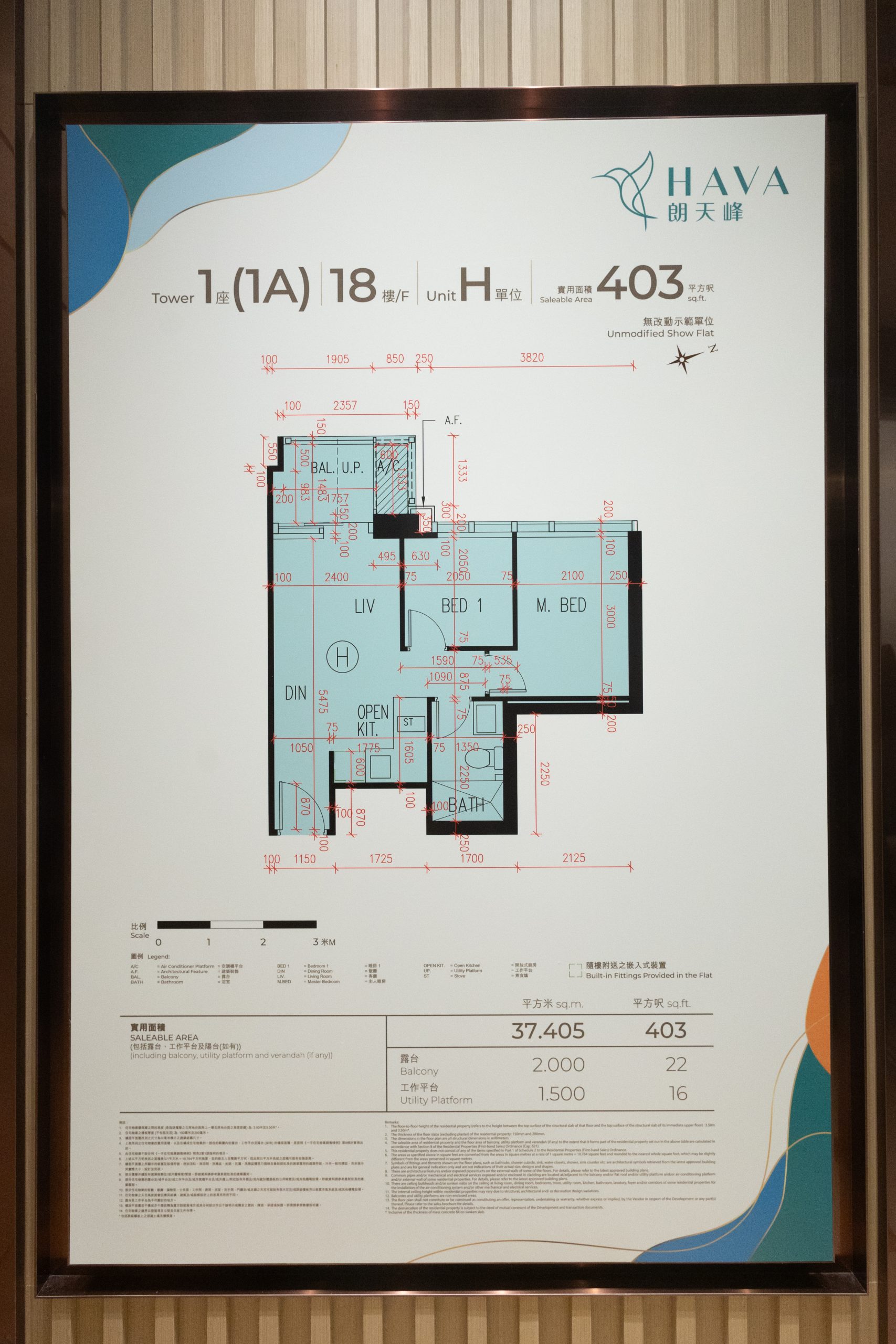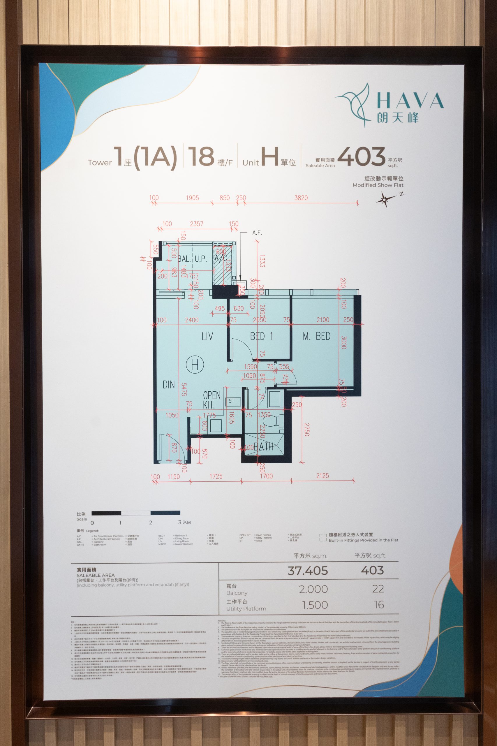 該盤設有3個示範單位,其中包括以第1A座18樓H室為藍本搭建,屬兩房連開放式廚房經改動示範單位,實用面積403方呎。單位間隔方正,層與層之間的高度為3.5米,空間感十足。