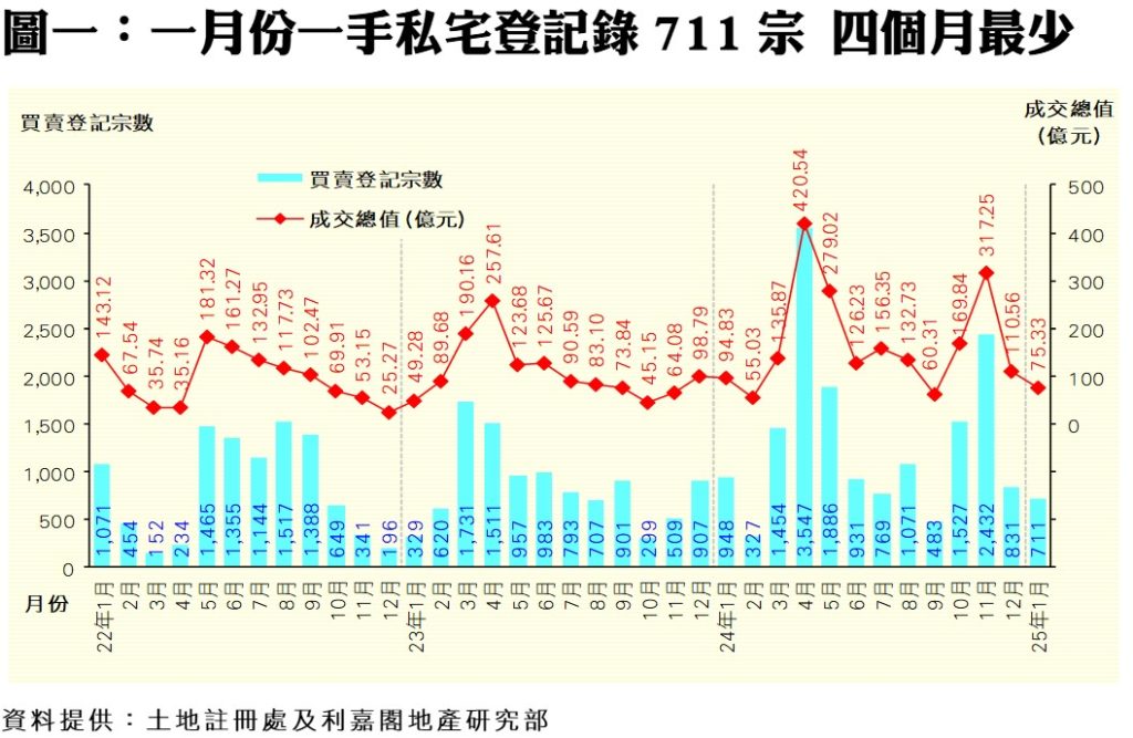 利嘉閣地產研究部主管陳海潮表示,連月節慶假期淡市影響,一月及二月一手買賣均處弱勢,市場靜候《財政預算案》好消息,新盤小陽春三月份有望出現。綜合土地註冊處數據所得,2025年一月全港共錄得711宗一手私人住宅買賣登記,較去年十二月的831宗持續下跌14%,連跌兩個月,創近4個月新低。一月份登記總值更相應大減32%,錄得75.33億元,同樣連挫兩個月,錄近4個月最少。