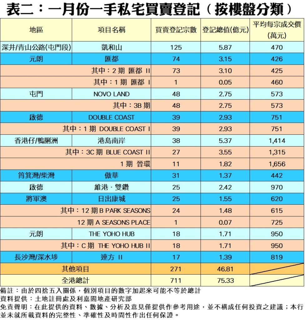 按樓盤分類(見表二),屯門凱和山於一月份錄得125宗登記,成為登記量最多的一手私宅項目,登記總值達5.87億元,平均每宗登記約470萬元;其次為元朗匯都II及屯門NOVO LAND 3B期,分別錄得73宗及48宗登記。至於排行榜內上月平均每宗買賣成交價最高者為港島南岸1期晉環的1,656萬元;而匯都II的425萬元則為較低平均價者。