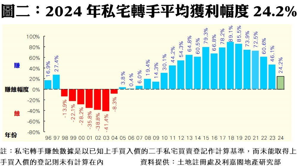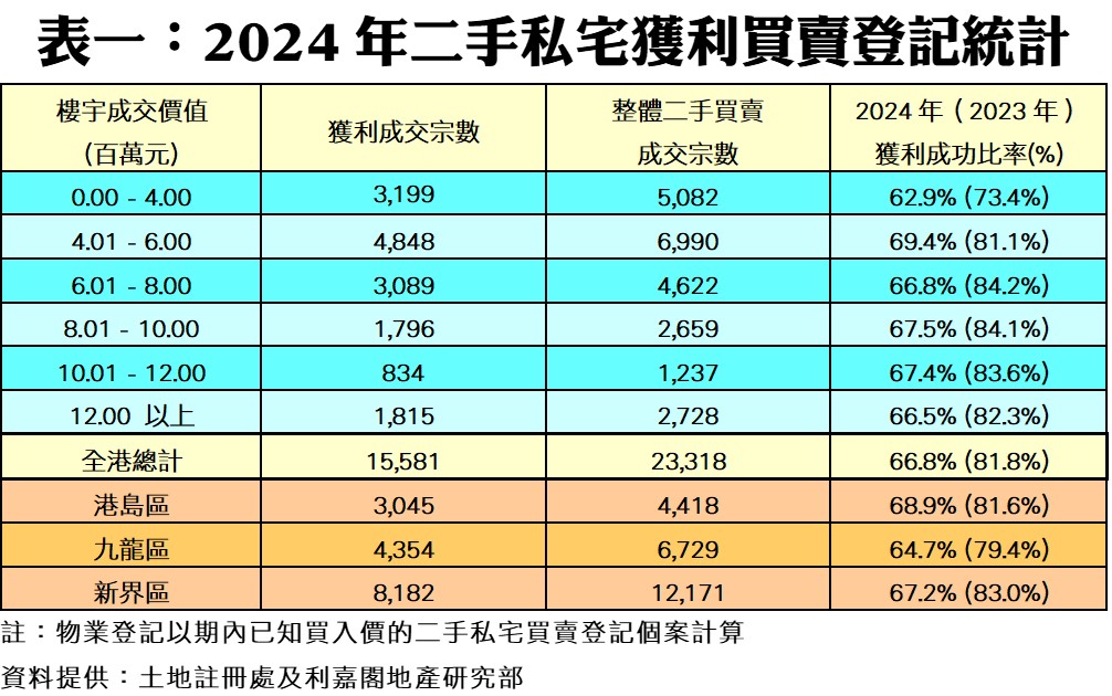 利嘉閣地產研究部主管陳海潮表示,2024年市況大起大落,而樓市撤辣後已全面改變市場生態,過往十多年的長期逾九成轉手獲利比率已不復存在。綜合土地註冊處資料所得,2024年全港23,318宗已知上手購入價的二手私宅買賣登記中,帳面獲利個案共15,581宗,佔比達66.8%,較2023年的81.8再跌15個百分點,連跌6年,跌勢加劇,創自2008年以來的17年新低。至於每宗私宅轉手平均賺幅同步連跌6年,僅得24.2%,按年大幅回落21.9個百分點,為自2010年來的15年最少。