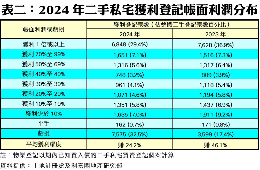 近年樓市先後受疫情及高息環境衝擊,而去年當局更加全面撤辣,並放寬七成按揭,將樓市及樓價走勢的主導權交回市場自由運作,故去年不論獲利比率及平均賺幅均進一步急跌,回復未有辣招政策制肘下的波動情況。當中去年平手登記的個案有162宗,佔比按年微降至0.7%;而虧損個案則高達7,575宗,佔比由2023年的17.4%大增15.1個百分點至去年的32.5%,可見蝕讓情況急速擴大(見表二),料與樓市辣招鬆綁後,出現更多蝕讓套現所致;至於獲利1倍或以上者減少7.5個百分點至29.4%,去年共錄得6,848宗,但仍是佔比最多的獲利幅度分布。