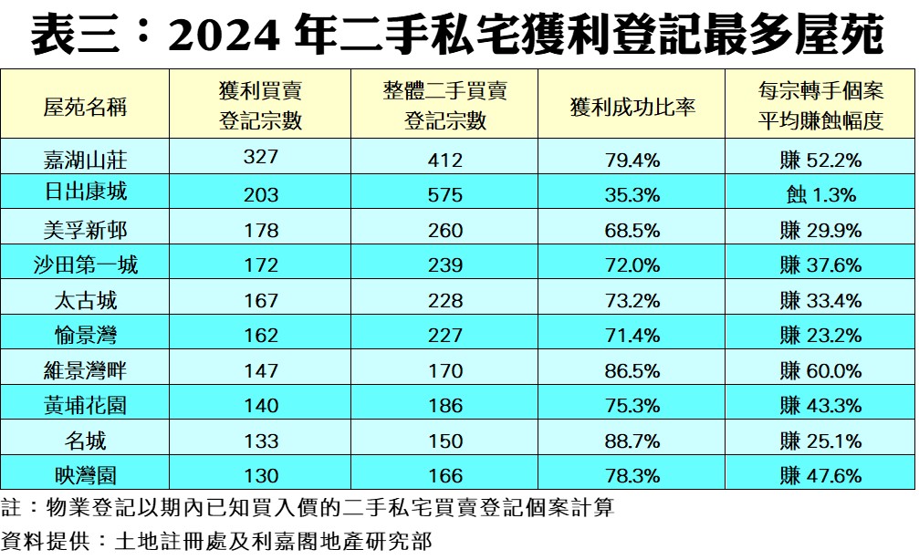 若以屋苑計算,嘉湖山莊去年錄得最多的327宗獲利登記,獲利比率達79.4%,為榜內第3高的獲利比率。值得一提的是,去年榜內沒有屋苑能百分之百獲利,名城去年133宗獲利個案,涉及的比率高達88.7%,已是榜內獲利比率之首,反映在沒有辣招制肘下,不易再出現百分百獲利的情況。至於,另外兩個獲利比率相對較高的屋苑分別是維景灣畔的86.5%及嘉湖山莊的79.4%。若以每宗轉手個案平均賺蝕幅度計,榜內錄得日出康城需要蝕1.3%,表現最差,而維景灣畔的60%已是榜內最高賺幅者,其次是嘉湖山莊的52.2%賺幅(見表三)。