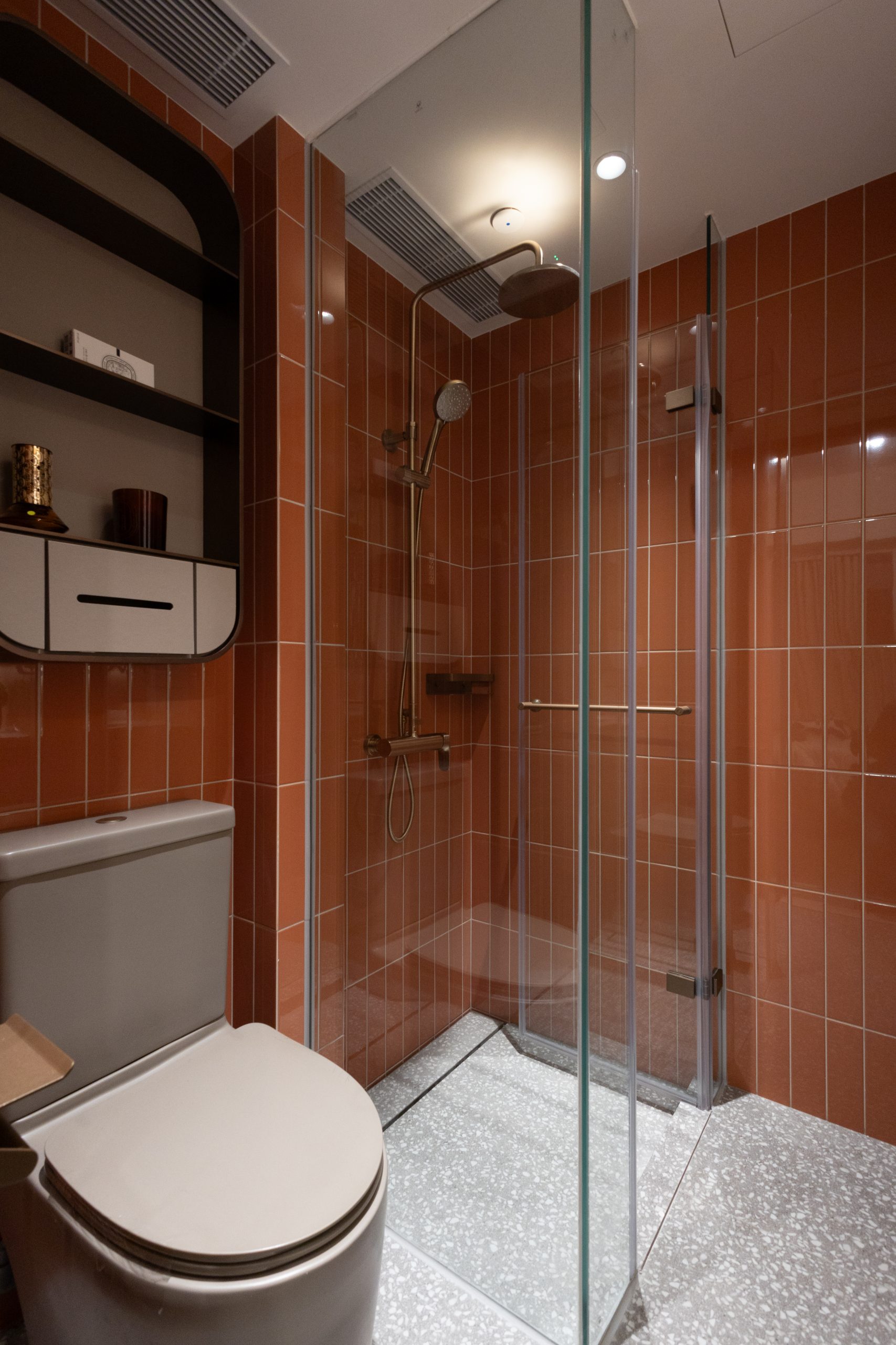 浴室配備擁有註冊認證的多功能洗乾組合LAUNDRY+,下半部備有洗衣機,上半部設衣物掛架,結合浴室寶,實現一站式衣物處理。浴室設有多用途鏡櫃STATE MIRROR,可以放置風筒及小型家電,雙插座設計同時兼備USB和USB-C插頭;STATE MIRROR提供大量儲物空間,方便住戶收納浴室用品,鏡面周圍設有LED燈以提供更佳照明效果,方便化妝整理儀容。浴室精心搜羅多款知名品牌用具,包括KOHLER特別調製的茄士咩色坐廁及面盆,搭配橙色系瓷磚,以及KOHLER淋浴設備,將皇都的優雅格調完美融入。