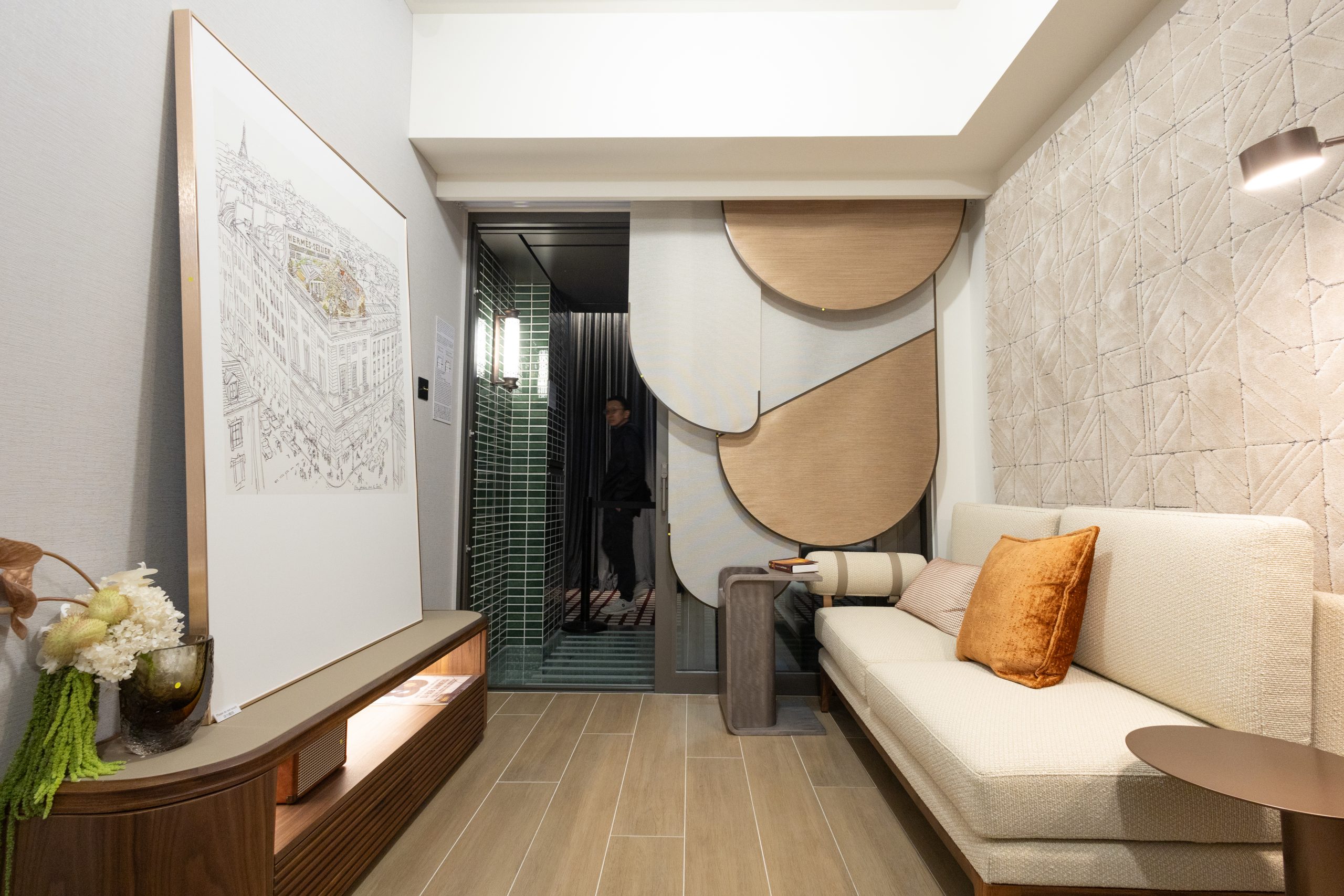 客廳梳化背後的牆壁,掛起一幅出自歐洲著名藝術家手筆的獨特地毯,充滿藝術感的幾何線條設計。窗簾採用創新時尚設計,兼具藝術感及易於打理特性,讓住戶即使安坐家中,都能感受到如同置身藝術畫廊般優雅氛圍。