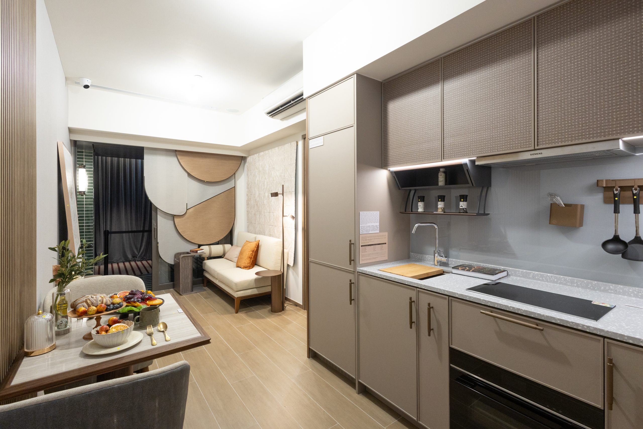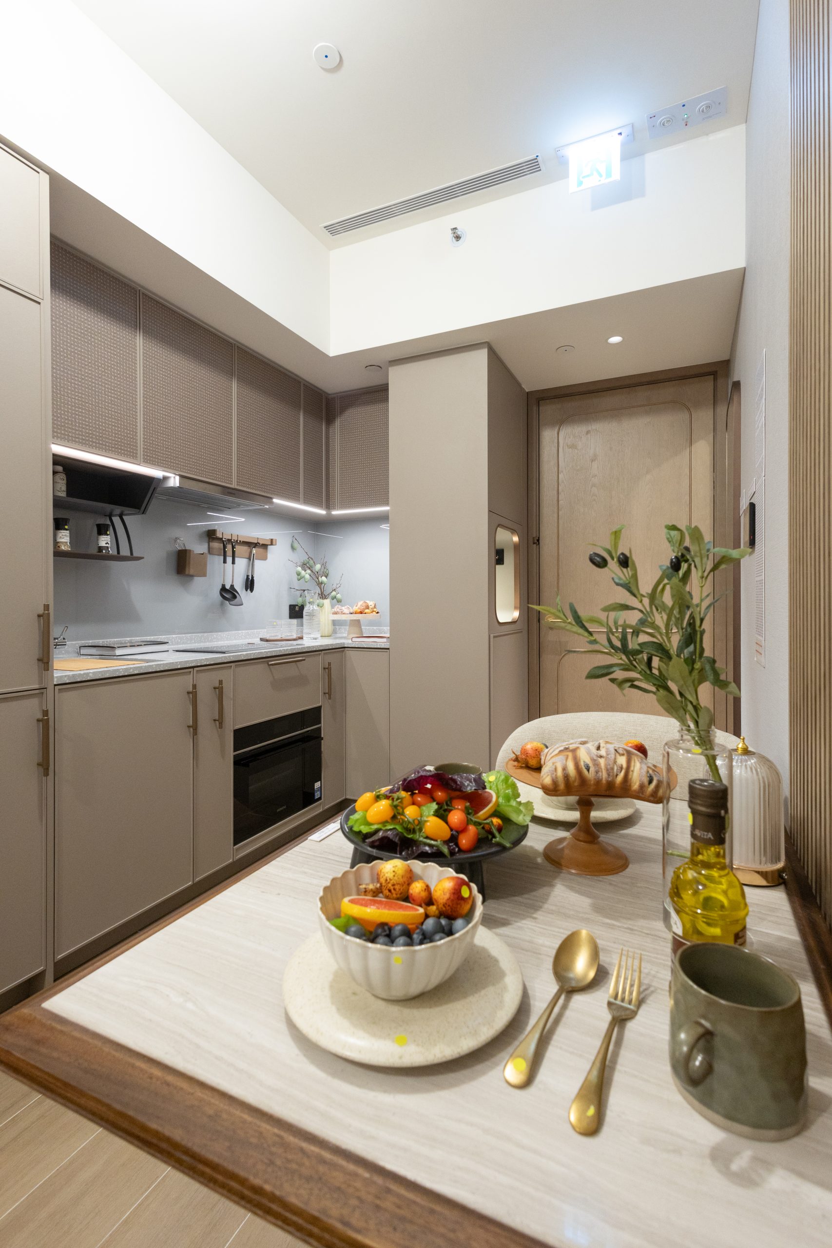 開放式廚房配備磁吸配件Kit Plus,住戶可以按照個人喜好習慣,整齊收納廚具等。Pull-Down Tray下拉式儲物設計,幫助靈活運用儲存空間。開放式廚房備有歐洲名牌家電,包括西門子電磁爐、抽油煙機、嵌入式蒸焗爐及嵌入式雪櫃等。露台及工作平台配備壁燈STATE HOUSELIGHT,採用皇都特有的圖案設計,彰顯昔日小上海的獨特魅力,將格調延伸至室外空間。