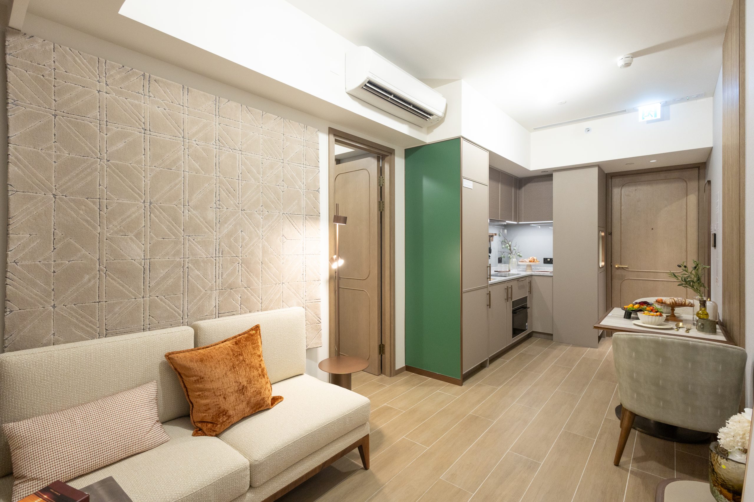 新世界發展旗下北角新盤「皇都」今日(12日)開放全新連裝修示範單位予傳媒參觀,單位為18樓B8室,實用面積351方呎,一房間隔,以溫暖木系色調為主調,優雅的設計同實用性巧妙融合,客廳間隔分明。