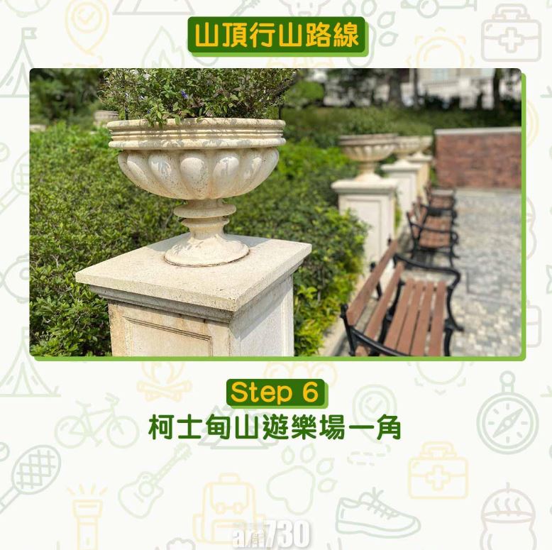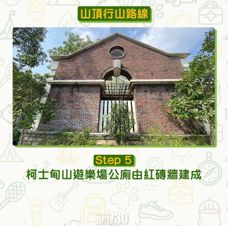 由山頂凌霄閣起步,柯士甸山遊樂場及山頂公園均適合野餐、拍攝Pre wedding、畢業相、小朋友放電、放狗、賞花等。來回腳程只需一小時,先遊覽香港法定古蹟舊總督山頂別墅守衛室,有空可登上扯旗山(Victoria Peak)配水庫,是選擇多又方便的行山路線。