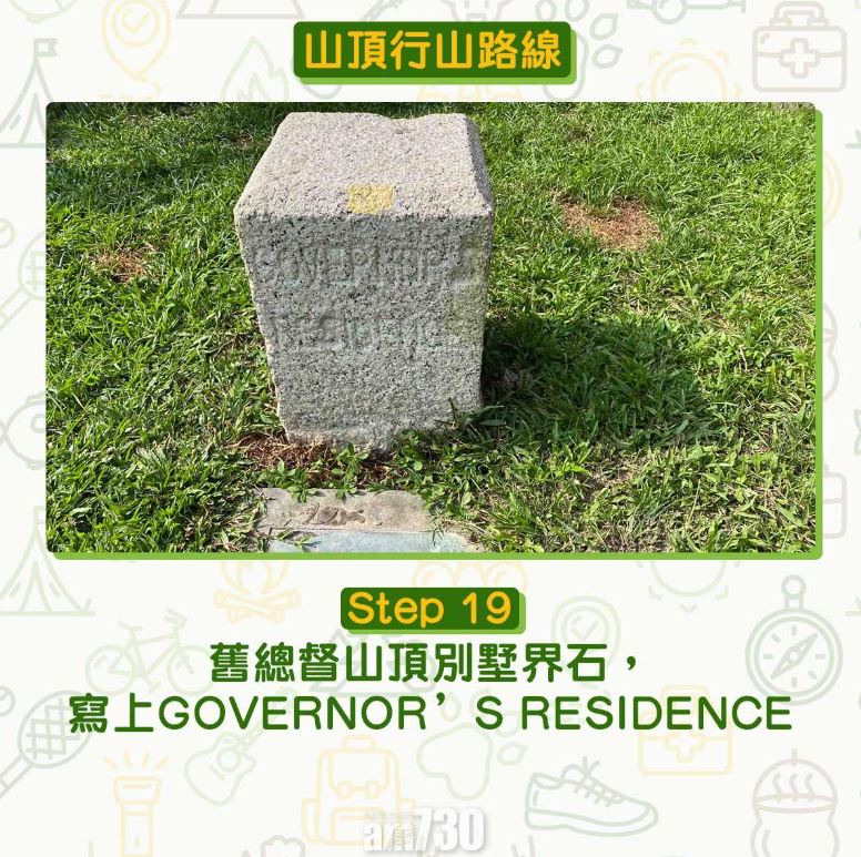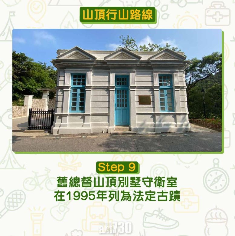 接回柯士甸山道,續向上行,於山頂花園、耕雲草廬等豪宅旁經過,於垃圾桶旁左轉上樓梯,多行5–10分鐘,先往左轉。白色小屋是舊總督山頂別墅守衛室。舊總督山頂別墅原是1862年設的英軍療養院,第6任港督麥當奴(Sir Richard Graves MacDonnell)在位購入療養院地皮,1900至1902年興建總督山頂別墅作避暑之用,為蘇格蘭大宅建築風格。詳情可參考香港行跡的文章舊總督山頂別墅地界及界石分佈圖。第二次世界大戰時,總督山頂別墅被日軍轟至損毀,至1946年拆卸,往後原址演變成山頂公園。現餘下文藝復興風格的守衛室,牆角呈圓角,頂部有多個三角形,精緻非常。