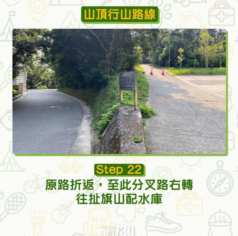 穿過停車場往上行,山頂公園有一個白色涼亭,正是前港督別墅位置。設小食亭。涼亭主要景色為薄扶林水塘、南丫島、東博寮海峽、西高山等。休息和打卡過後,最快捷方法是原路折返。回到分叉路的路牌寫上「山頂花園」,有興趣和時間往右面登上扯旗山。分叉路右轉,幾分鐘後的草地為扯旗山配水庫,秋冬時芒草處處。配水庫沿雷達塔外欄杆邊行,可到扯旗山舊三角測量站,景色為會展一帶的維多利亞港。太平山的官方名字是扯旗山,又名硬頭山、爐峰、柯士甸山、屬領山、域多利山、扯旗山高552米為香港島最高點。而山頂(The Peak)泛指太平山、奇力山、歌賦山一帶。