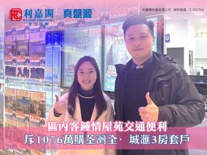 李氏表示,新買家為區內客,經利嘉閣真盤源平台覓得上址放盤,即聯絡代理睇樓。客人認為單位間隔實用,享優美海景,加上鄰近港鐵荃灣西站,交通便利,即決定洽購。業主原開價1,150萬元,最終以1,076萬元合理價易手,折合實用面積呎價約12,825元。